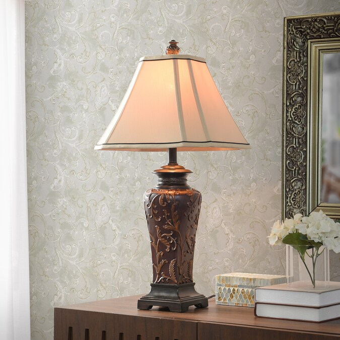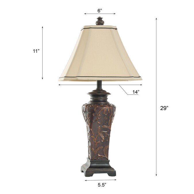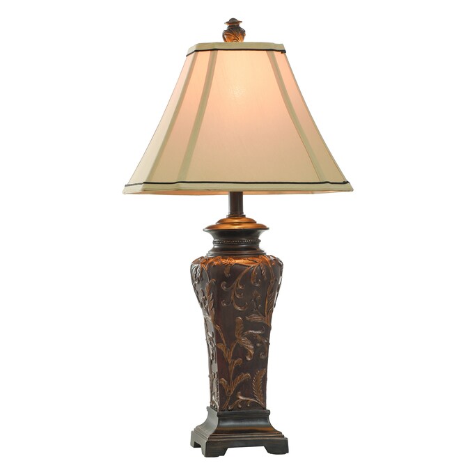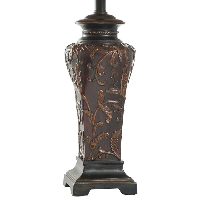 Featuring vivid colors and intricate designs, this table lamp is a bright addition to a bedroom, office, or hallway. The frame has a crimson finish that accentuates every aspect of its ornate design, and the cream fabric shade has dark accent lines around the top and bottom. Display this striking crimson lamp on a dining room buffet or a living room end table.
