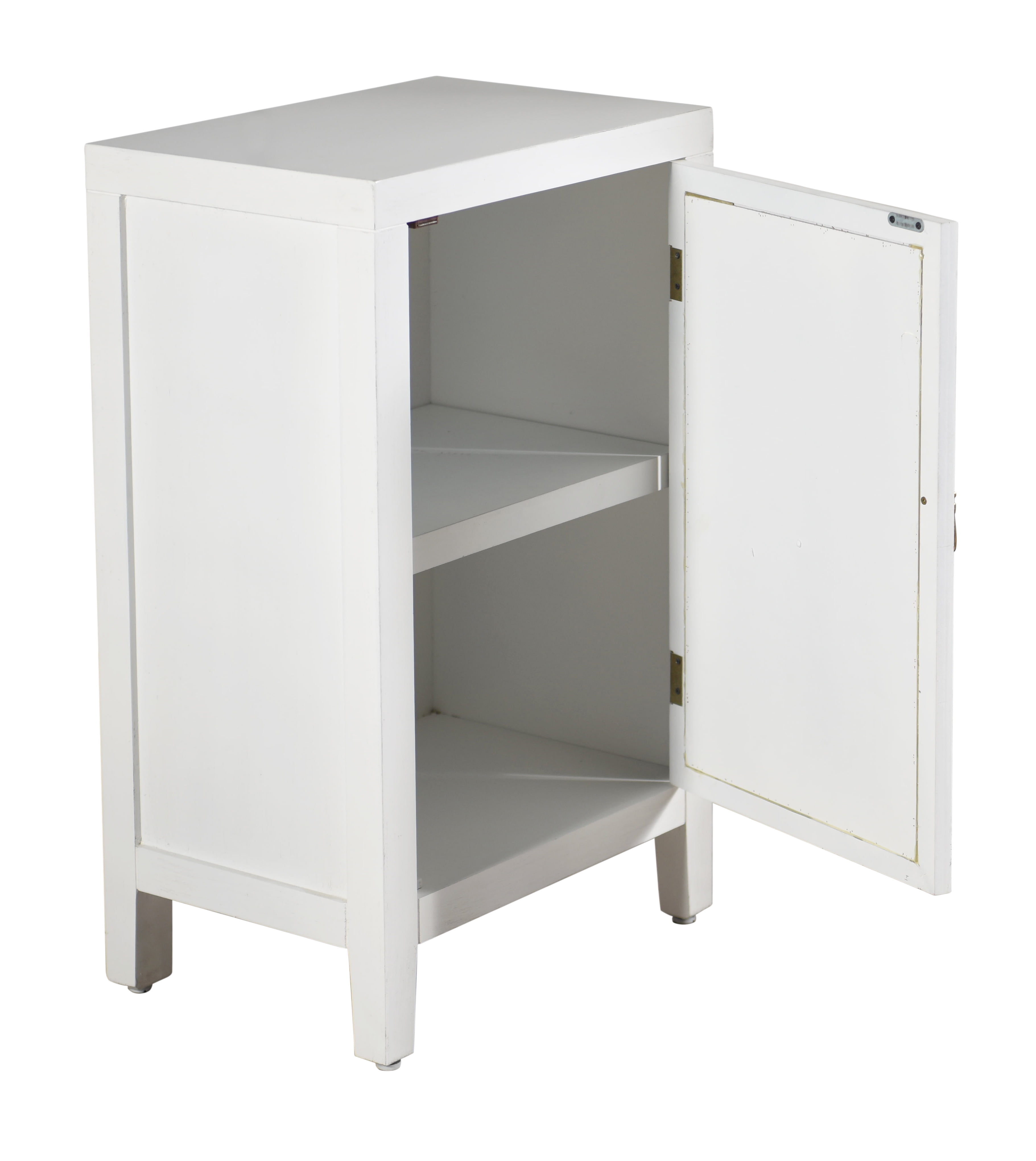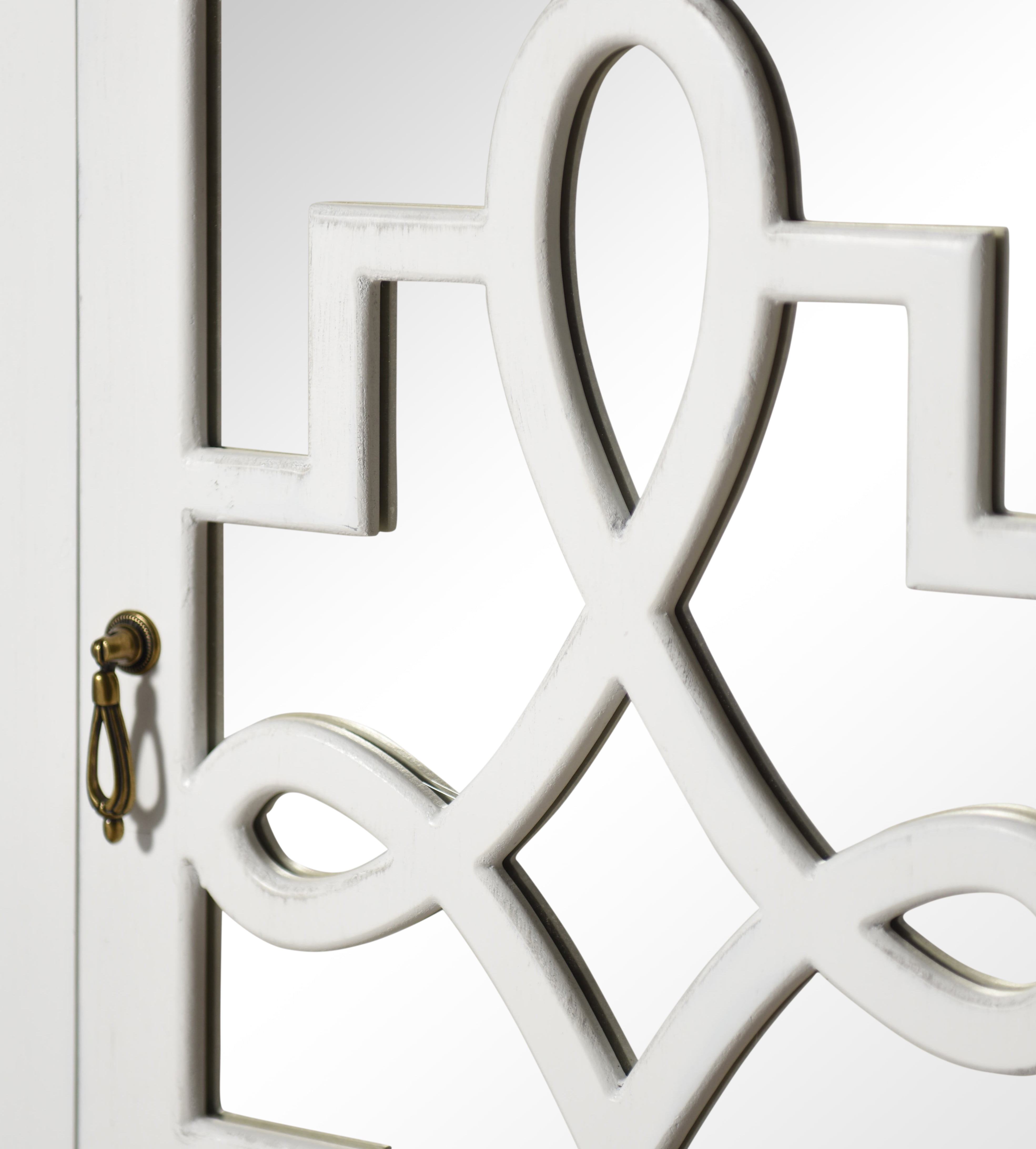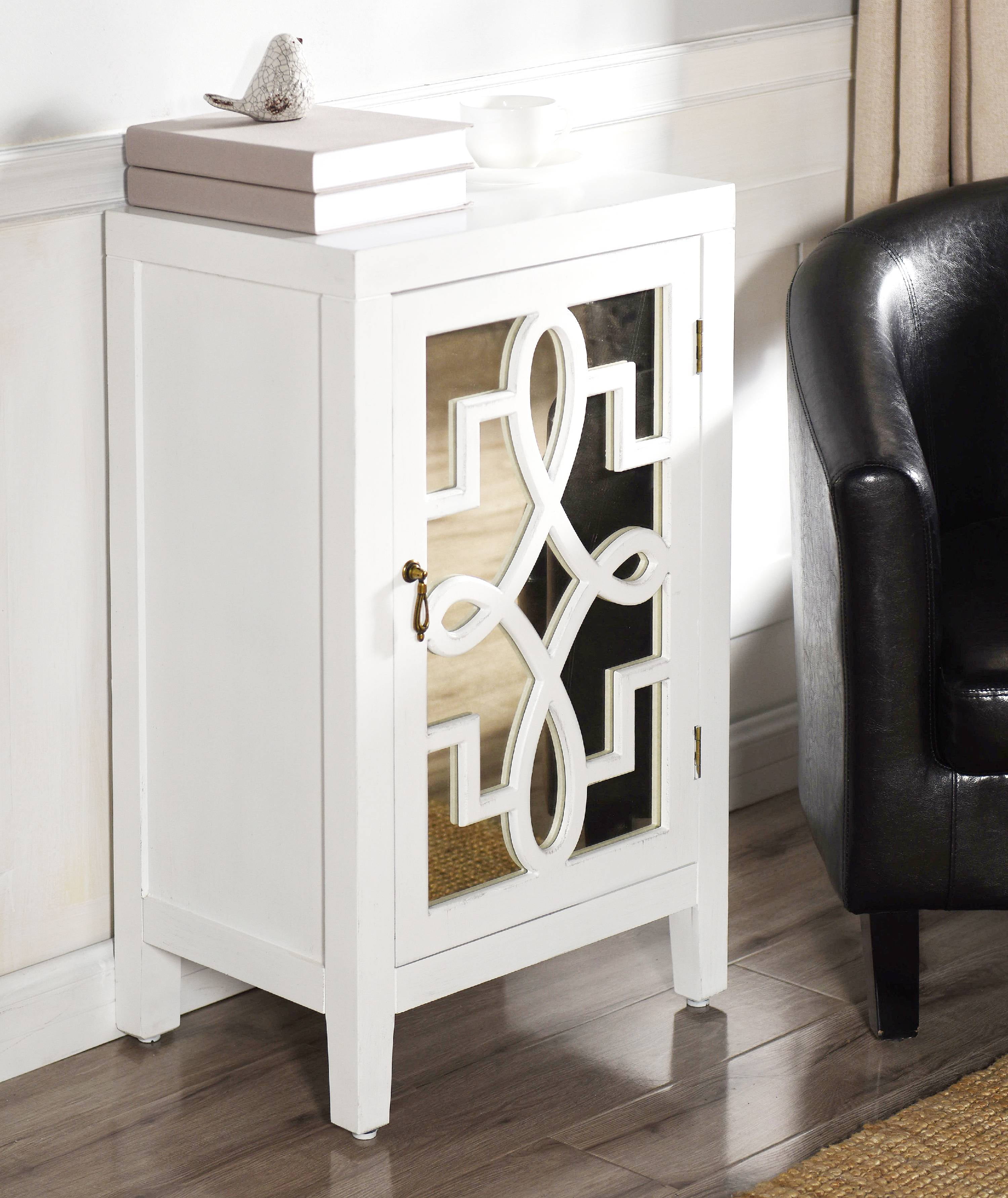 18-inch wide contemporary nightstand adds an elegant charm to your bedroom while also providing discreet storage and functionality Nightstand has a built-in cabinet with a spacious shelving unit for you to discreetly store your belongings out of sight Cabinet door is designed with a mirrored surface and an eye-catching lattice scroll design that instantly elevates the look of your bedroom Nightstand surface is 18 inches wide, allowing you to keep all of your essentials right at your bedside Nightstand’s feet are fashioned with pads to protect against scratches and damage to floors Material: Wood, Glass Color: White Dimensions (L x W x H): 13 x 18 x 32 inches Weight: 26.99 inches