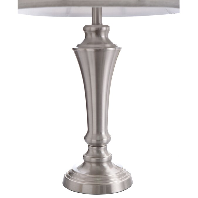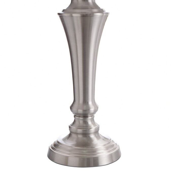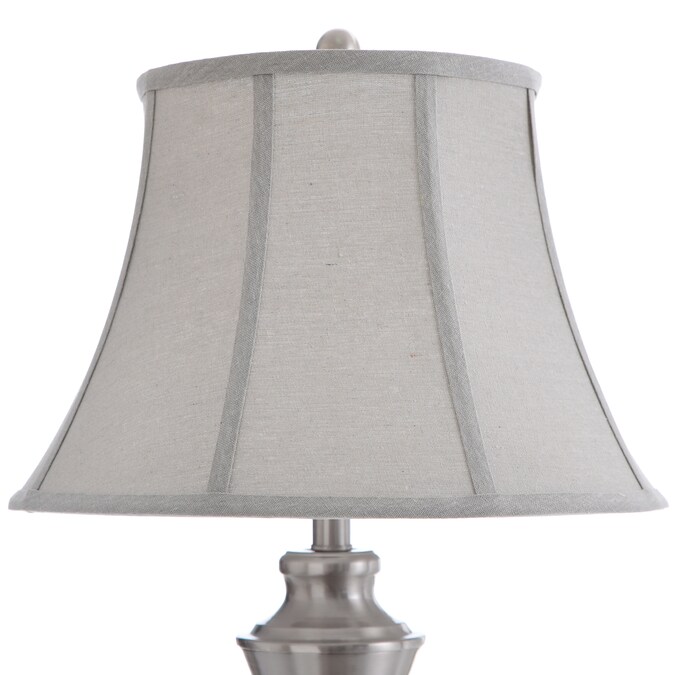 - Brushed nickel finish touches with Geneva taupe fabric shades