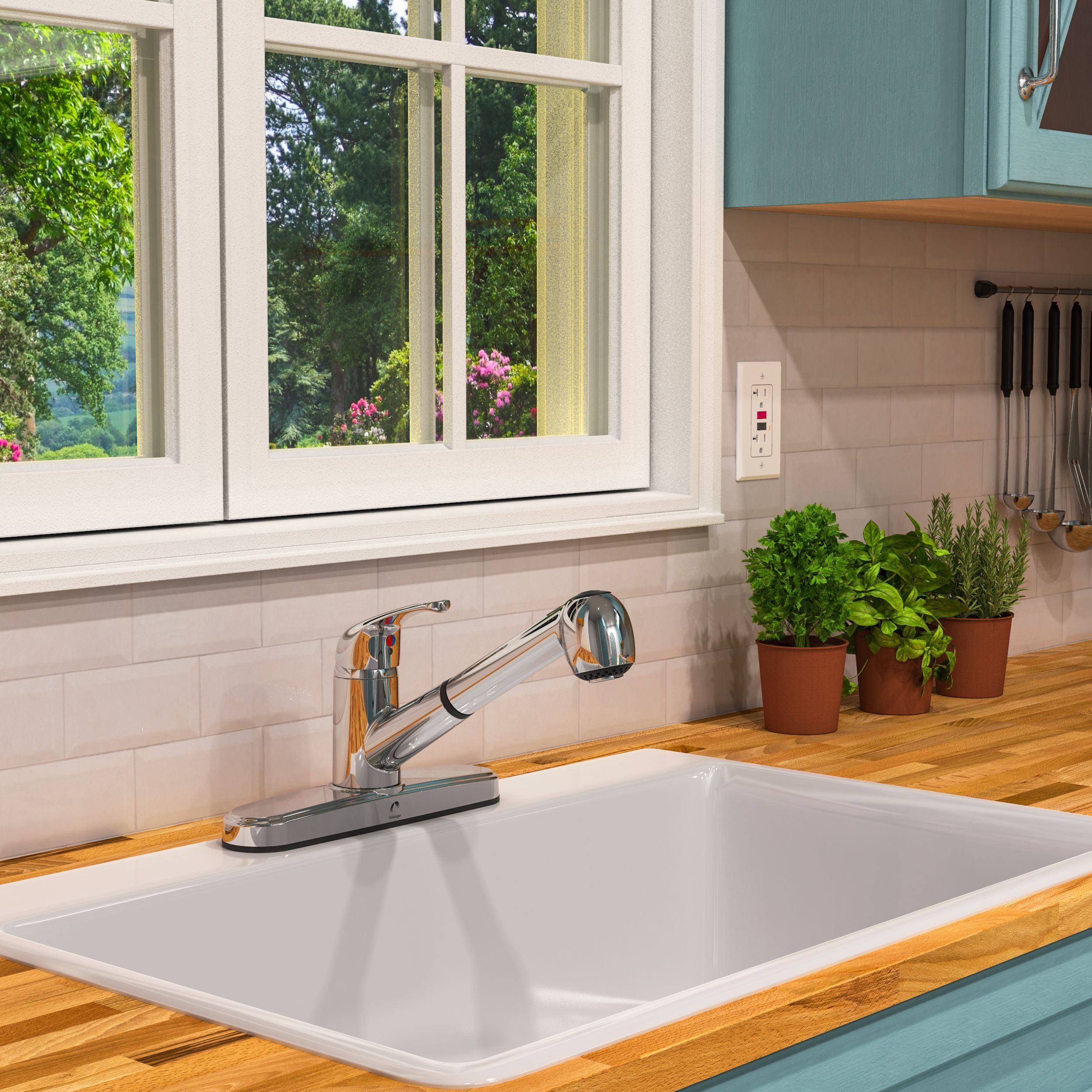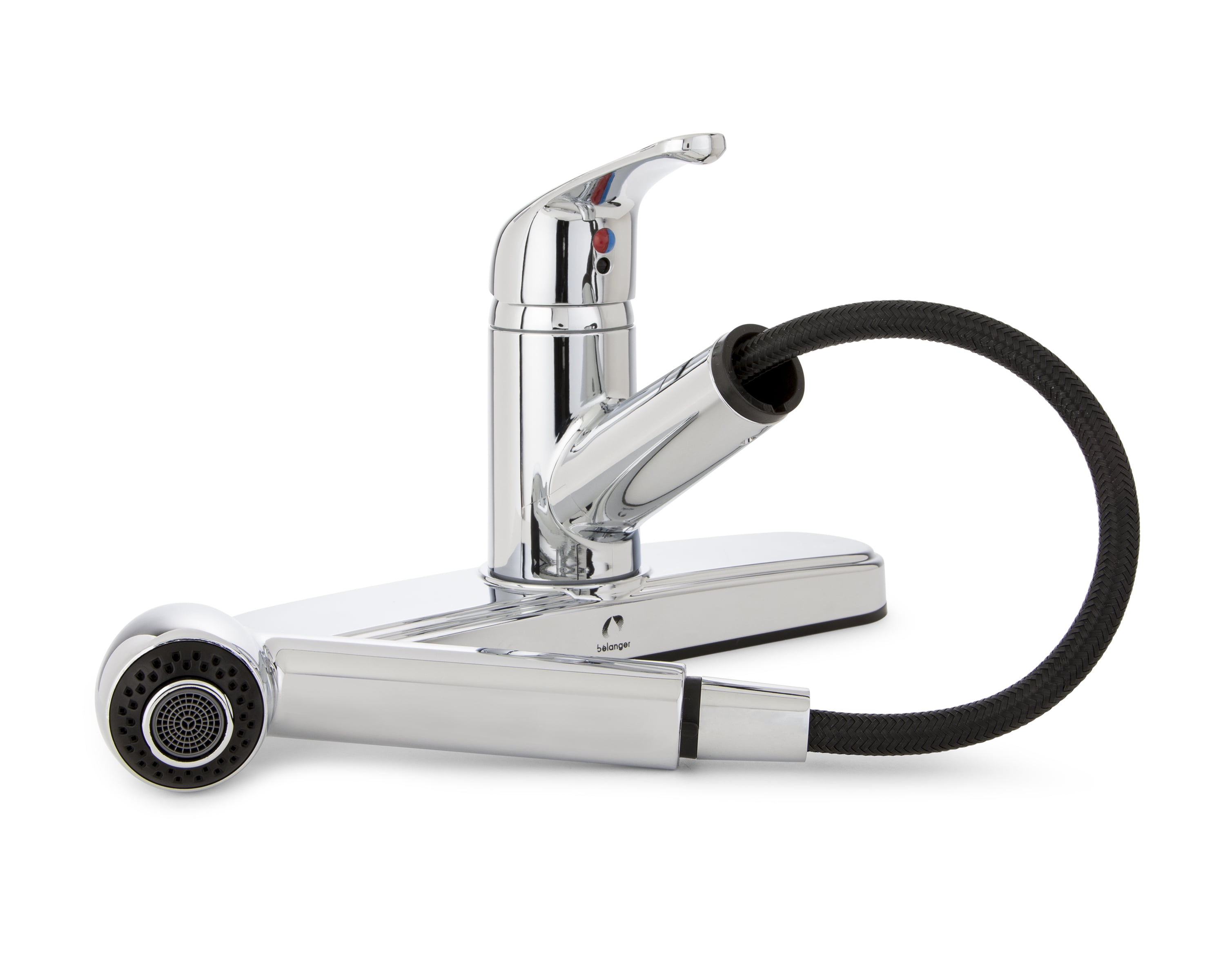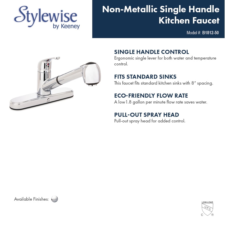 Upgrade your kitchen sink with the functionality and modern style of Stylewise by Keeney’s Single Handle Kitchen Faucet. This pull-out kitchen faucet featuring an 8″ centerset is designed for standard pre-drilled kitchen sinks with 8″ spacing and is a great fit for any home, rental property, apartment, RV, camper, or business where an affordable faucet with a stylish look is needed. The 7″ pull-out spout reach provides the flexibility you need for cleaning pots and pans or hard-to-reach areas of the sink, and the pull-out spray head features a push-button diverter for a stream or spray jet selection. The single lever control is ergonomically designed for easy water temperature and volume control, and the eco-friendly 1.8 GPM flow rate meets most green building standards. Constructed from premium grade, non-metallic materials with a polished chrome finish, this ADA and cUPC Low Lead compliant faucet withstands years of quality use, and it features a fast and easy 3-hole installation. You can install with confidence knowing Belanger products are backed by a Limited Lifetime Warranty.