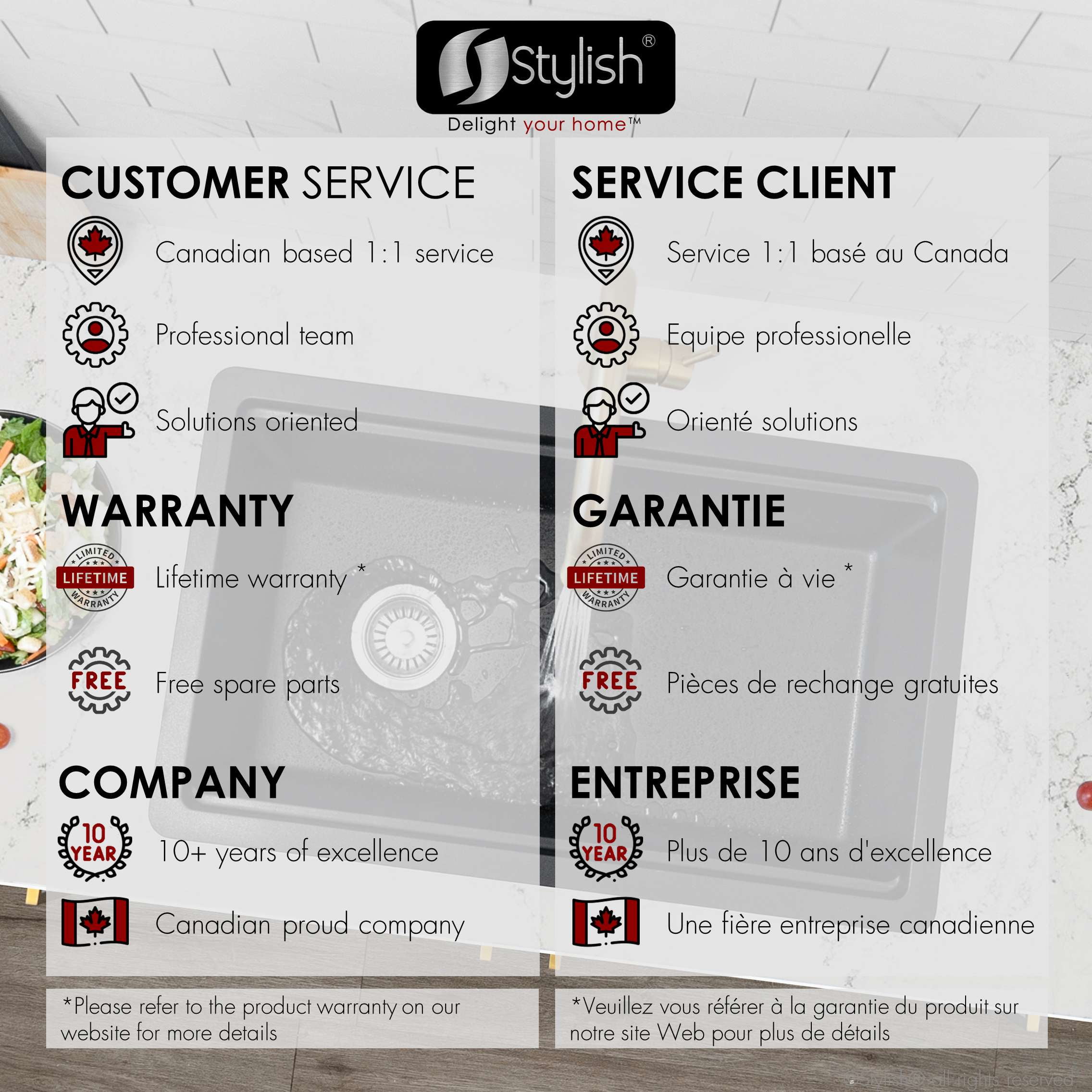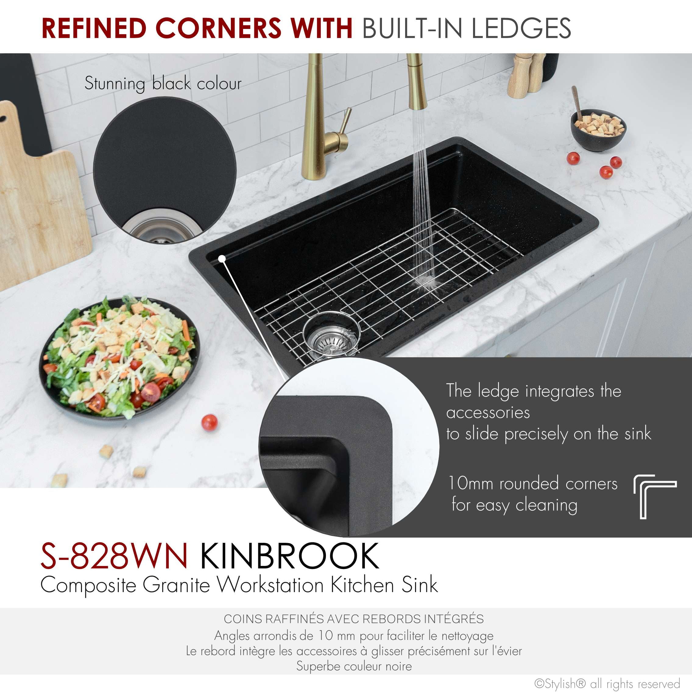 WORK DIRECTLY OVER THE SINK: This composite granite kitchen sink comes with great accessories that slide across the built-in ledge, saving space on the kitchen countertop, helping you use your space to the fullest. NATURAL QUARTZ AND LOW MAINTENANCE: Made from 80% Quartz and 20% Acrylic Resin, this special hardened composite is highly stain, scratch, heat and dent resistant, and is also extremely easy to clean and maintain. QUIET SINK: The thick composite granite helps to eliminate vibration and noise when sink is in use, ensuring that turning on your faucet won’t ever be anything less than enjoyable. CUTTING EDGE DESIGN: Pietra series sinks are designed to have a perfect balance for functionality and space, with elegant and smooth tight radius corners for easy cleaning as well as bold looks and a perfect slope to make water drain fast. THREE COLORS: Choose between black, gray or white. Whichever you choose, we can promise non-fading and uniform color will last a lifetime, with the look and feel of real stone. BEAUTY AND STRENTGH: Clean lines, simple shapes and small corners define this stunning composite granite sink, which combined with the vivid colors and stone appearance offer an amazing addition to your kitchen. DUAL MOUNT INSTALLATION: This sink can be installed as either undermount or drop-in, with smooth and flat flange for easy installation. REVERSIBLE INSTALLATION DESIGN: Designed with the ability to flip the sink around to switch whether the drain is on the left or right, giving you the freedom to choose whatever is convenient for your plumbing. SIDE CENTRE DRAIN: Allows for easy draining and more space inside the sink and under the kitchen cabinet. DEEP BOWL: A 9.5-inch-deep bowl allows to accommodate large pot and pans and prevent splashing. STANDARD STRAINER INCLUDED: allows water to pass through but also allows small food waste to be collected and thrown away, it will perfectly fit any sink with a 3.5” opening, which is industry standard. GARBAGE DISPOSAL: Stylish kitchen sinks come with the standard drain opening of 3.5” diameter that can fit any garbage disposal unit. Due to sink and garburator weight, we recommend adding two shelf “L” brackets, 14 inches long, under the sink bowl. PERFECT FIT ACCESSORIES: Complement the style and functionality of your sink with our accessories, designed to perfectly fit your single bowl dual mount composite granite sink while offering great convenience. The sink includes these high-quality accessories: ST-01 Stainless steel strainer A-04 Metal colander A-914BK roll-up drying rack A-909 Bamboo cutting board.
