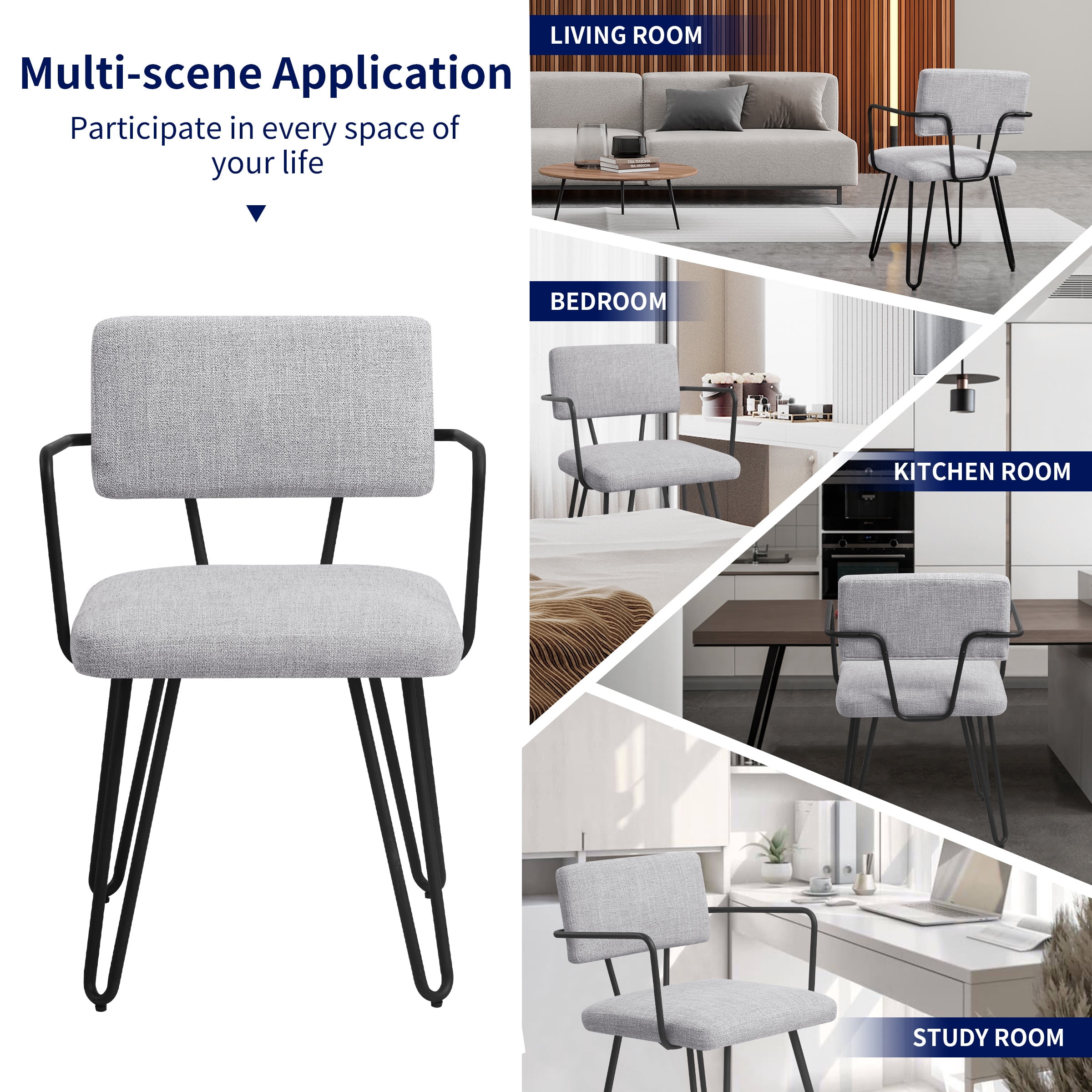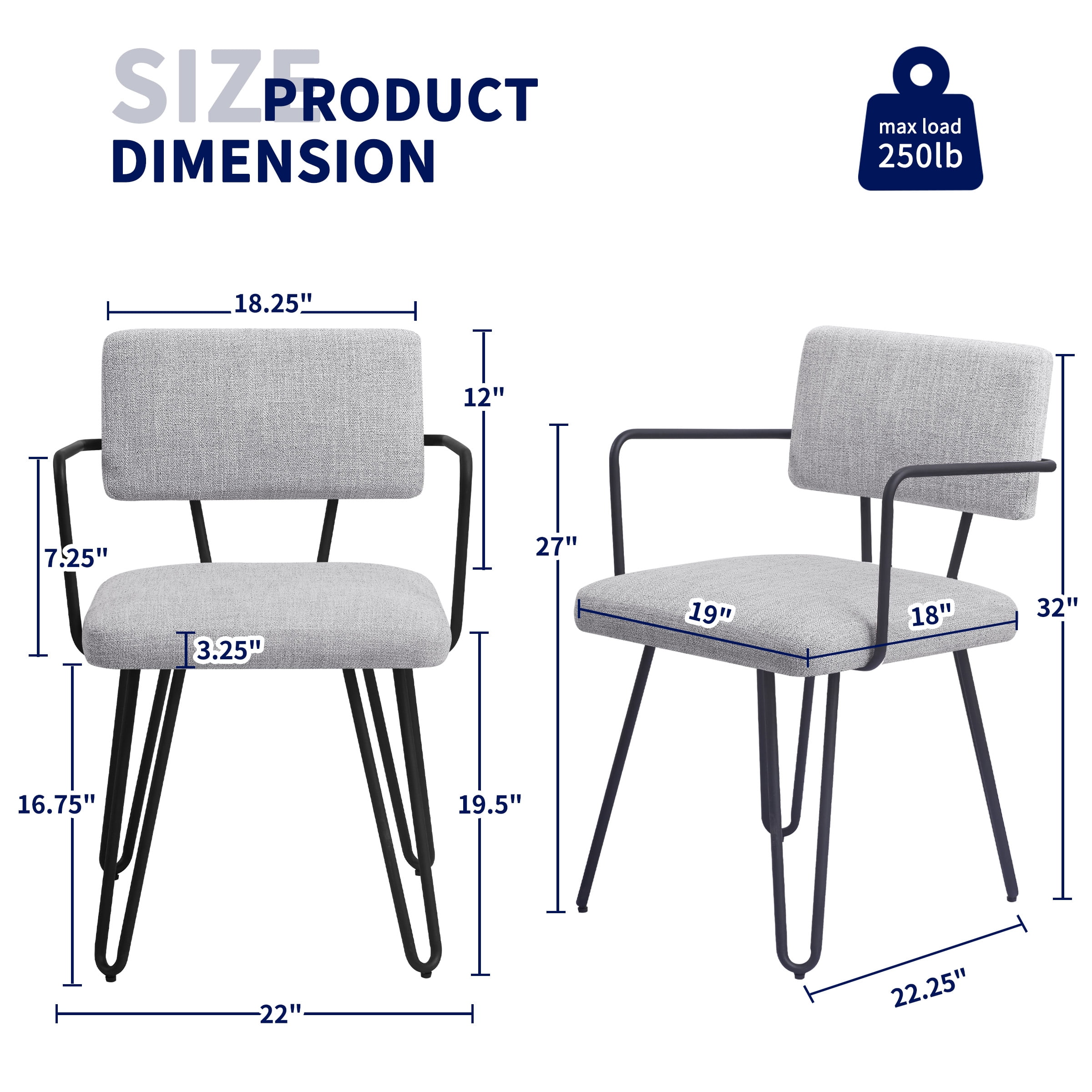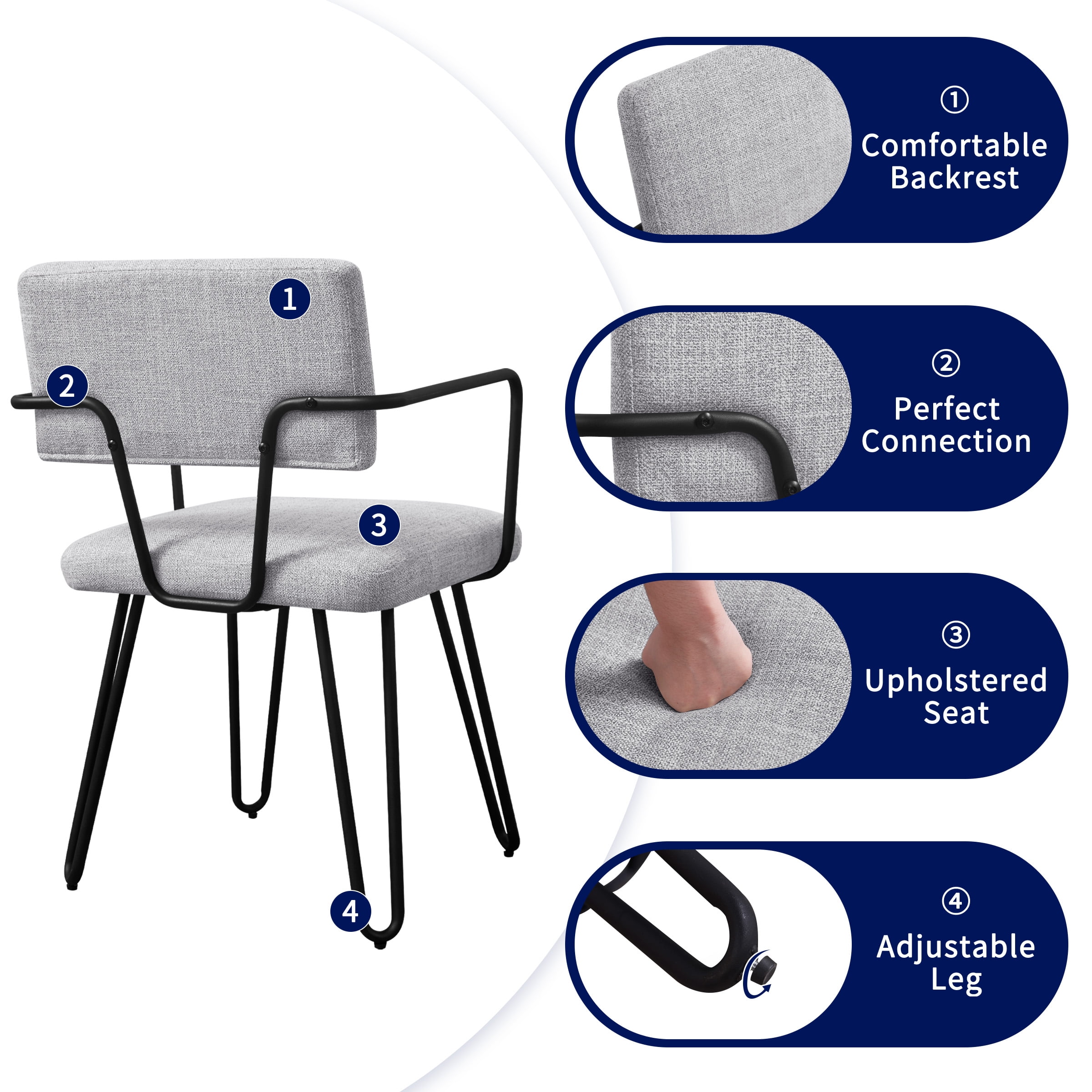 Key Features: Comfortable Sitting: The dining chair is designed with upholstered seat, providing a comfortable sitting experience. And the cushion is filled with high-density sponge and covered by breathable linen fabric, bringing ultimate comfort. Stable & Sturdy Structure: The frame of this dining chair is made of premium iron, featuring a long service life and a maximum load capacity of 250 lbs. In addition, our dining chairs come with adjustable footpads. It can adapt to more dining tables while ensuring that the dining chairs remain stable on uneven floors, and footpads could also keep floor from scratching and prevent the harsh sound when moving. Ergonomic Design: The backrest of dining room chair is designed with artificial curvature, the upholstered dining chairs can perfectly fit your body curve for better relaxation while reducing pressure and fatigue from the back. Moreover, there also exist smooth iron armrests for resting arms. Specification: Color: Off-White, Gray Main Material: Iron, Sponge, Linen Fabric Type: Dining Chair; Dining Room Chairs; Iron Chairs; Metal Chairs Note: Set of 2 Dining Chairs, Arrives in 1 box
