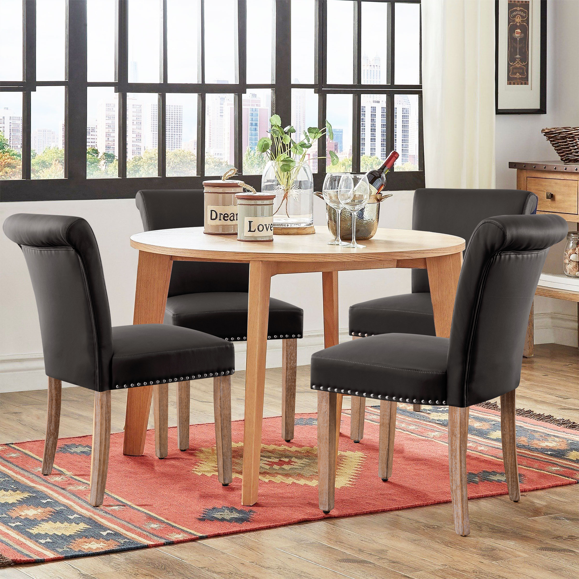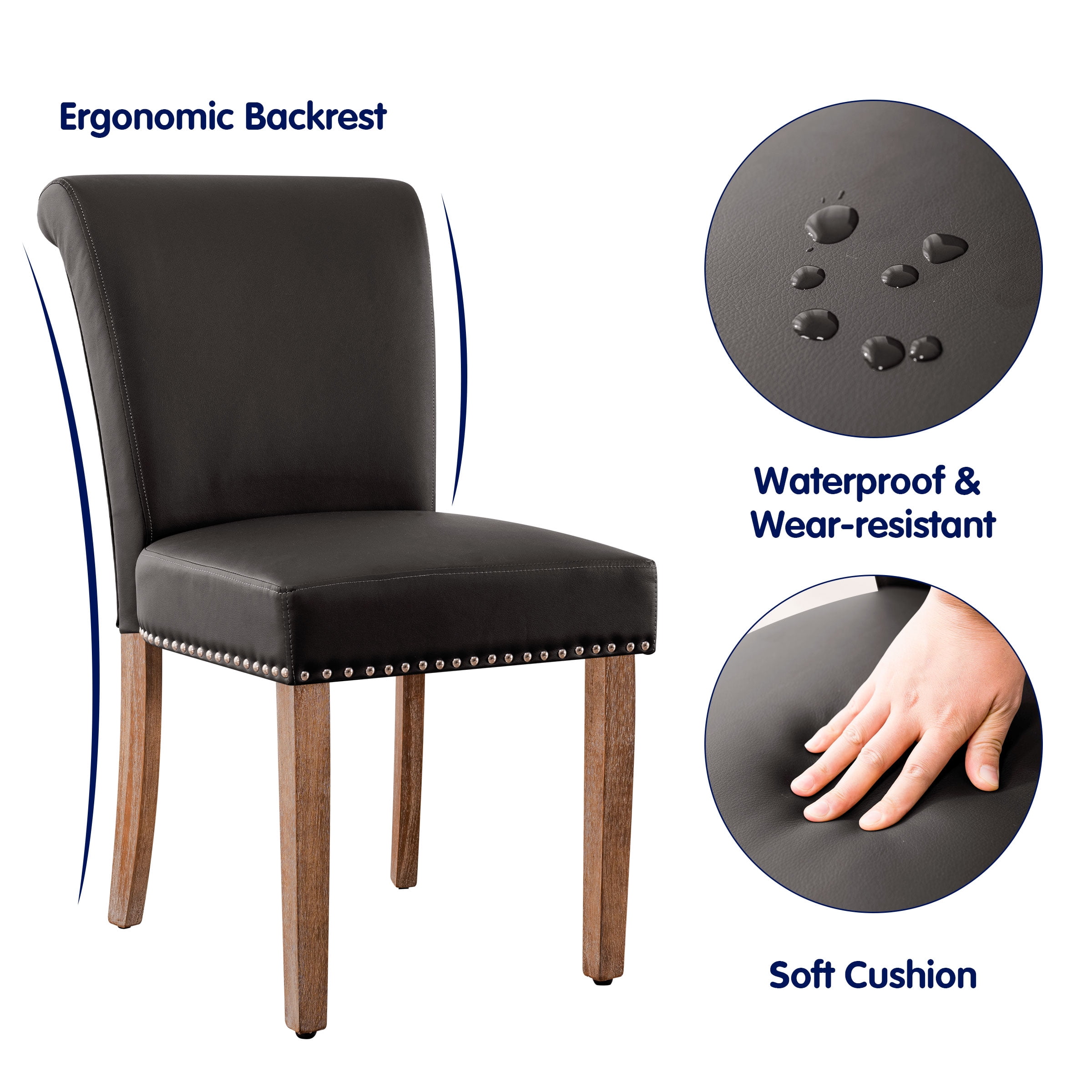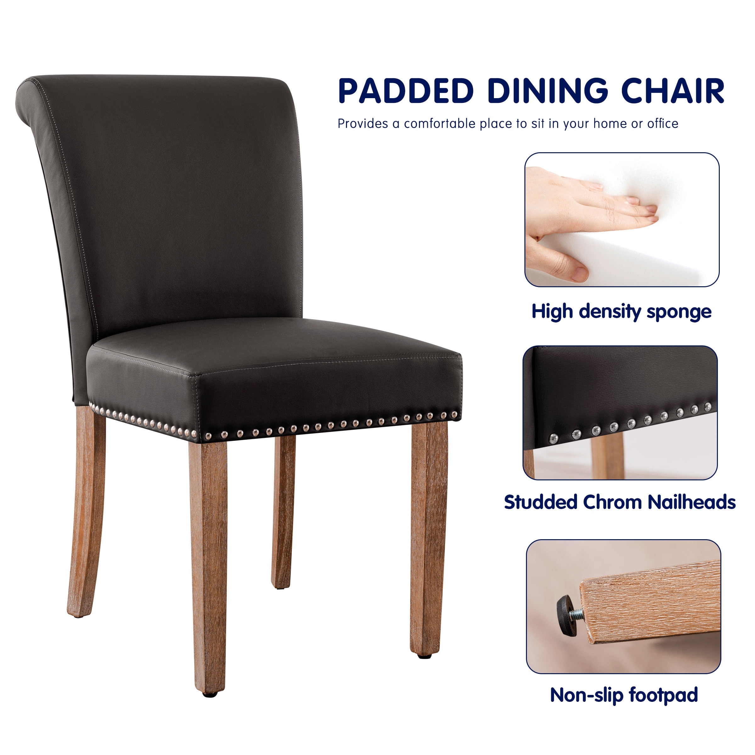 Our Leather Upholstered Dining Chair with Nailheads and Solid Wood Legsdining chair provides enough safety. High-quality PU leather, skin-friendly, easy to scrub and making for easy matching with existing decor. Besides, the seat and back are padded with high-density foam for a great comfortable feeling. Apart from daily use, it is also perfect for hotel, wedding banquets, celebrations, and other ceremonial decorations.
