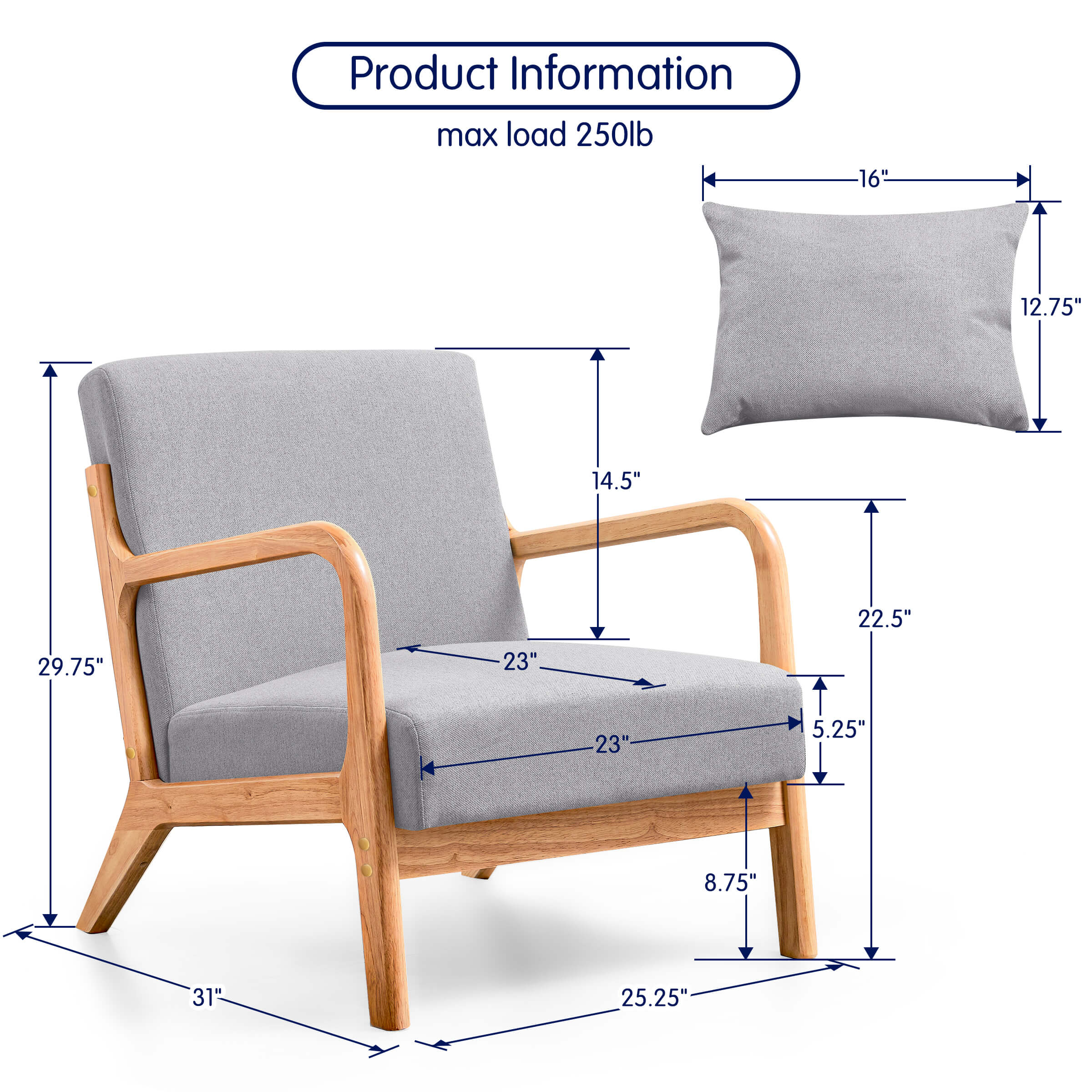 Key Features: Comfortable Seat: This accent chair is upholstered with soft seat and backrests cushions which are filled with high-density sponge and covered with breathable linen fabric, allowing you to sit more comfortably. The extra pillow with high quality padding, soft but supportive. Sturdy & Durable Structure: Supported by solid wood frame, our accent chair is stable and strong enough to stand a weight of 250 lbs. In addition, our chairs come with footpads, which could also keep floor from scratching and prevent the harsh sound when moving. Ergonomic Design: The upholstered accent chairs can perfectly fit your body curve for better relaxation while reducing pressure and fatigue from the back. Multi-scene Application: Our accent chair is perfect for your modern or contemporary home. It works well in the living room, bedroom, office, study room or other space you like. Specification: Color: Beige, Gray Main Material: Solid Wood, Sponge, Linen Fabric Type: Accent Chair; Wood Chairs; Arm Chairs Note: Accent Chair X 1, Arrives in 1 box