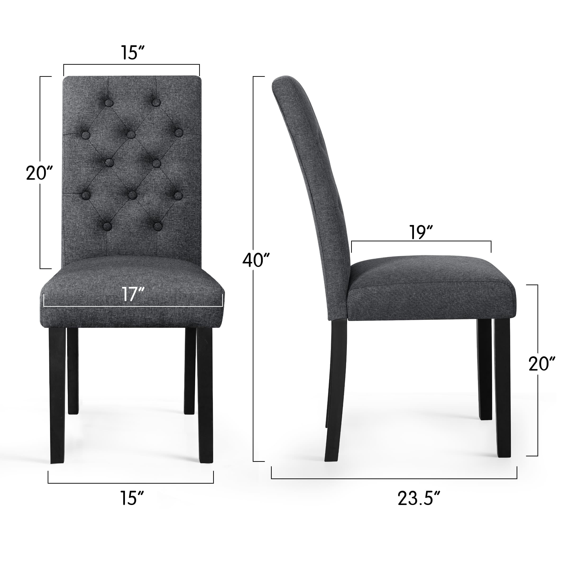 Features Material: The dining chairs filled with high density sponge which features excellent softness. The linen fabric is skin-friendly, odorless and breathable. Environmental friendly wood legs, it is durable and stable to bear weight up to 265 pounds. Ergonomically Designed High Backrest: The slightly curved high backrest is ergonomically designed to fit your body shape, effectively protect your waist and back, and relieve fatigue from prolonged sitting. Anti-Scratch Design: The lower part of the chair consists of four wood legs with pads at the bottom to prevent scratching the wood surface floor. Easy to Assemble: With installation instructions, quality hardware and installation tools, each chair can be installed in just few minutes. Widely Used: Simple and stylish design, perfect for your kitchen, dining room, restaurant, bistro, cafe and more. Specifications Available colors: Dark Grey, Ivory, Coffee Maximum capacity: 265 LBS Seating area dimensions: 17.25″W x 20″D Backrest dimensions: 17.25″W x 25.7″H Seat height: 13.25″H Overall dimension: 17.25″W x 20″D x 38.95″H Package dimensions: 40″L x 11.8″W x 18.5″H Weight: 33 LBS Note Arrives in 1 box