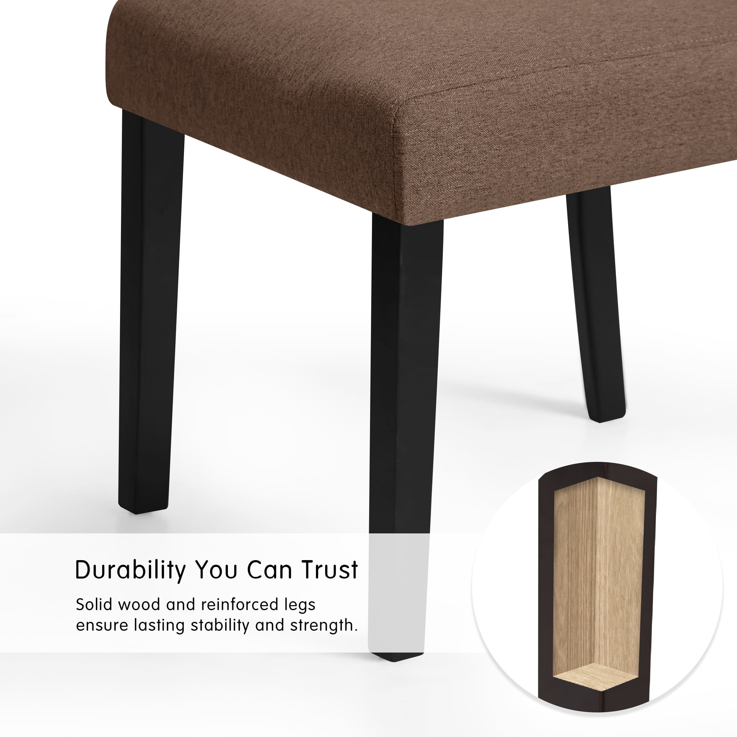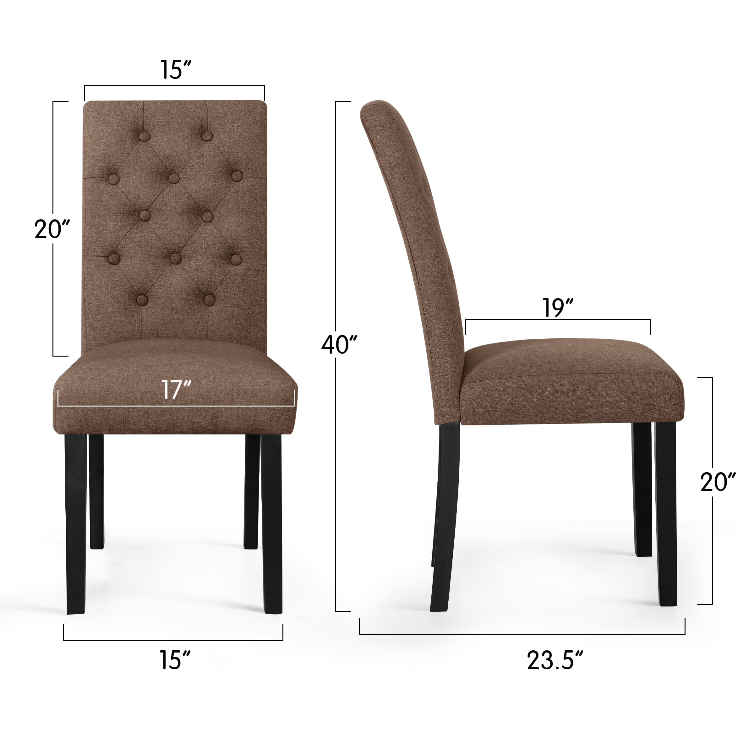Features Material: The dining chairs filled with high density sponge which features excellent softness. The linen fabric is skin-friendly, odorless and breathable. Environmental friendly wood legs, it is durable and stable to bear weight up to 265 pounds. Ergonomically Designed High Backrest: The slightly curved high backrest is ergonomically designed to fit your body shape, effectively protect your waist and back, and relieve fatigue from prolonged sitting. Anti-Scratch Design: The lower part of the chair consists of four wood legs with pads at the bottom to prevent scratching the wood surface floor. Easy to Assemble: With installation instructions, quality hardware and installation tools, each chair can be installed in just few minutes. Widely Used: Simple and stylish design, perfect for your kitchen, dining room, restaurant, bistro, cafe and more. Specifications Available colors: Dark Grey, Ivory, Coffee Maximum capacity: 265 LBS Seating area dimensions: 17.25″W x 20″D Backrest dimensions: 17.25″W x 25.7″H Seat height: 13.25″H Overall dimension: 17.25″W x 20″D x 38.95″H Package dimensions: 40″L x 11.8″W x 18.5″H Weight: 33 LBS Note Arrives in 2 boxes