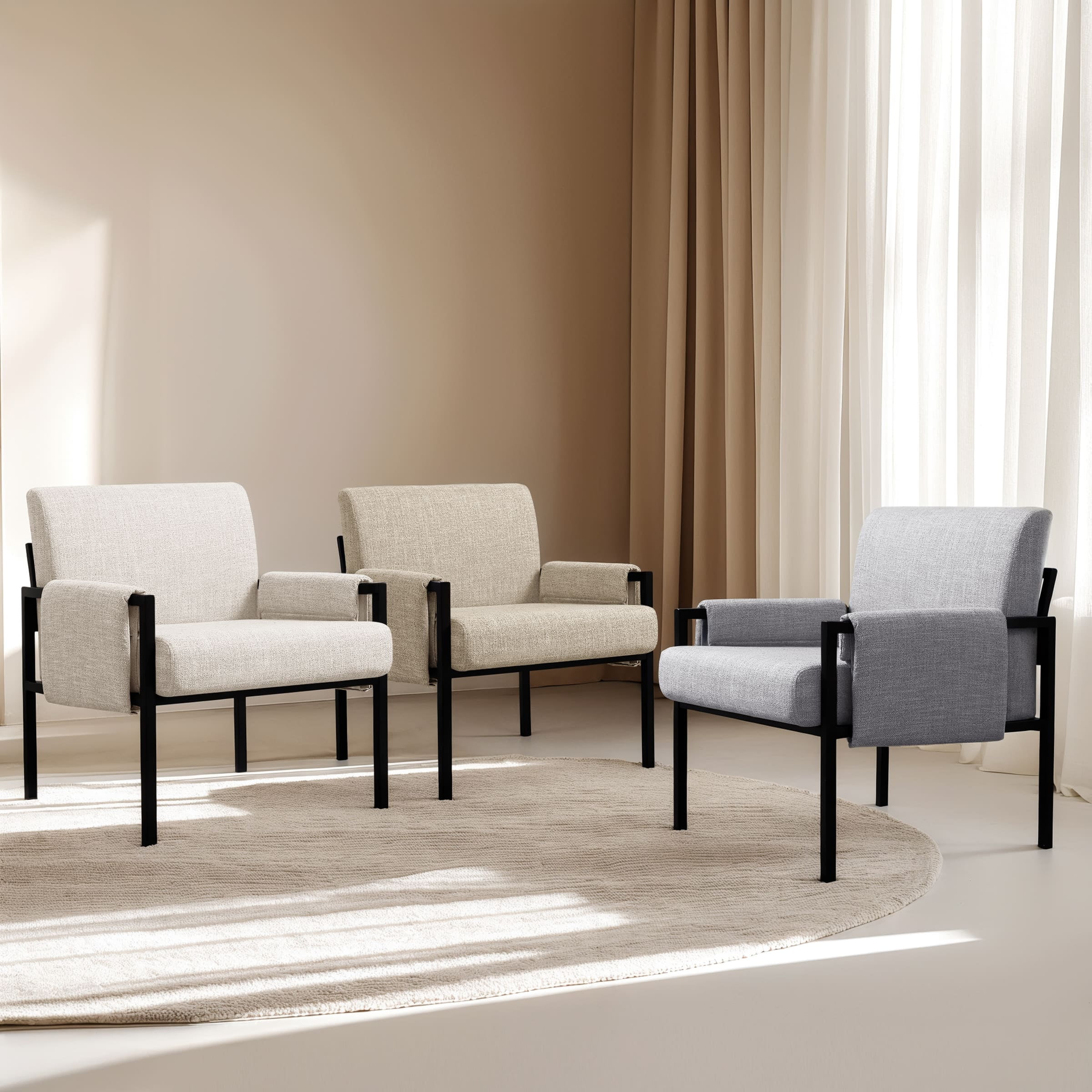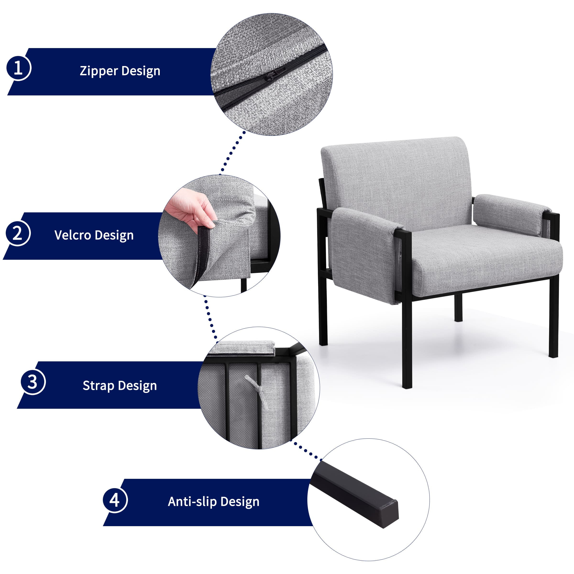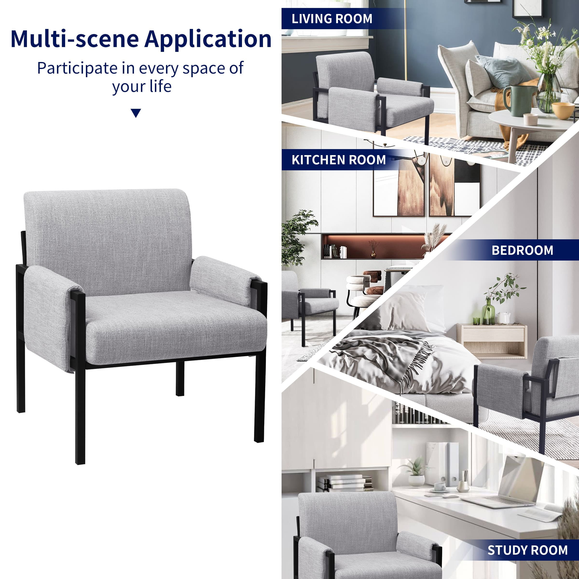 Key Features: Comfortable Seat: This accent chair is upholstered with soft cushions which are filled with high-density sponge and covered with breathable linen fabric, allowing you to sit more comfortably. Sturdy & Durable Structure: Supported by a sturdy metal leg frame, our accent chair is stable and strong enough to stand a weight of 250 lbs. In addition, our chairs come with footpads, which could also keep floor from scratching and prevent the harsh sound when moving. Ergonomic Design: The upholstered accent chairs can perfectly fit your body curve for better relaxation while reducing pressure and fatigue from the back. Multi-scene Application: Our accent chair is perfect for your modern or contemporary home. It works well in the living room, bedroom, office, study room or other space you like. Specification: Color: Off-White, Khaki, Gray Main Material: Iron, Sponge, Linen Fabric Type: Accent Chair; Iron Chairs; Metal Chairs Note: Accent Chair X 1, Arrives in 1 box