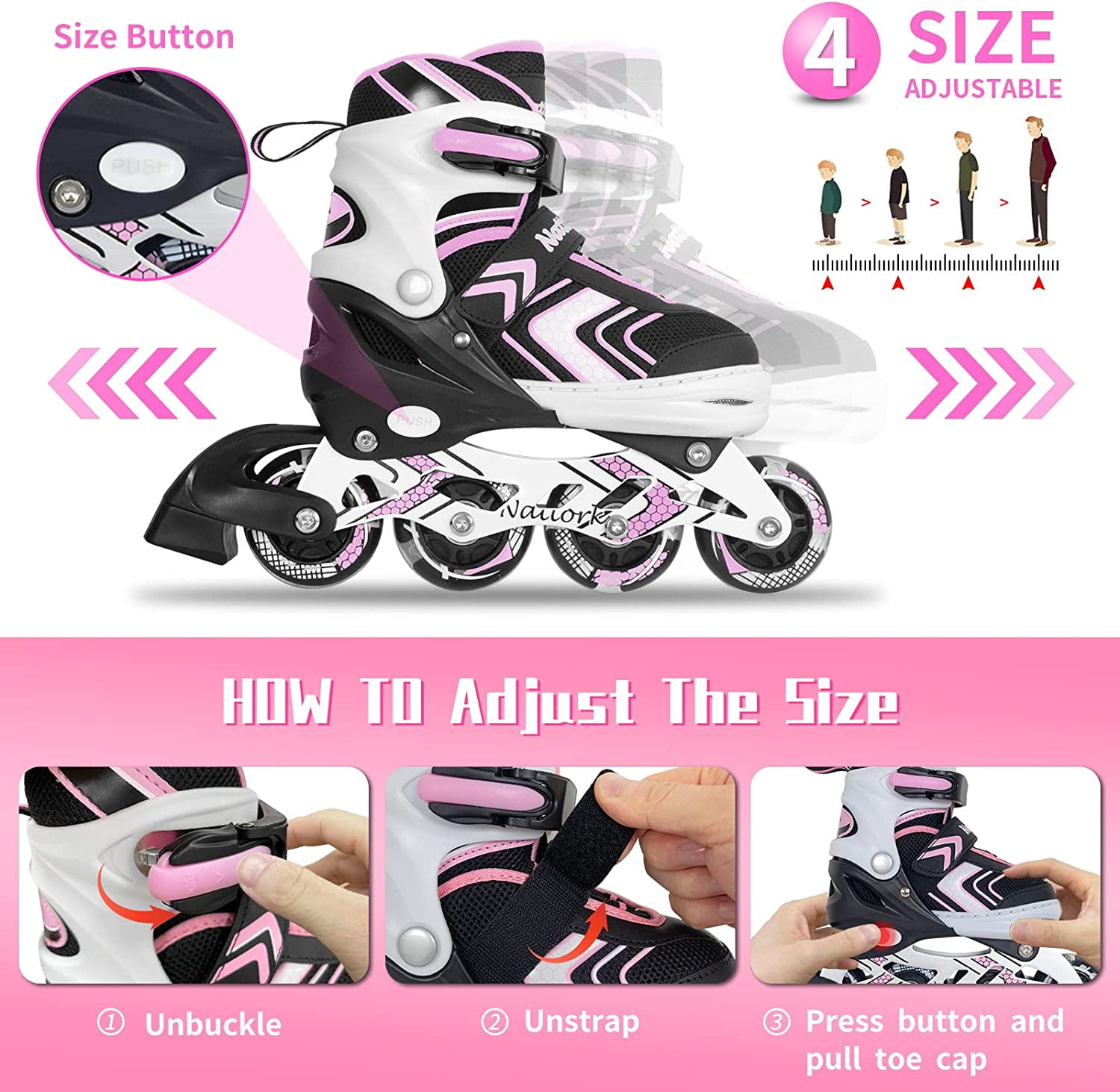 【ADJUSTABLE 4 SIZE】With the ease of size adjustment at the touch of a button, it’s easy for kids to put on/take off. These skates can grow with your child because the shoes can be adjusted to four sizes.SubSun inline skates are available in three sizes: S(11C-1 US)/ M(1.5-4.5 US)/ L(5-8 US), please check our size chart for the specific length of the shoes. 【8 WHEELS ILLUMINATING】Our inline skates for kids come with eight illuminating wheels that lights up automatically when you start to skate. The lights are powered by wheels rolling and never need replacement batteries! Just imagine how cool it will be to flash as bright as a lighting bolt in the dark! (Tips: Please check and tight wheels regularly to prevent them falling off) 【ADVANCED CONFIGURATION】Inline skating with excellent stitching and high quality fabric inside, feel your feet are wrapped in soft fabric. The skates use 82A PU smooth wheels with ABEC-7 bearings. Soft lining provides good sweat absorption, extra padding in the front prevents your child’s toes from hurting. 【TRIPLE PROTECTION】Our skates also designed with 3 protective layers: Durable fixing buckle, wear-resistant hook & loop strap and strong shoelaces, they offering the strong supports for ankle. The single brake is equipped on right foot to prevent the danger of falling. 【IDEAL PRESENT】SubSun inline skates can be a perfect birthday/Christmas gift for your kids, grandchild or nieces and nephews. The kids will have a happy childhood and great toys. Affordable for beginners, we aim to provide a high quality experience.
