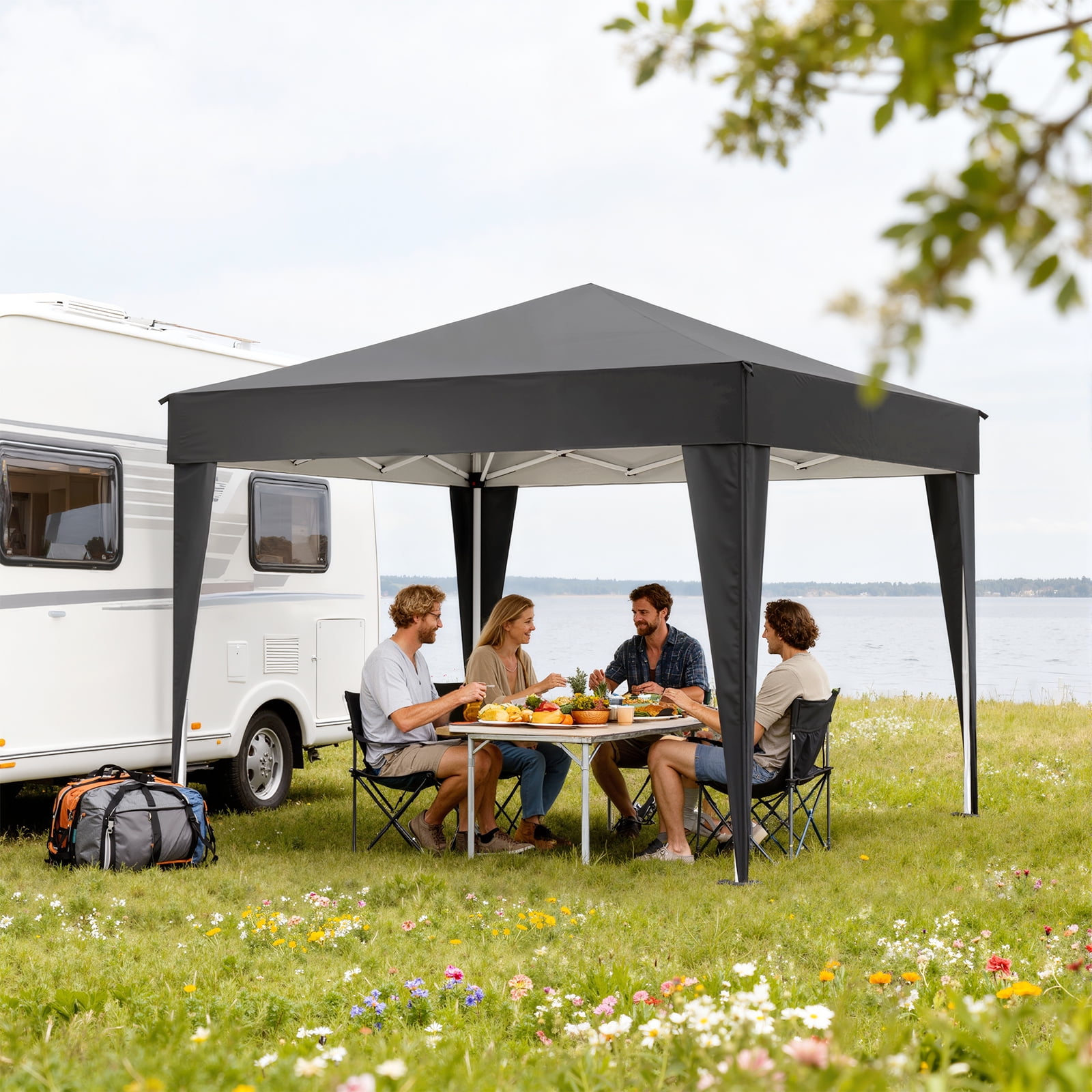 Easy one person setup with collapsible steel accordion frame Portable carrying bag included for convenient transport Superior quality with flame resistant 210D oxford fabric canopy top Water resistant and offers UPF 50+ UV sun protection Constructed with high-grade, powder-coated steel frame M5 hardened through-bold reinforced assembly for durability Adjustable height with three positions for versatile use Assembled size is 10’x10′, suitable for about 10 people Compact design fits into most car trunks for easy travel Ideal for outdoor events like tailgates, beach outings, and picnics
