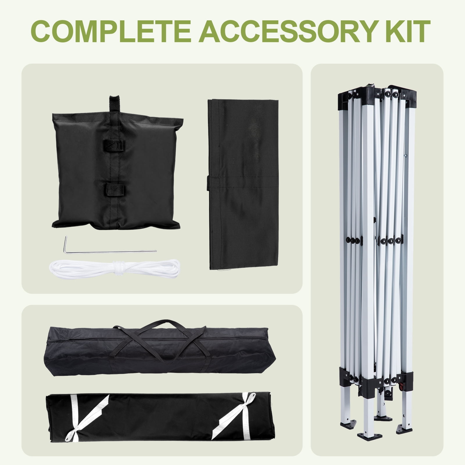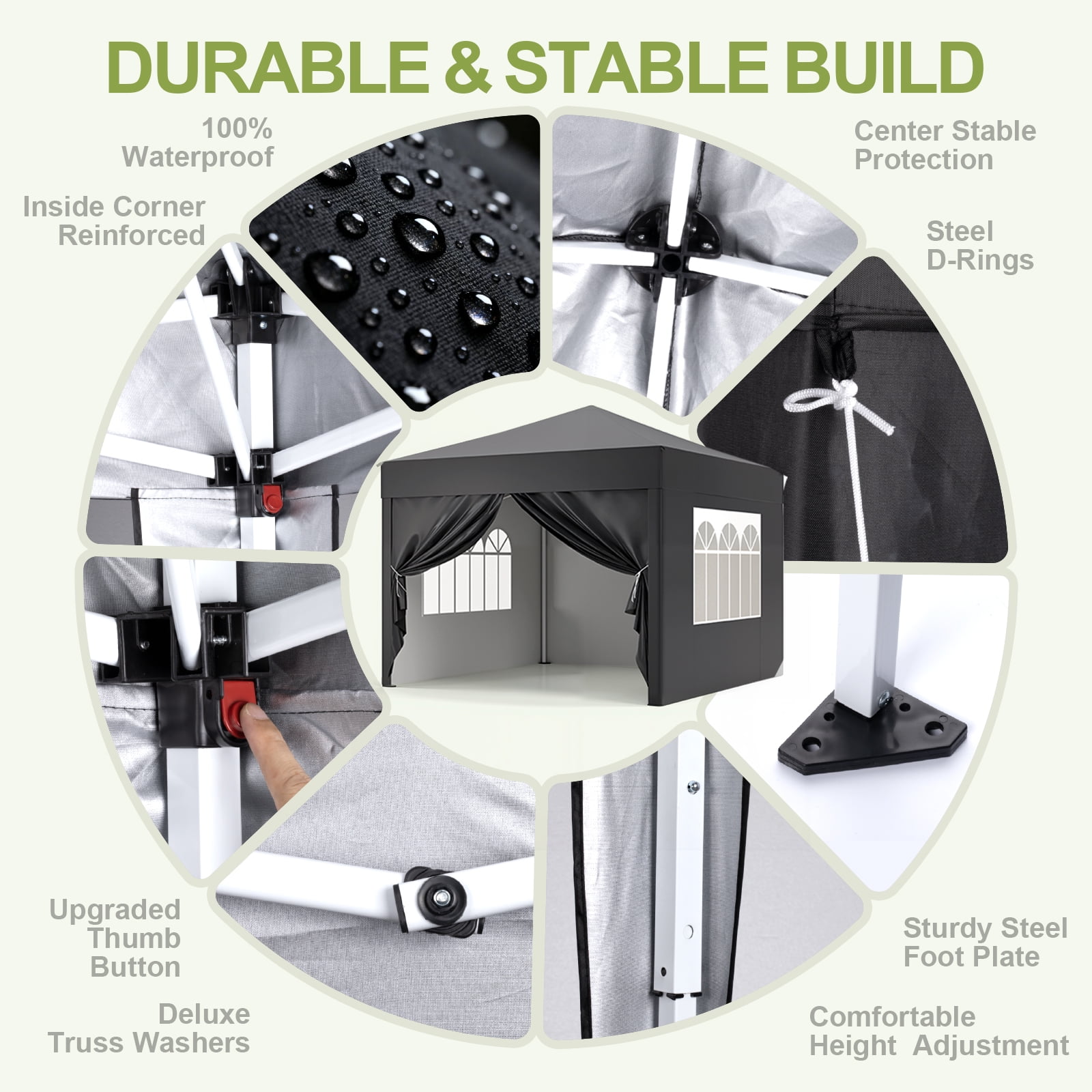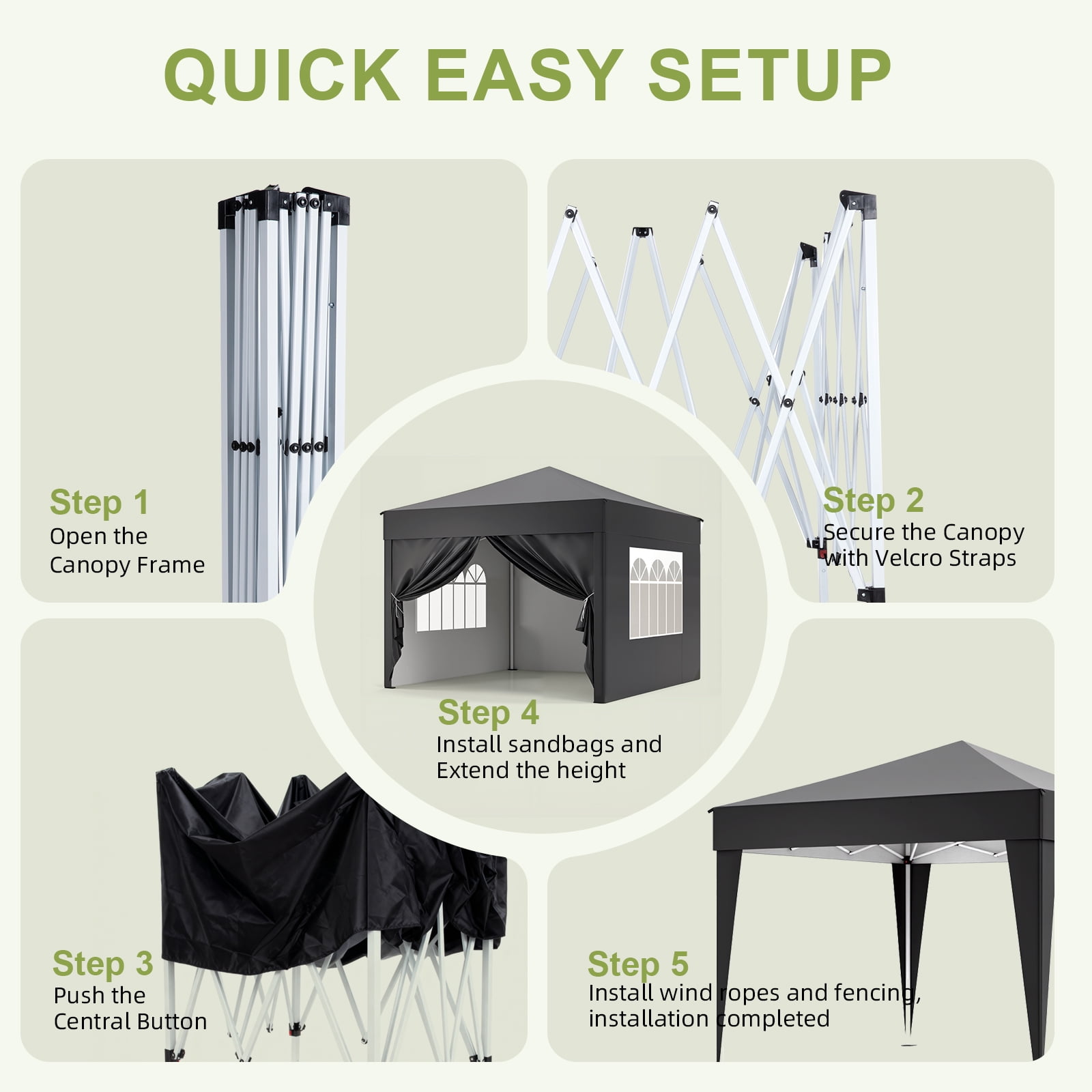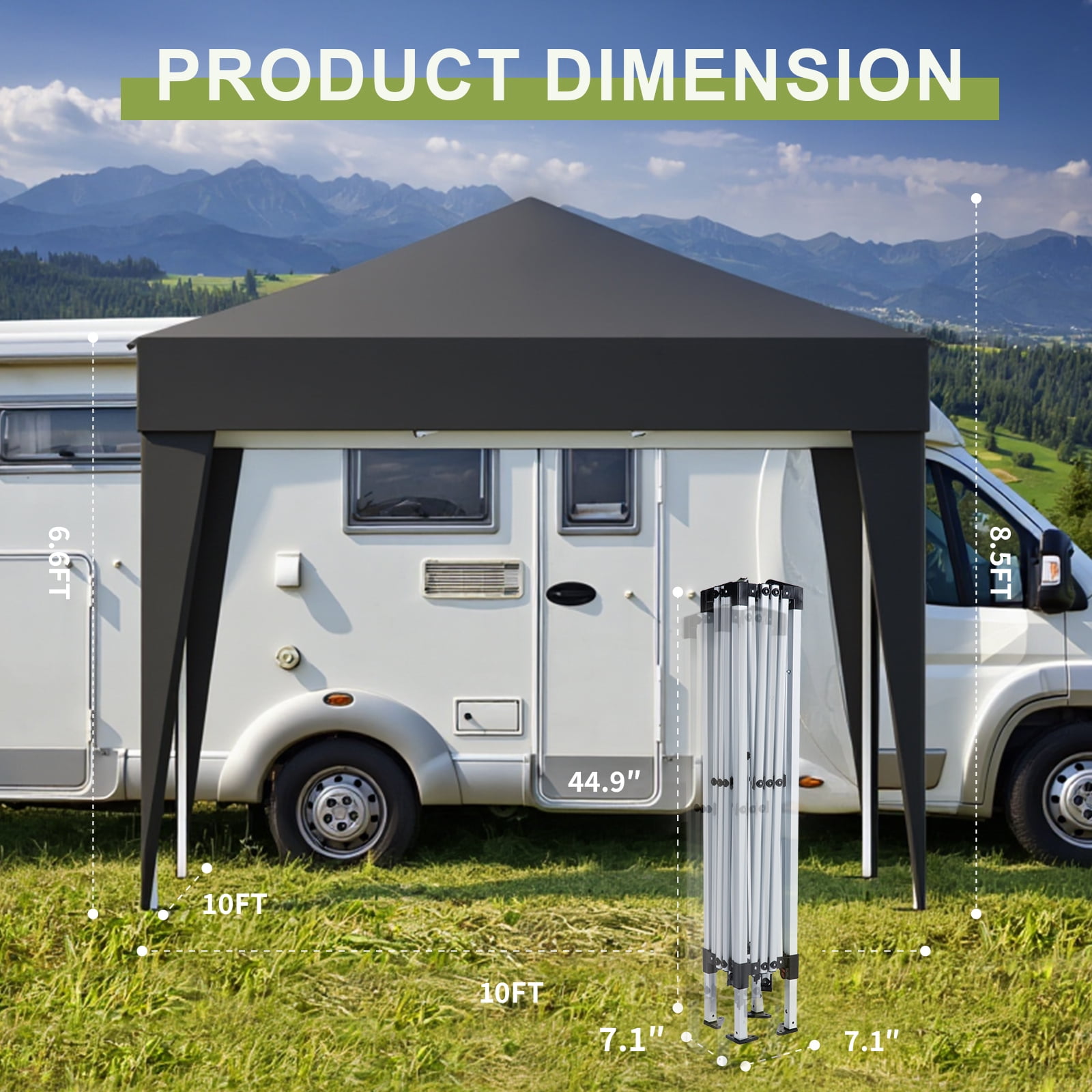100 Square Feet of Shade:Assembled size is 10’x10′, height is adjustable to 3 positions, just hit the button on the leg to adjust,can be matched freely according to the scene size, big enough for about 10 people to sit under Easy One Person Setup:Easy to set up with collapsible steel accordion frame and easy to remove with wheeled carrying bag (weighing only 26 pounds). 30% lighter and 25% smaller than other ordinary 10 x 10 foot canopy. Superior Quality:The flame resistant 210D oxford fabric canopy top is water resistant and offers superior UPF 50+ UV sun protection. Made of high-grade, powder-coated steel, SUGIFT’s frame is constructed with M5 hardened through-bold reinforced assembly and nylon plastic hardware. Portable Carrying Bag Included: Straight leg canopy x 1pcs, Stakes x 4pcs, Instruction manual x 1pcs, ideal for outdoor events.Our bag is compact and fits into most car trunks.Easily bring it along to tailgates, the beach, the park or wherever your fun begins! Guaranteed:Perfect for shading,conveniently an flexibly decorates gardens, patios, swimming pools, bbq areas, other outdoor events etc. If you have any other questions, please contact our professional service team. SIMPLE SET-UP: Set up in 1 minute in just 3 steps. With no tools required. Take the fully assembled frame with top out of the bag and pull it open. Place the fabrics over the frame and extend the legs. Use the thumb press buttons to easily adjust height and then snap into place.Quickly and simply. Specification Color: Black Product size: 10’x10’ Peak Height: 7.9ft, 8.2ft, 8.5ft Side Height: 6ft, 6.3ft, 6.6ft Product Weight: 26bs Material: powder-coated iron tube, 210D silver coated polyester fabric Package Includes: 10x10ft Canopy Frame x 1; Canopy Top cover x 1(No Sand Bags); Carry Bag x 1 2 x Tent Sidewall with Window 2 x Tent Sidewall with Zipper