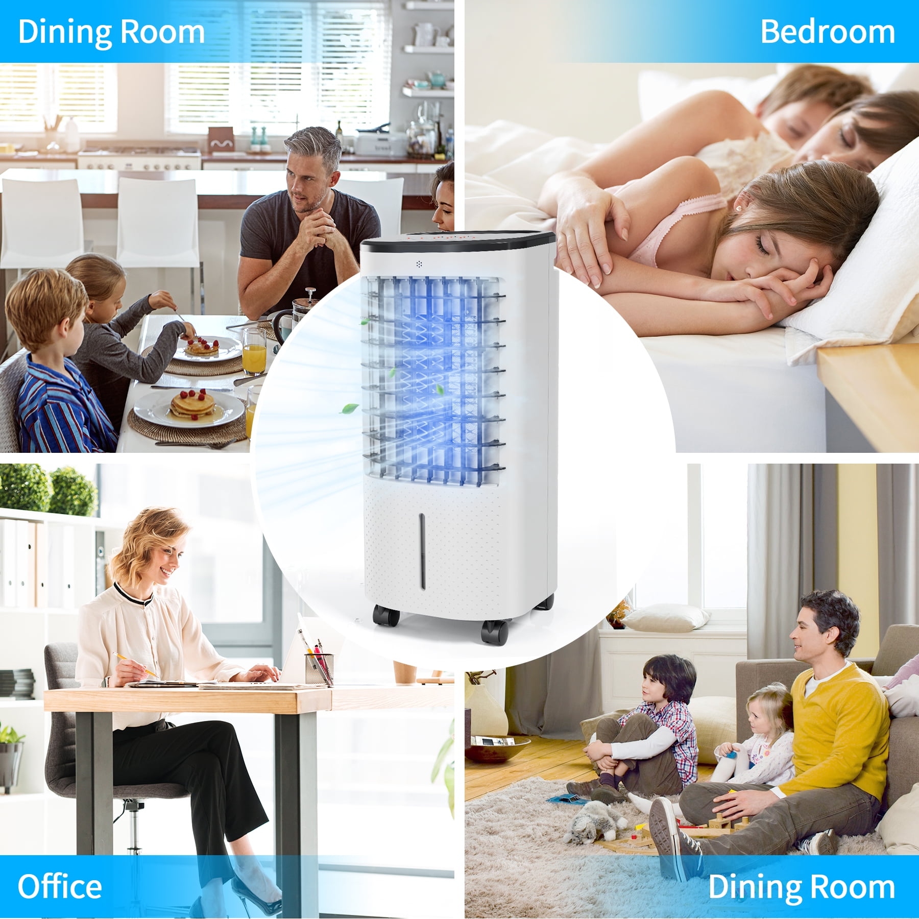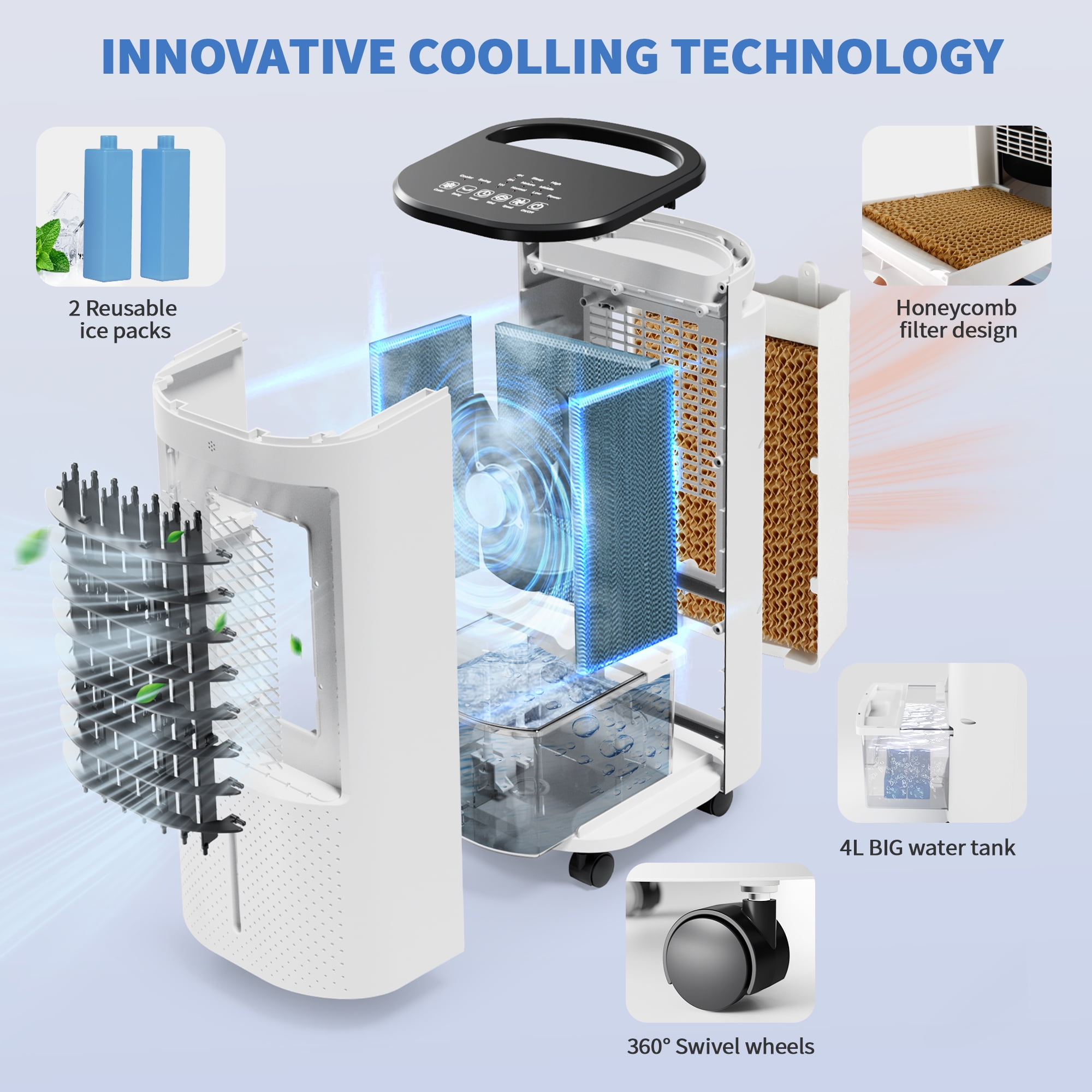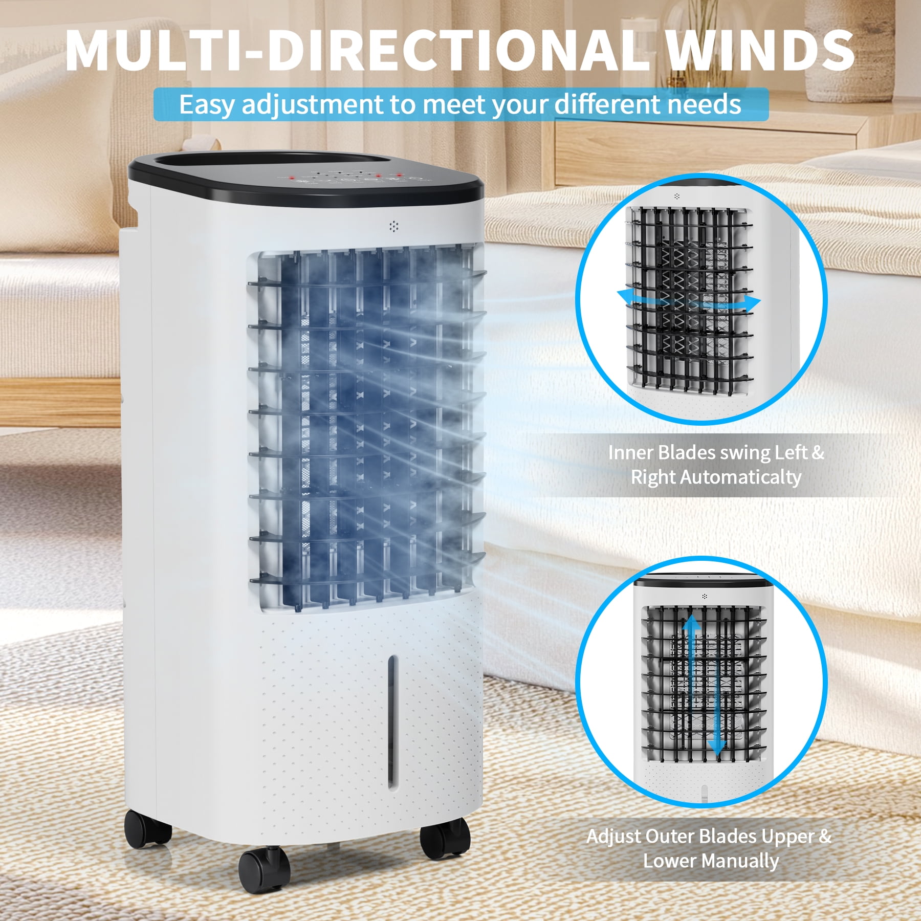 Enjoy personalized comfort with our versatile air cooler featuring 3 speeds and 3 modes, allowing you to tailor the airflow to your preferences. This 3-in-1 device serves as a personal air cooler, humidifier, and purifier, employing ice crystal refrigeration and humidification filtration technology to enhance your summer experience. The 6L large-capacity water tank ensures continuous misting for several hours, effectively increasing air humidity. For broader coverage, consider the model with oscillating louvers, swinging horizontally and vertically up to 65 degrees, perfect for multi-person use. The touch screen and remote control make operation convenient, with a 7-hour timer for uninterrupted sleep. Equipped with easy-rolling casters and a compact design, this air cooler is effortlessly portable, allowing you to place it in your home, office, or any desired location. When not in use, its compact design enables convenient storage in narrow spaces. Upgrade your cooling experience with this feature-packed and user-friendly air cooler.