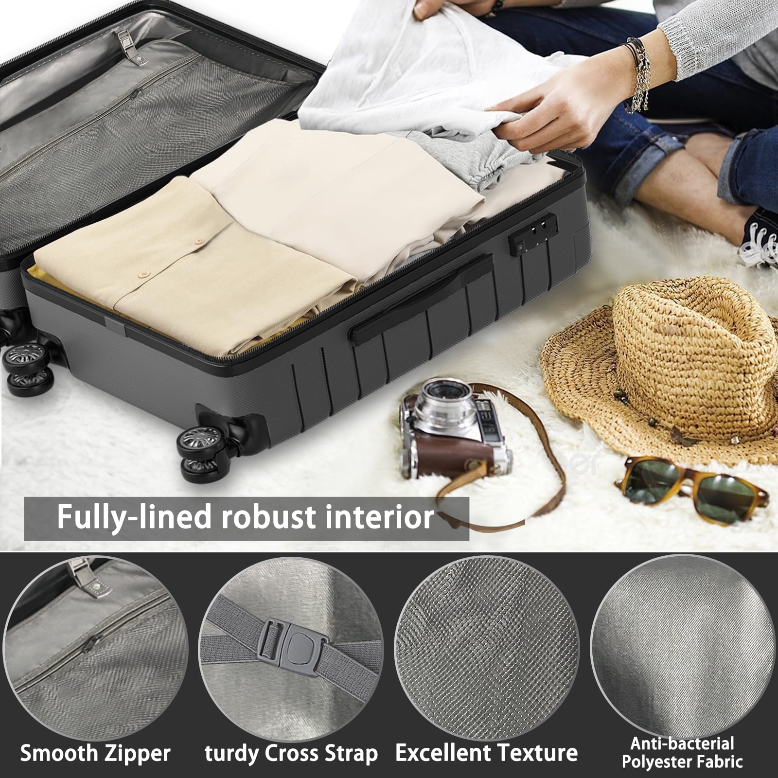 REMIUM LUGGAGE SETS: Our 3-piece luggage set is expertly crafted from upgraded PC+ABS material, ensuring resilience against stress, temperature variations, and impacts. Reinforced corner guards provide an extra layer of defense, effectively minimizing potential luggage wear and tear. EFFORTLESS MOBILITY: With four 360-degree wheels, our hardshell luggage ensures effortless gliding and easy maneuvering in busy airports. The telescopic handle adjusts to various heights, accommodating your preferences for convenient handling. ENHANCED SECURITY: The built-in recessed TSA-approved lock, situated on the side of the suitcase, exclusively allows TSA personnel to inspect your luggage without compromising the lock’s integrity. The default combination is 0-0-0. The durable zippers are resistant to piercing, ensuring enhanced protection for your belongings and personal privacy. ORGANIZED INTERIOR: Inside, you’ll discover ample space with tie-down straps, a zippered divider featuring a lined pocket, and dedicated shoe compartments. Whether it’s a brief weekend escapade (20-inch), an extended week-long journey (24-inch), or extensive travel (28-inch), our 3-piece set caters comprehensively to your family’s travel requirements. DIMENSIONS: This suitcase set comes in three sizes. The 20″ carry-on luggage measures 12.6 x 8.66 x 20.86 inches and weighs 5.9 lbs. The 24″ checked luggage measures 15.75 x 10.24 x 24.8 inches and weighs 7.54 lbs. The 28″ checked luggage measures 17.72 x 11.81 x 28.34 inches and weighs 9.26 lbs. The suitcases nest for efficient shipping and storage. DEDICATED CUSTOMER CARE: Our unwavering commitment to quality is underscored by stringent durability tests, validating the steadfast construction of our hardshell luggage set. Each set undergoes meticulous professional assessment, surpassing customer expectations. If you have any queries regarding your spinner-wheel hardcase luggage set, feel free to contact us promptly. We guarantee a response within 24 hours, ensuring the provision of optimal solutions for