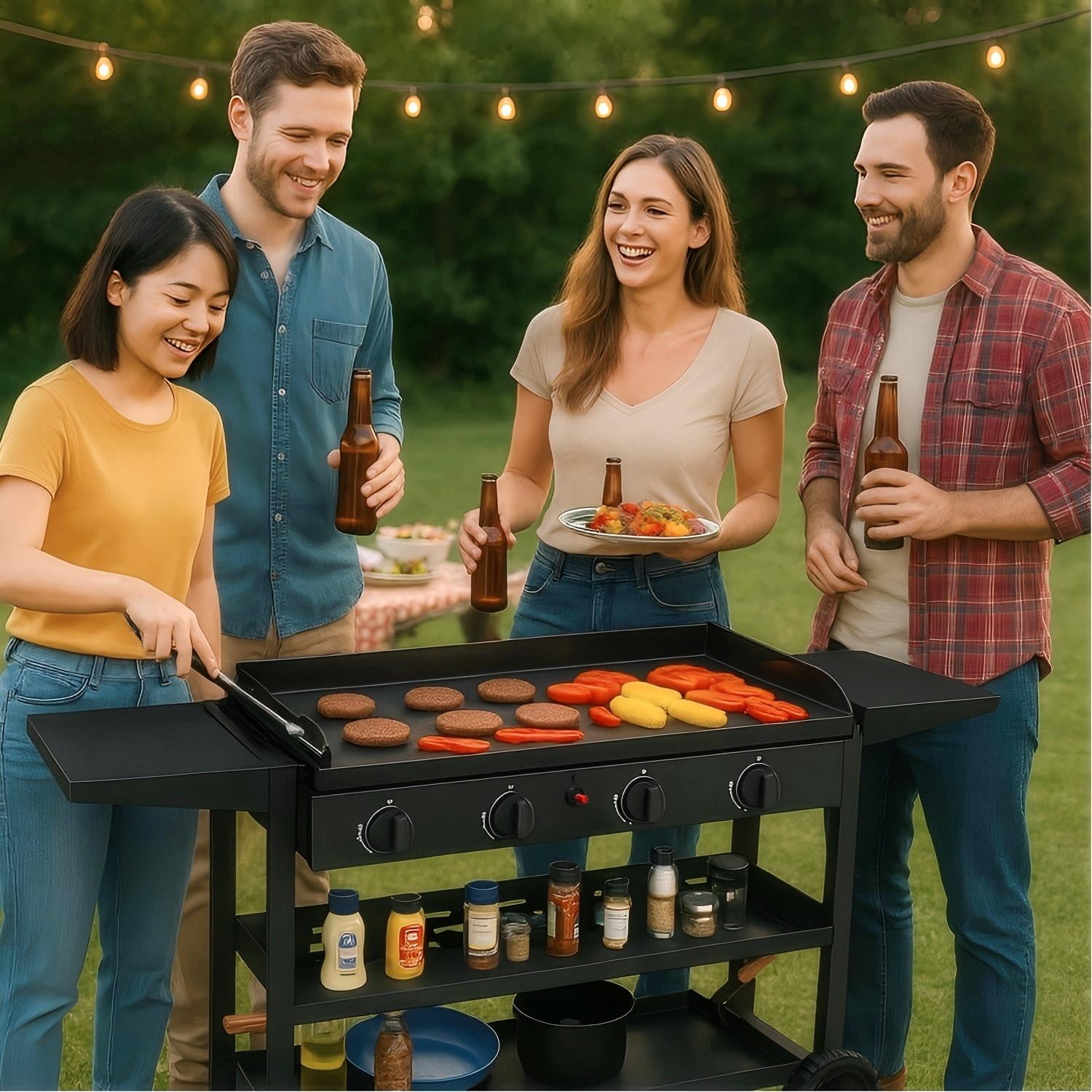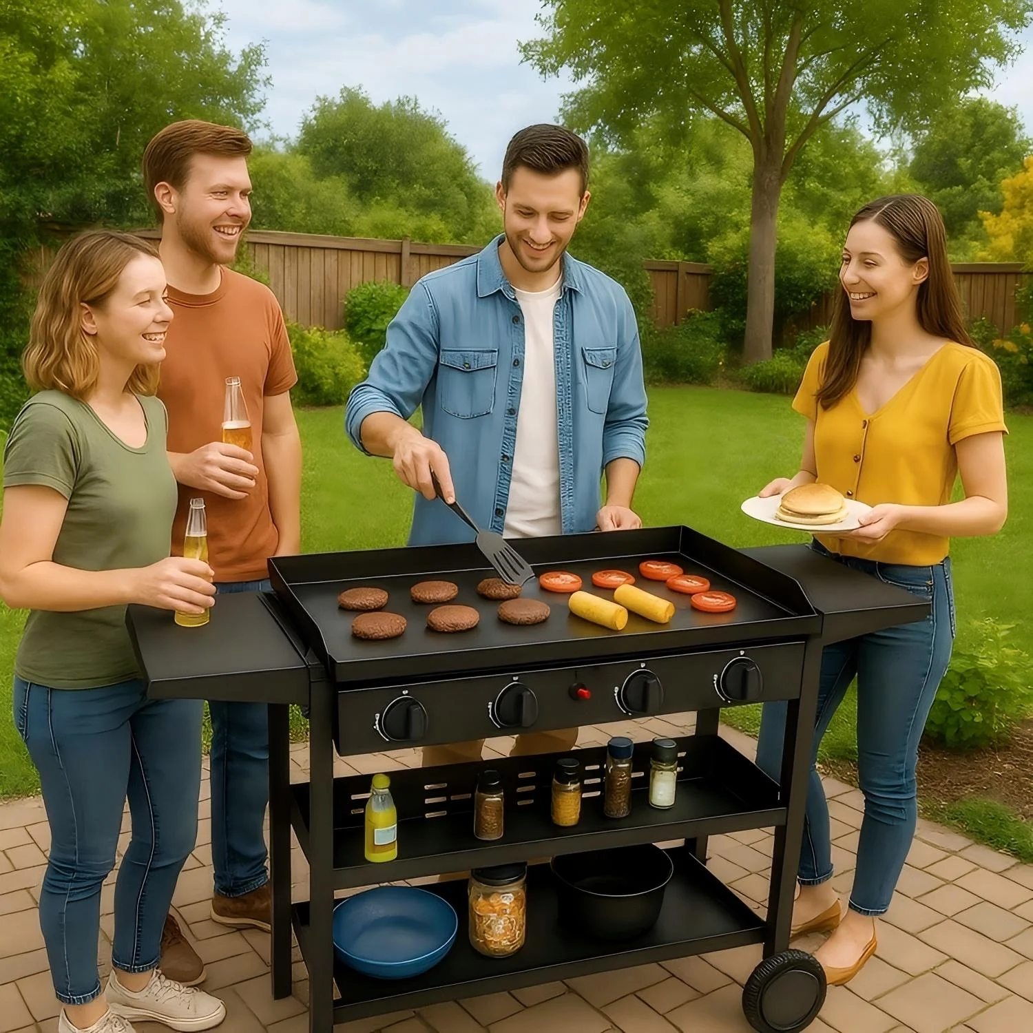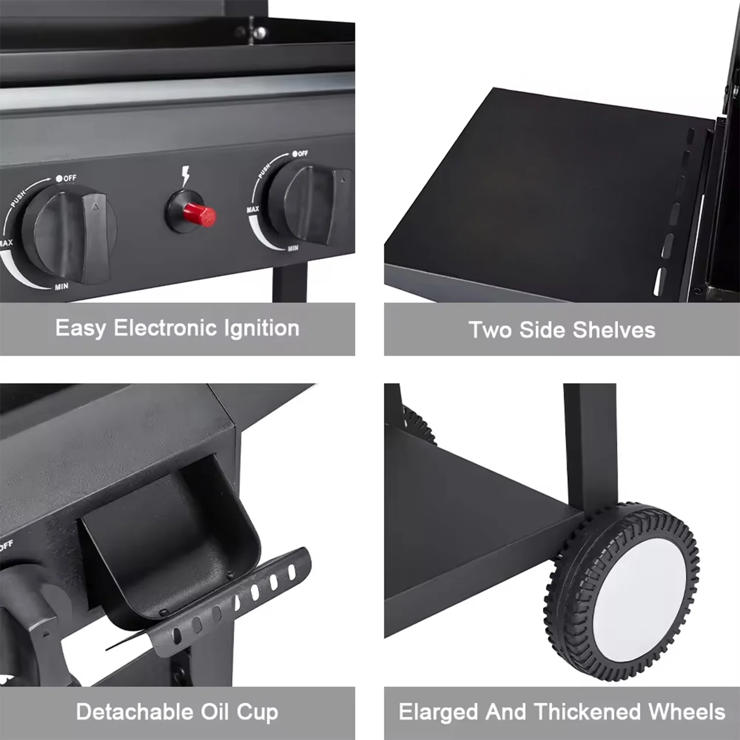 4 control knobs allow you to adjust the temperature of different heating zones (preservation, low, medium, high). 2 side table and bottom shelf offer sufficient storage space for you. It’s ideal for cooking eggs, pancakes, bacon, steak, potatoes and other grilled food. You can use it in patio, garden, backyard, etc.