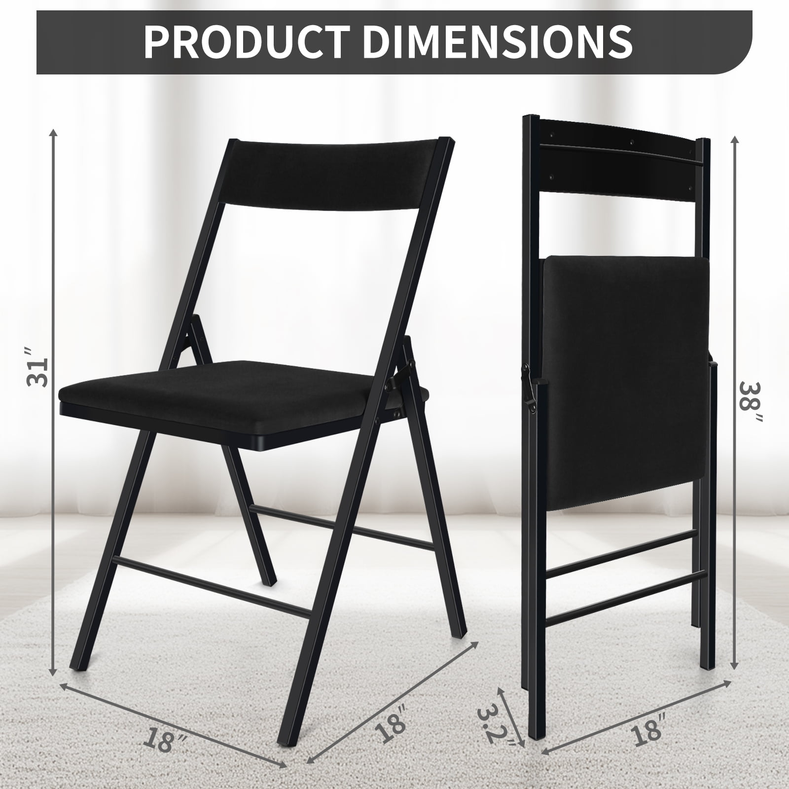 Comfortable & Stylish: Our folding chairs are generously padded with premium velvet fabric and thick foam, offering a comfortable seating experience for work, study, or events. The sleek metal frame adds a touch of elegance to any setting, making these chairs both functional and stylish. Sturdy Construction: Designed for durability, these chairs feature a triangular structure and non-slip foot pads, ensuring stability both indoors and outdoors without scratching your floors. The all-steel frame is built with double hinges and welded cross braces, supporting up to 450 pounds. No Assembly Required, Ready in One Second: SUGIFT folding chairs come fully assembled and ready for use straight out of the box. The padded seat chairs fold easily for compact storage, making them incredibly convenient and space-saving. Versatile for Any Occasion: With their elegant velvet fabric, these folding chairs are perfect for weddings, holiday parties, restaurants, bedrooms, dorms, apartments, and even outdoor garden lounges. Customer Service: Please use our folding chairs as intended for optimal performance. If you have any questions or concerns, don’t hesitate to reach out to us. We’re dedicated to providing high-quality products and excellent customer service, ensuring your satisfaction.