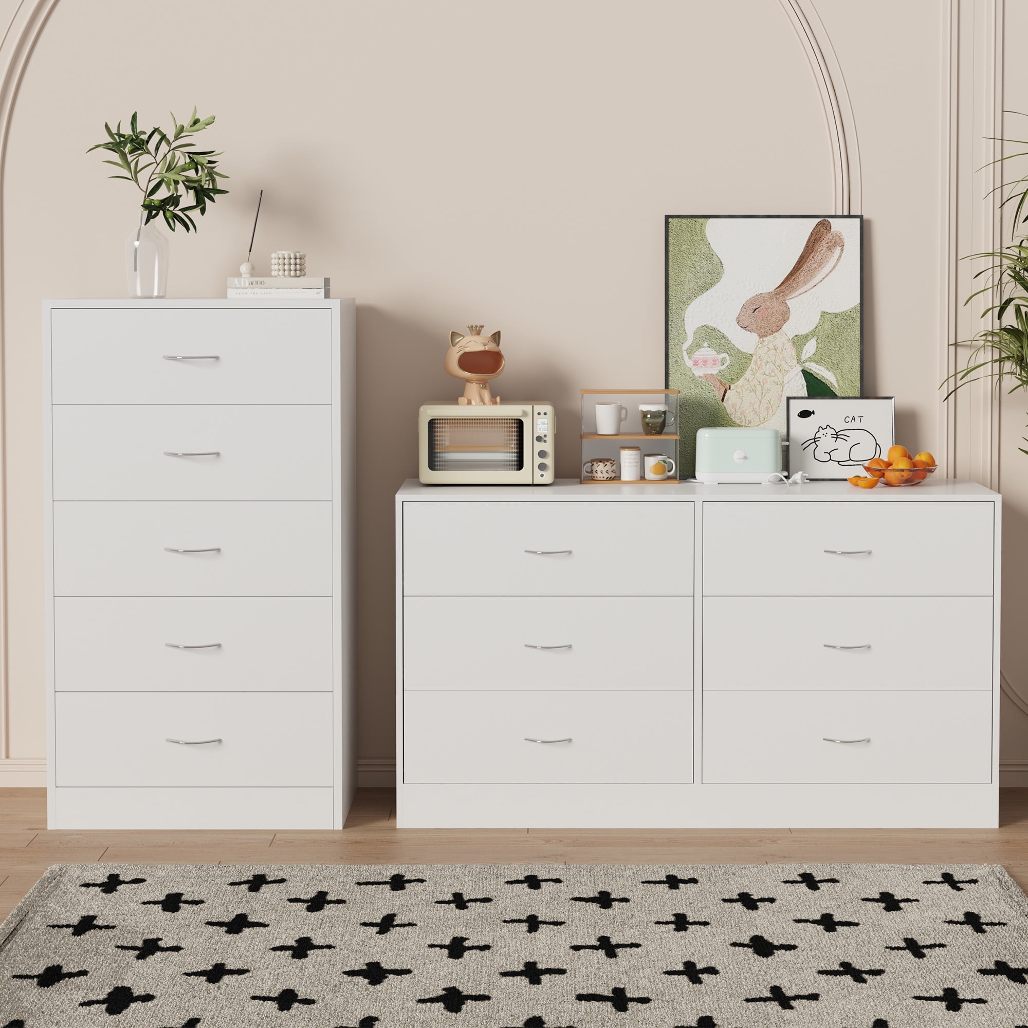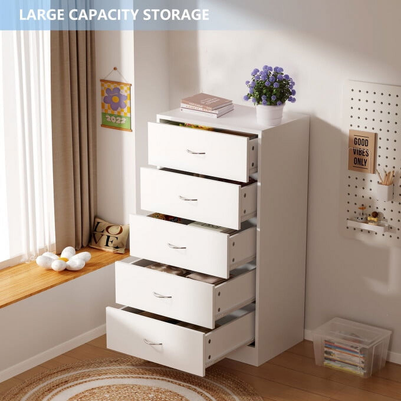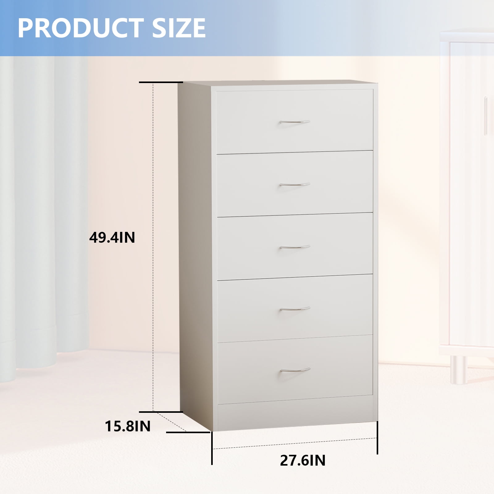 Crafted from high-quality MDF, this dresser offers durability and eco-friendly construction. Deepened drawers provide extra storage space, expanding from 11.8″ to 13.8″. Five spacious drawers offer ample storage, each supporting up to 25 lbs. Modern design with sleek, inset handles adds elegance to any room. Versatile storage solution perfect for bedrooms, living rooms, or kitchens. Easy assembly with included tools and clear instructions.