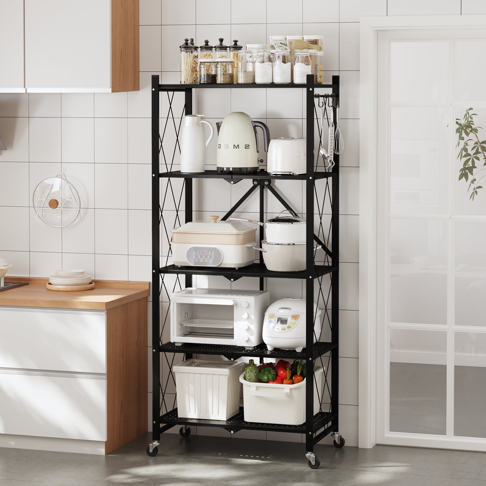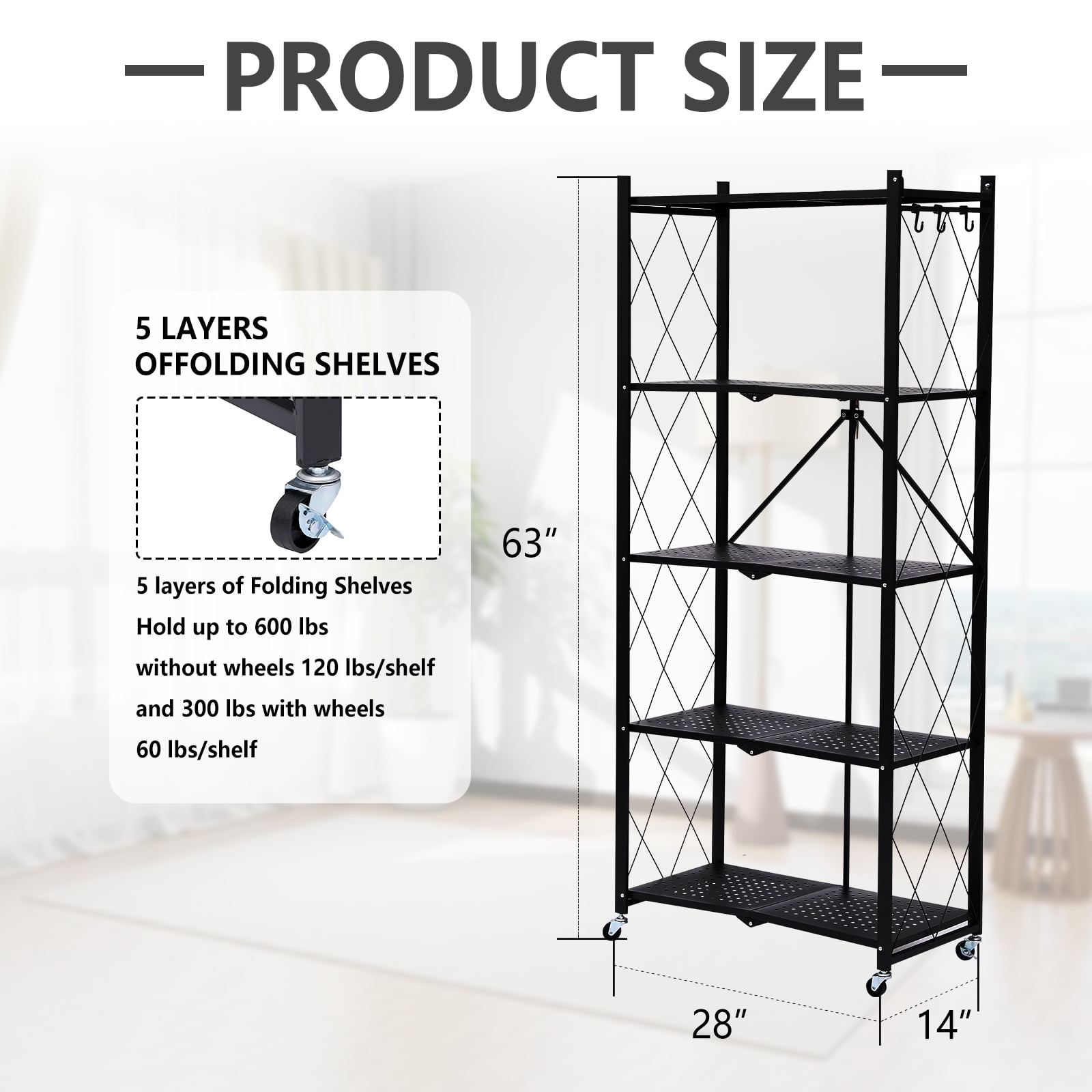 No Installation Shelf: Pre-assembled shelf saves you the hassle of installation, 5 seconds to install. With 4 wheels, you can easily push it anywhere. Foldable design is easy to carry and store. Stable and Durable Storage Shelf:Metal shelves are made of highly durable iron, rustproof, corrosion-resistant and stable. It can hold up to 750 lbs without wheels (150 lbs/shelf) and 300 lbs with wheels (60 lbs/shelf). Perfect Size:Opening size (with wheels): 28 x 13.8 x 63.4” The height of each tier not only creates more extra space, but also keeps your home neat and organized. The organizer can be stored under the bed, behind the door, etc. and will not take up more space when not in use. Lockable Large Wheels:The grocery shelf comes with 4 easy-glide durable rubber wheels that can rotate 360°.2 with brakes and 2 without brakes, making the rolling kitchen cart more stable without worrying about slipping. The mesh shelves on both sides also prevent items from falling. Multi-Purpose Shelving:This metal shelving can meet a variety of multi-purpose storage needs in homes, garages, businesses, warehouses, schools, storage rooms and offices Open Dimensions (with wheels): 28″ W Ă— 13.8″ D Ă— 63.4″ H Folded Dimensions: 13.8″W Ă— 3.9″D Ă— 63.4″ H Shelf Weight Capacity: 150 lbs per shelf (without wheels), 60 lbs per shelf (with wheels) Total Weight Capacity: 750 lbs (without wheels), 300 lbs (with wheels) Material: Heavy-Duty Iron (Rust and Corrosion-Resistant) Wheels: 4 Rubber Wheels (2 with Brakes, 2 without Brakes) Color: Black 1 Ă— 5-Tier Foldable Metal Storage Shelf