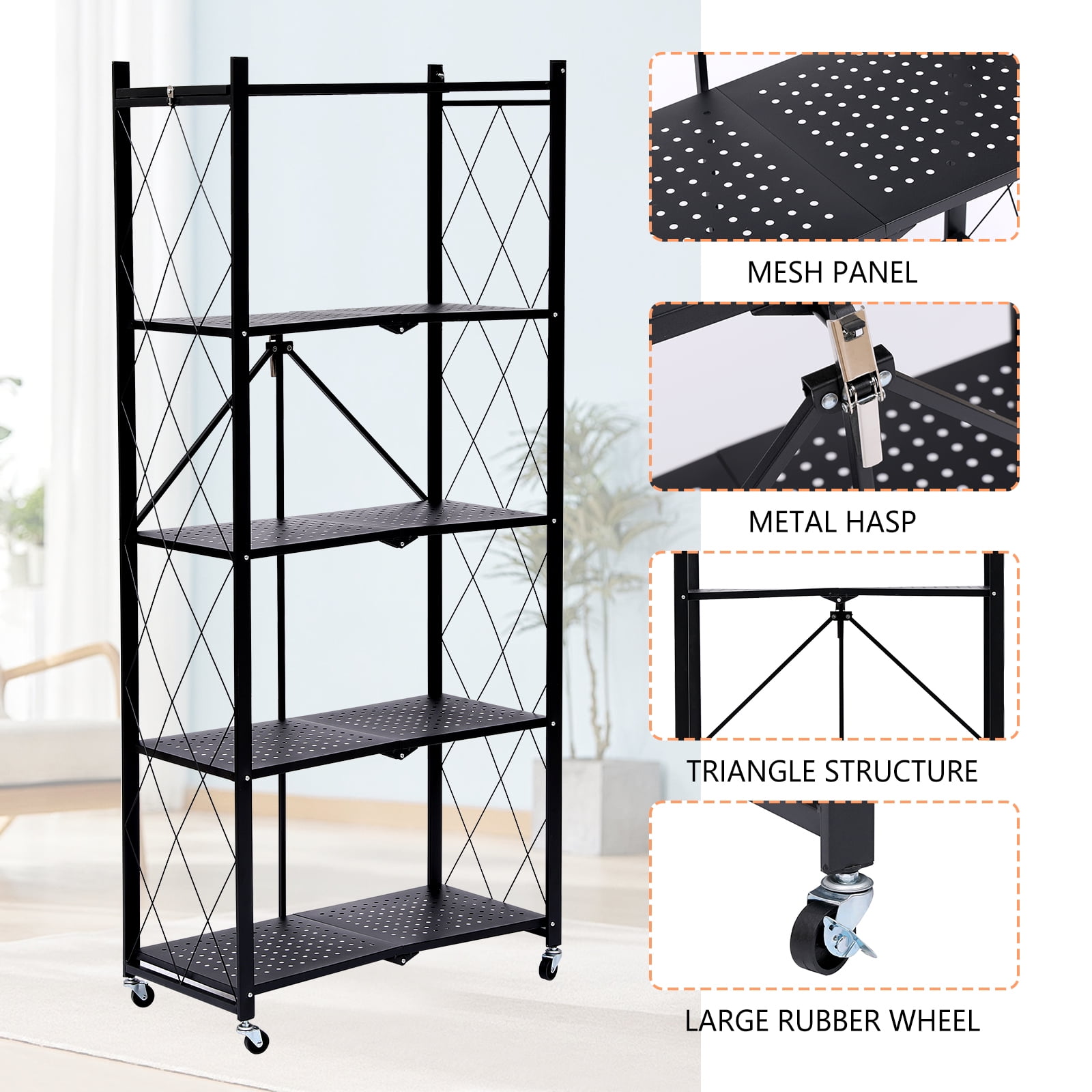 SUGIFT 5-Tier Foldable Metal Storage Shelf with Wheels, No Assembly, Heavy-Duty Organizer (750 lbs) for Home, Garage & Office, Black