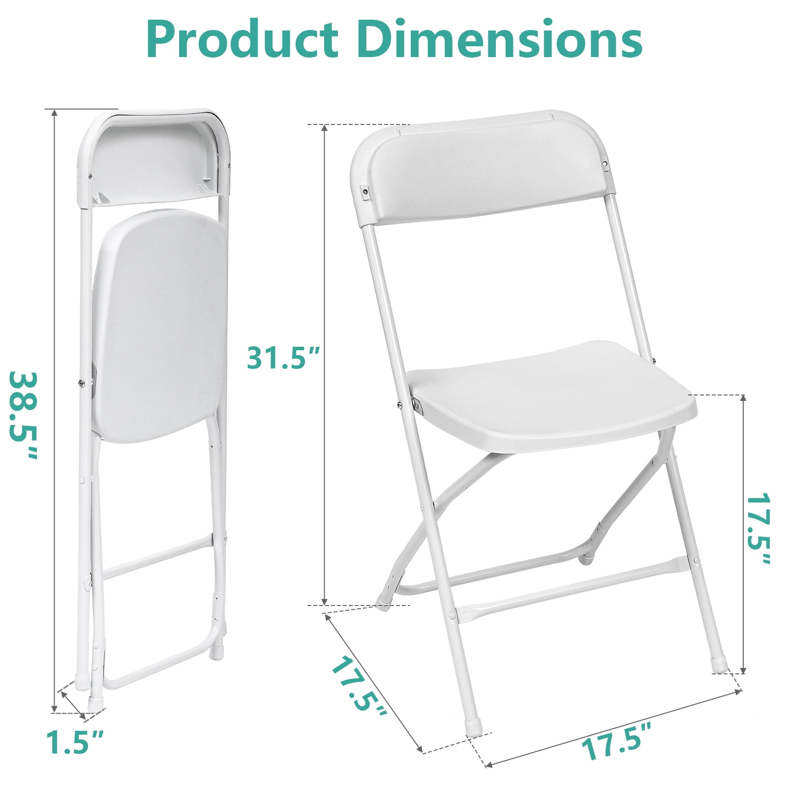 Ideal for Any Event: Our folding chairs are perfect for conferences, parties, and commercial events; easily portable for both indoor and outdoor use with no assembly required, making them a practical choice for any occasion. Anti-Skid Design: Equipped with rubber feet, these white folding chairs prevent floor damage and ensure stability, minimizing scuffing and keeping the chair securely in place. Durable and Attractive: Crafted for long-term use, our chairs feature a thick HDPE seat and back with a white-coated, sturdy frame, supporting up to 350lbs and complementing any decor. Comfortable Seating Experience: Ergonomically designed, these adult folding chairs provide strong back support and relieve spinal pressure, ensuring comfort during long events. Portable and Space-Saving: These lightweight sillas para fiestas require no assembly, fold and unfold in seconds, and can be easily stored away, saving valuable space and offering convenience.Perfect for Any Event: Versatile, indoor/outdoor use.