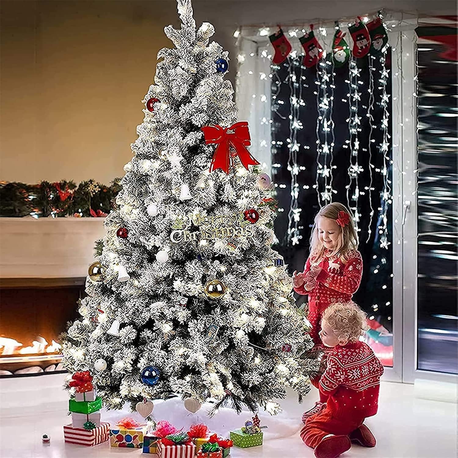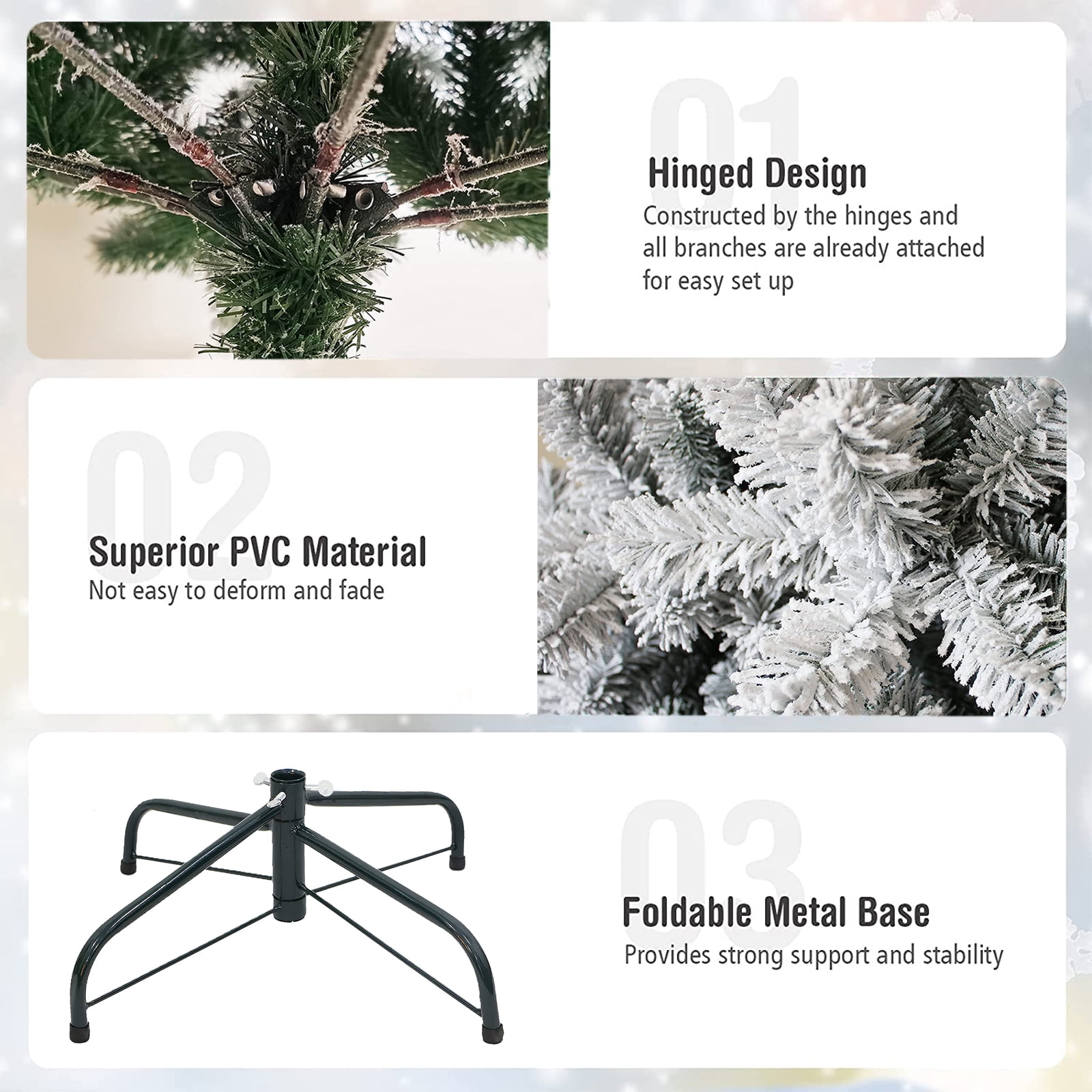 High Quality Material: The blades of the Christmas tree are made of high-quality PVC, non-flammable, non-allergic, makes the tree more real and full. Featuring hundreds of individually crafted branch tips to create full bodied branches, this tree is designed to look and feel lifelike. Eye-catching Design: This tree features pre-attached, hinged branches that drop down for a simple set-up and fold back in for quick and convenient storage. Set aside 45-60 minutes to properly shape the tree by peeling back the branches and pulling the tips apart. Perfect for Festivals: The Christmas tree with warm white lights adds a winter feel to any decor, thousands of branch tips provide generous amount of space to hang up Christmas ornaments and decor, classic Christmas elements and snow make it a great decor for Christmas and festivals, adds more excitement to your life, makes your family full of Christmas atmosphere. Sturdy Metal Stand: SUGIFT Christmas trees use sturdy metal stand, built to endure many holidays, provide strong support for the tree and ensure stability, serve you for a long time. Easy to assemble: The assembly can be finished in a few steps with 3 sections. Convenient hinged branches and folding metal stand allow for easy assembly, dismantling and storing. You can adjust the branches with an elegant look. Specifications Color: Green, White Material: Metal, Plastic Tree Type: Fir Assembly Required: Yes