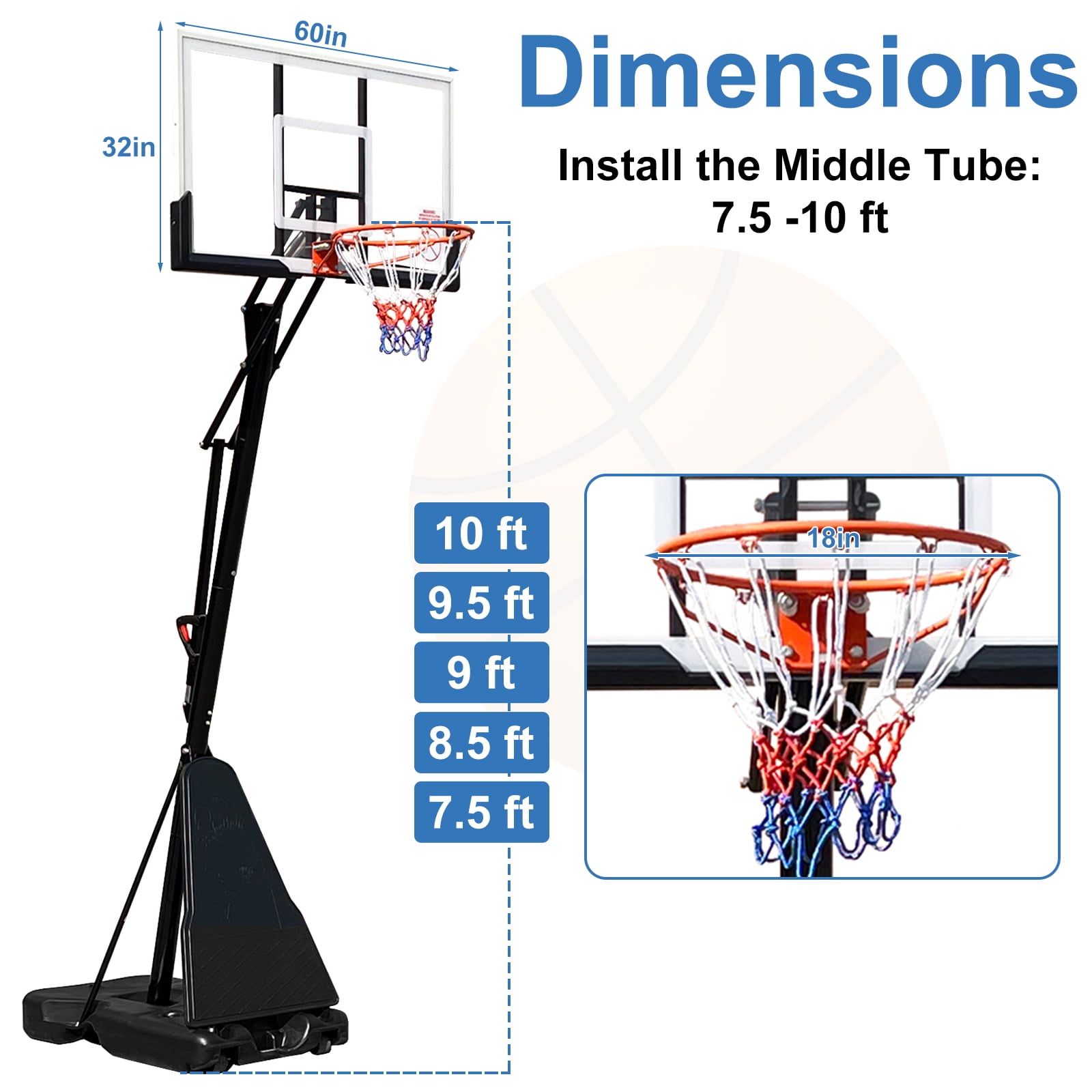 Sugift 7.5′-10′ Adjustable Height 60″ Shatterproof Outdoor Portable Basketball System (Adult) Adjustable Height: Features a labor-saving quick lift system that allows you to easily adjust the hoop height from 7.5 feet to 10 feet using a crankshaft rocker for precise adjustments Standard Basketball Goal System: Ideal for practicing passing and catching skills, this outdoor basketball hoop provides entertainment for kids and adults alike, promoting exercise and family bonding Easy Assembly: Assembly is straightforward, taking 90 minutes or less when following the included instruction manual Durable Construction: Built with a shatterproof polycarbonate backboard and a steel breakaway hoop, ensuring longevity and resilience during play Stable Base: The 36-gallon base can be filled with water or sand for stability, and it includes two wheels for easy mobility