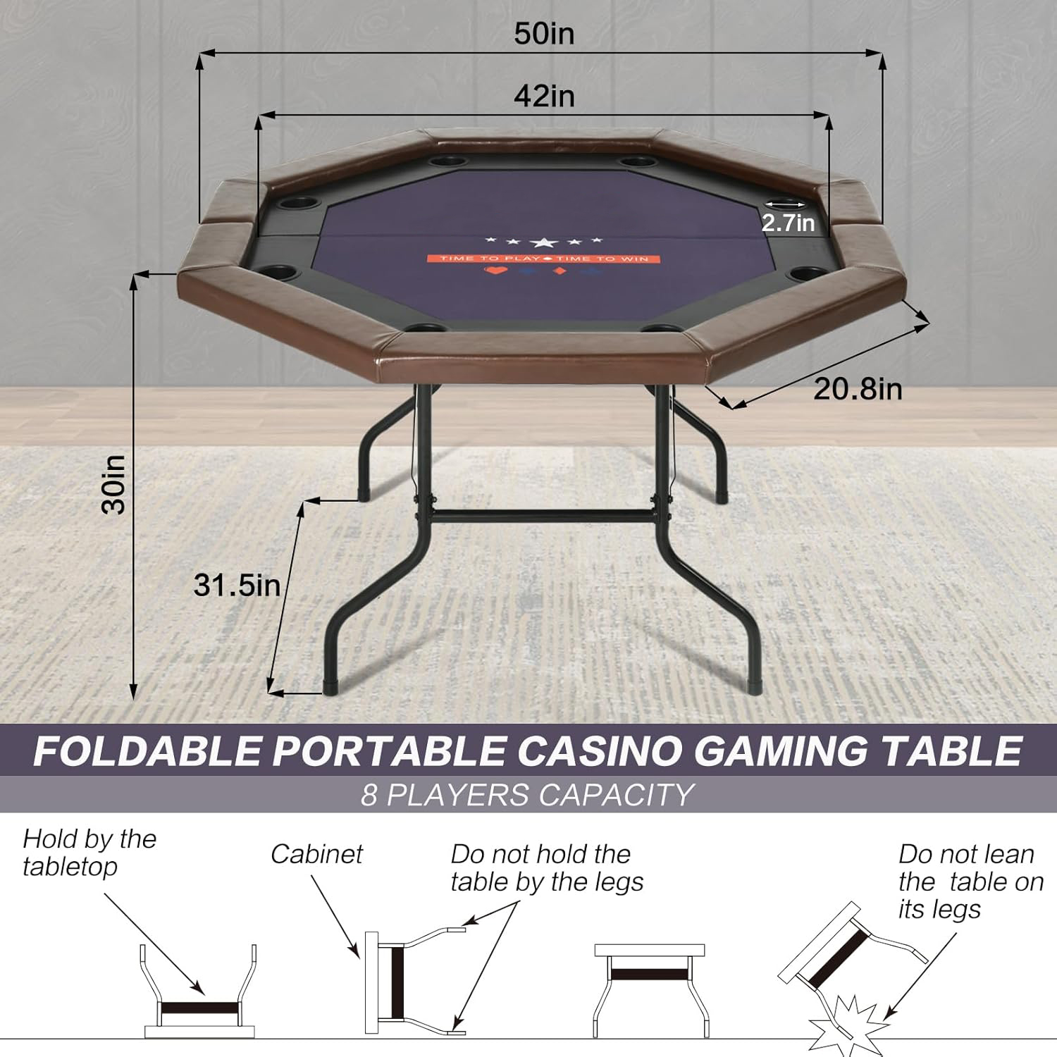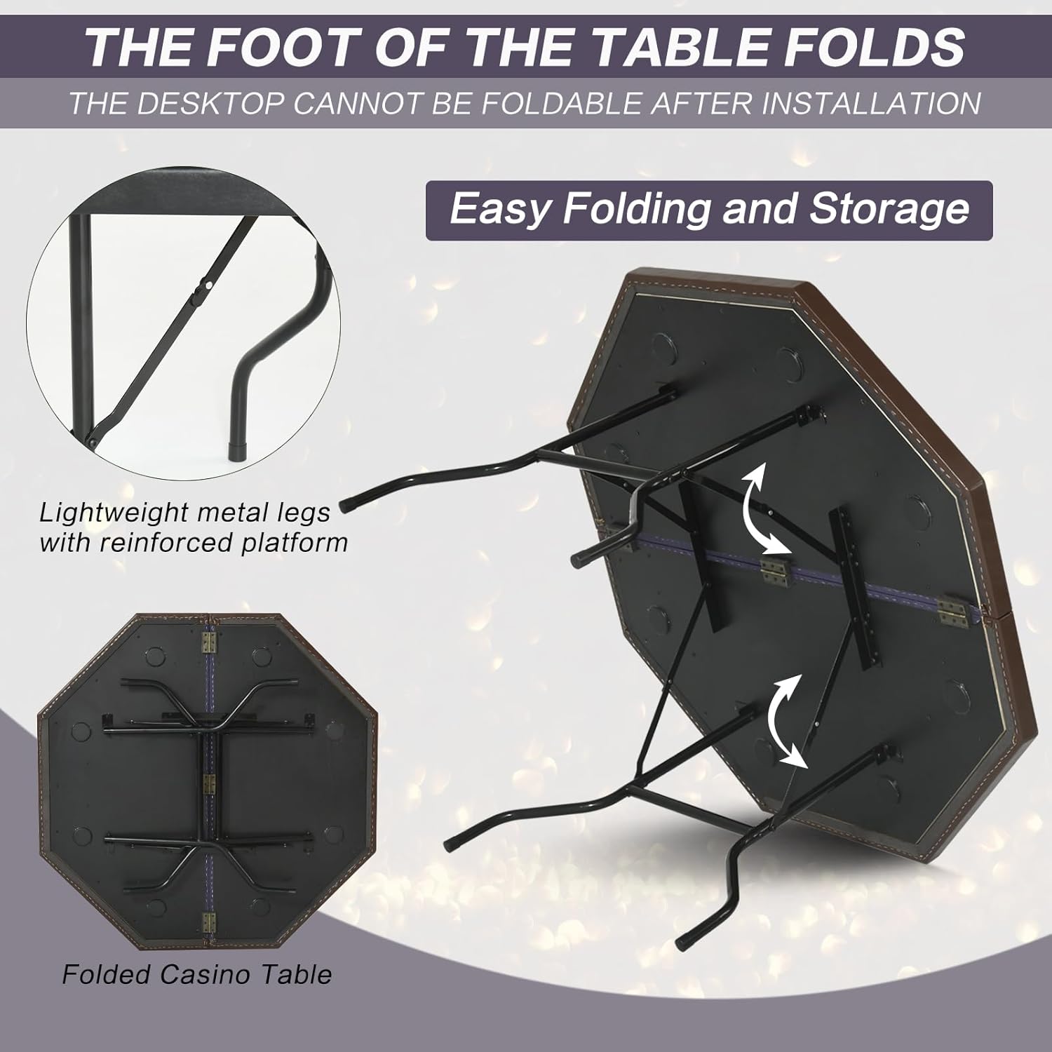 Foldable & Easy to Install: With the installation instructions, you can quickly install this poker table. The foldable legs are designed to allow the poker table to be easily transported. Note that after the table is installed, only the legs can be folded while the tabletop can not be folded. Upgraded Large 8-person Poker Table: Our poker tables can accommodate up to 8 players and is perfect for family nights, parties, or playing card games such as blackjack and Texas Hold’em. Sturdy and Durable Construction: This folding poker table features a high-quality, sturdy plywood table top and foldable metal legs that allow the table to be reused for many years. Comfortable Padded Rails: The padded rails around this octagon poker table make you more relaxed when playing board games, and you won’t get tired even if the game lasts late. Deeper Stainless Steel Cup Holders: This foldable poker table is designed with deeper stainless steel cup holders to hold drinks very securely without fear of spills.
