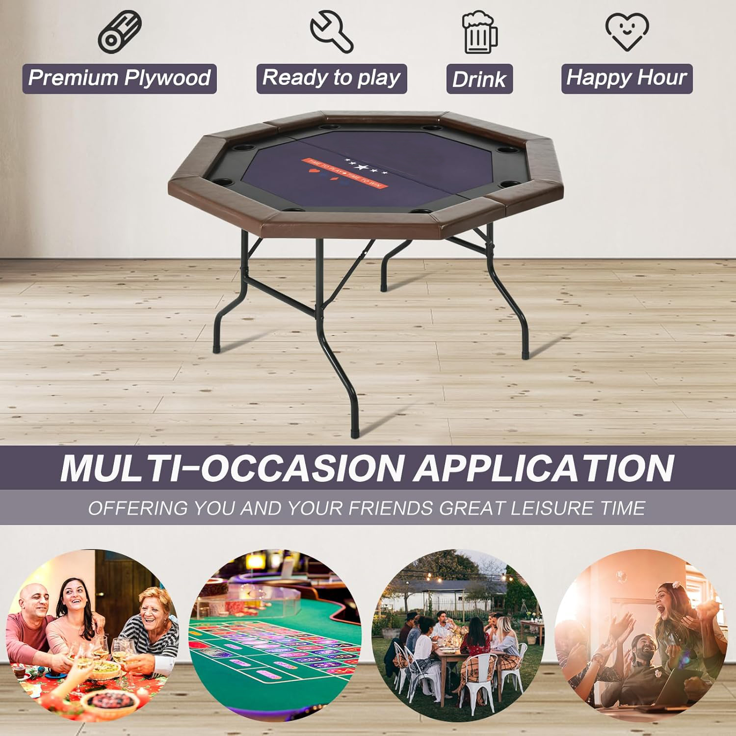SUGIFT 8 Players Poker Table Foldable,50inch Upgraded Folding Octagon Casion Table, Portable Texas Holedem Table w/Stainless Steel Cup Holders, Water-Resistant Cushioned Rail(50inch, Brown)