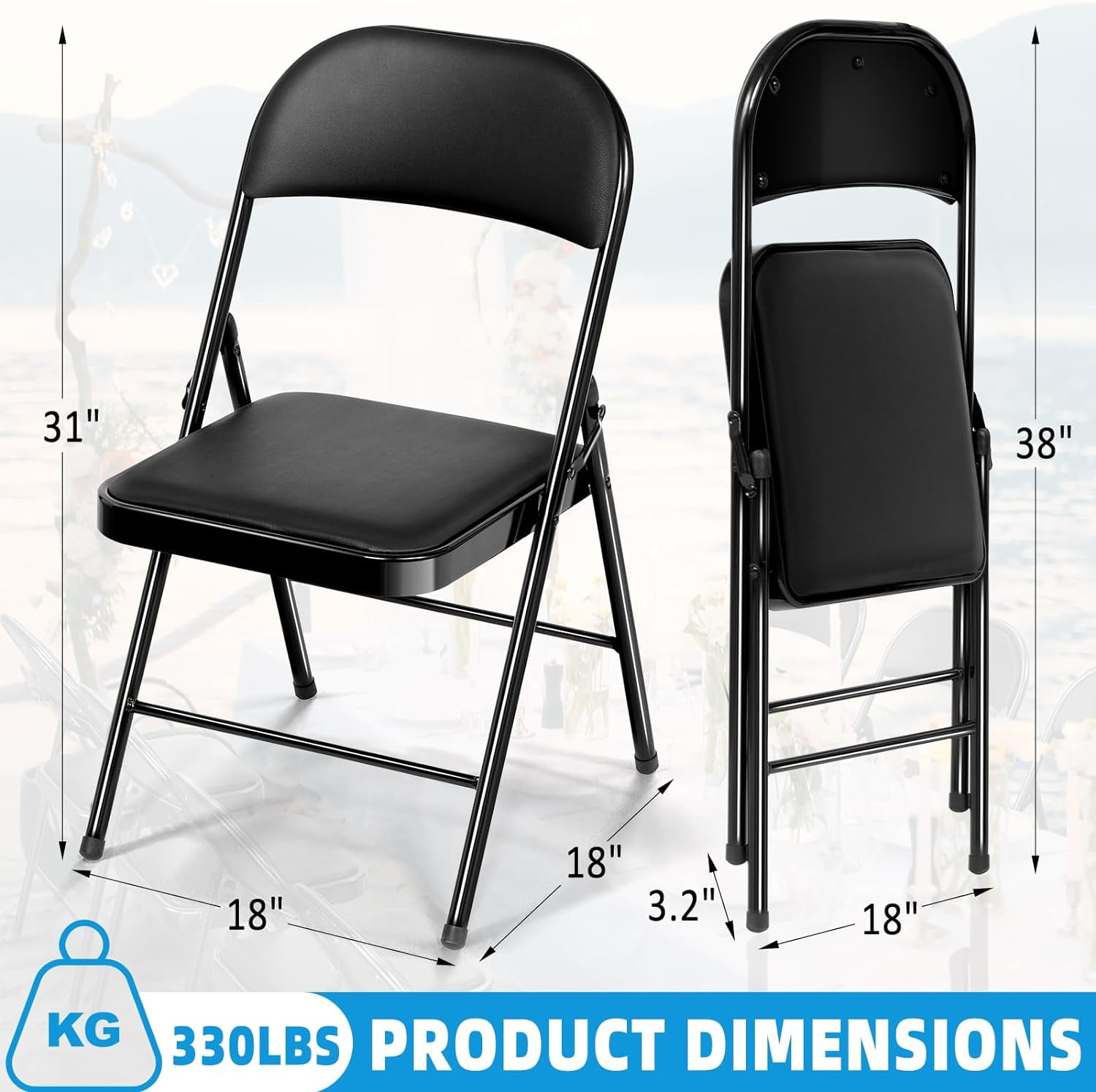 The black color of this product allows you to have a simple, elegant addition to your living space without clashing with your existing color palette or furniture layout while providing extra seating for special occasions or daily use. Constructed out of a vinyl seat and steel frame combination, this chair to be a long-term purchase you can use with peace of mind and no regrets! The vinyl material provides you with an easily maintained product that can withstand all kinds of messes and never fold under the pressure. The black steel legs make our chair heavy duty while retaining its stylish simplicity. Featured with this are non-marring leg tips intended to prevent slipping when in use and protect your floor’s surface from any possible damage. When not in use, the fold hinges built into the chair allow this product to fold flat for easy, non-invasive storage so it’s out of sight, out of mind! Pair this chair with our folding tables and make your next gathering an entertainer’s dream! Package Includes: 6 x Folding Chair 1 x Instruction Specifications: Color: Black Material: Sponge, Steel, PU Product Dimension: 18.5″L x 18.5″W x 30″H Folding Size: 18″L x 3″W x 38″H Load Capacity: 330 lbs Easy to clean using a damp cloth Folds flat and compact for easy storage Non-marring leg tips protect floor surfaces