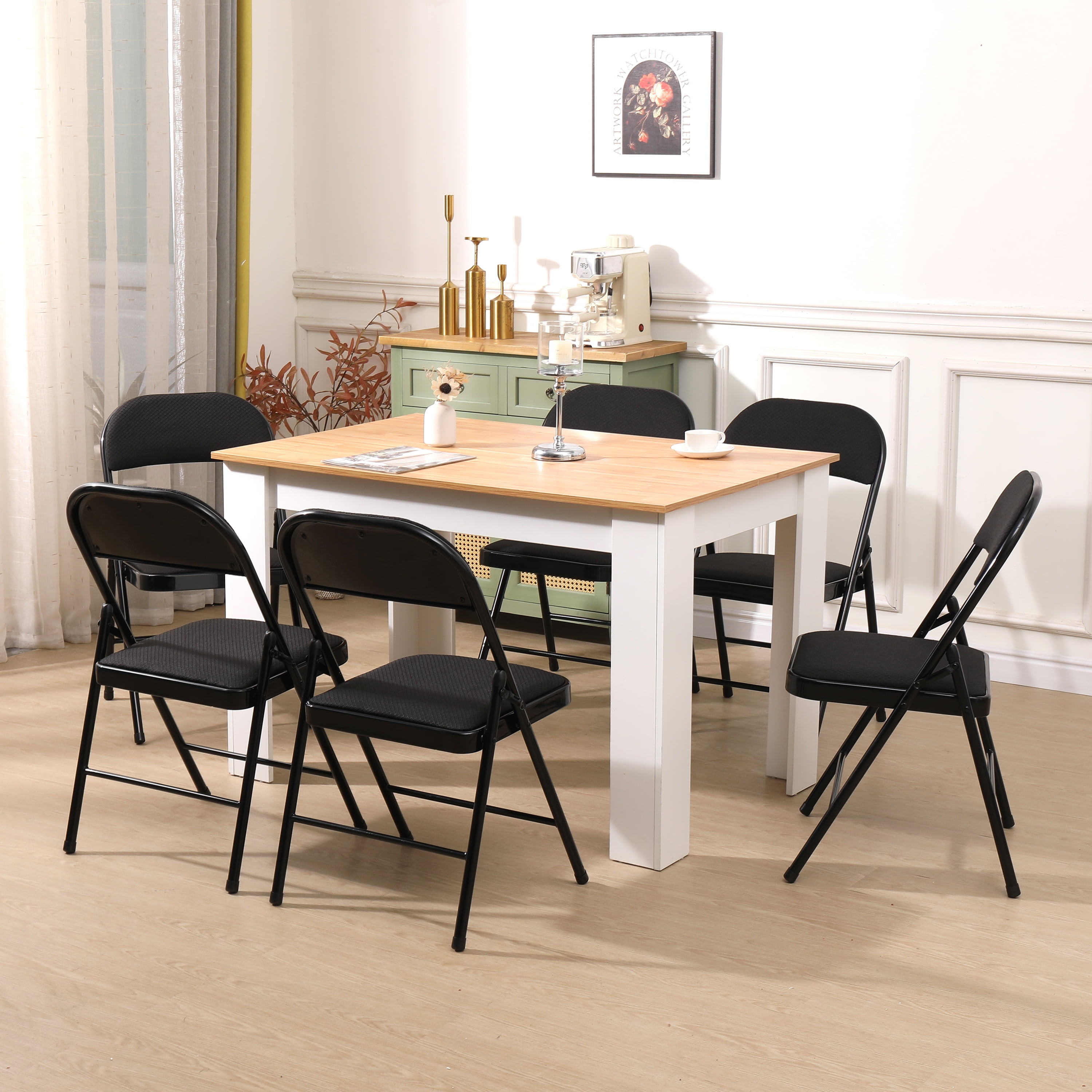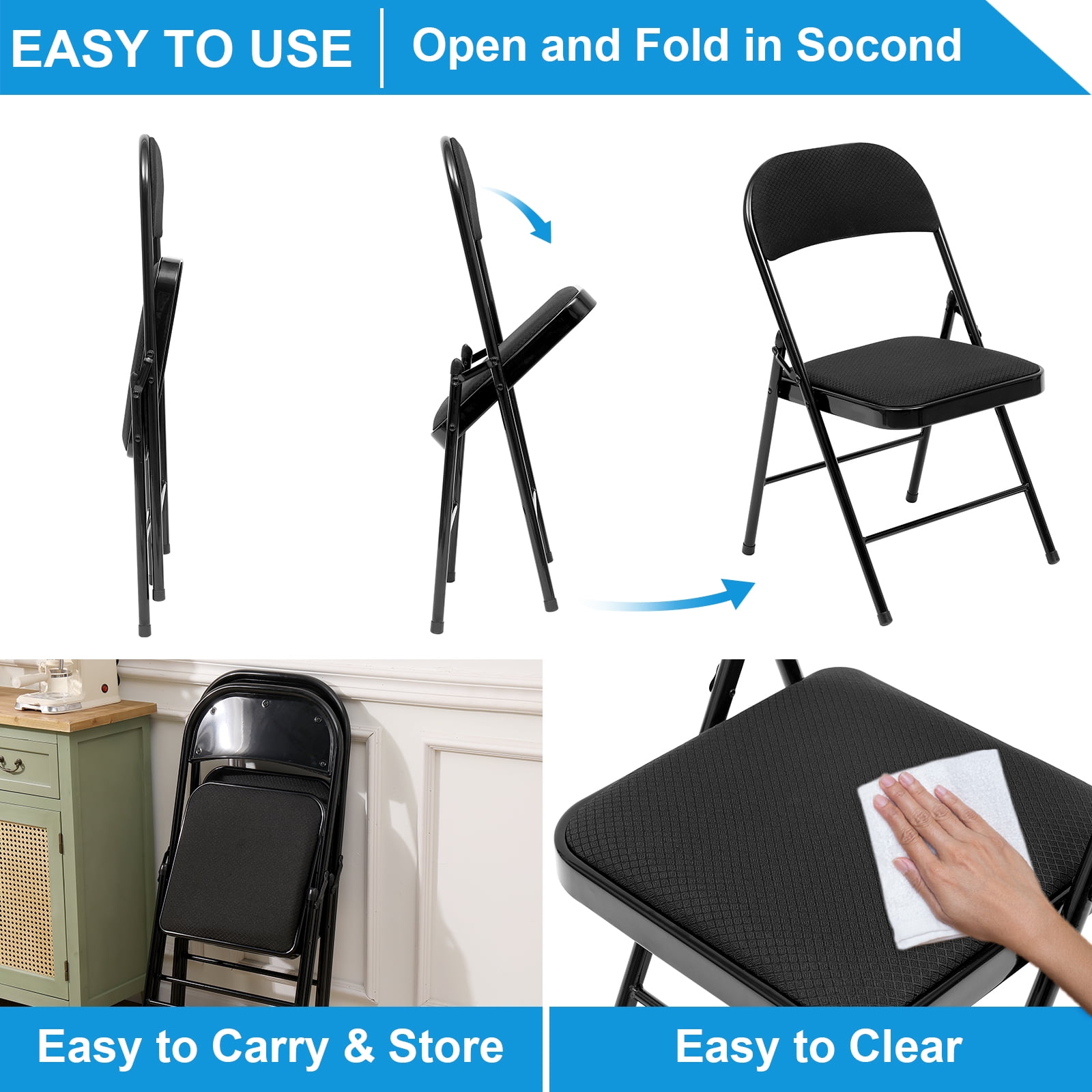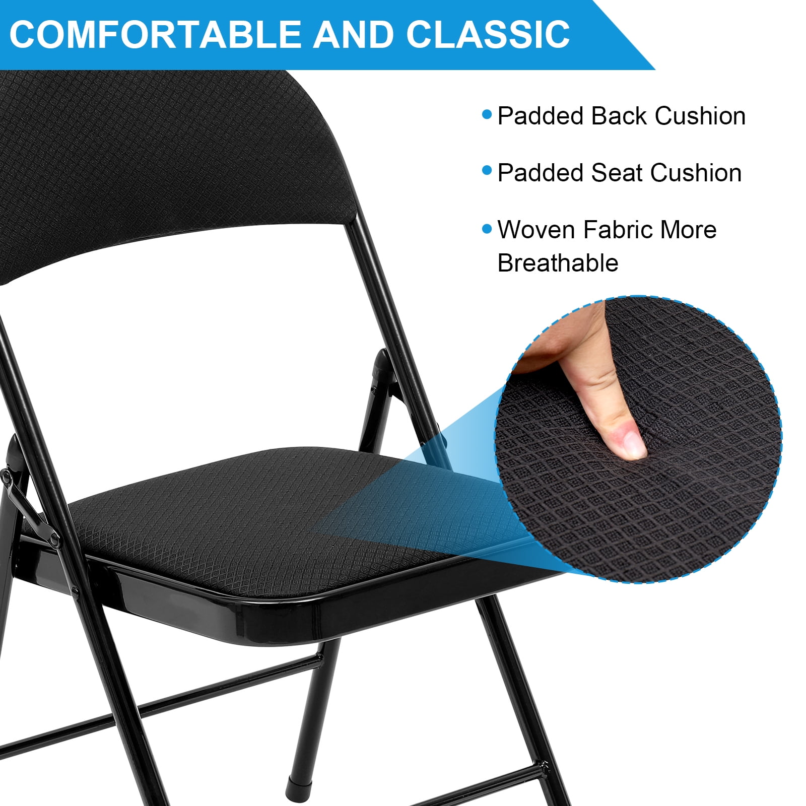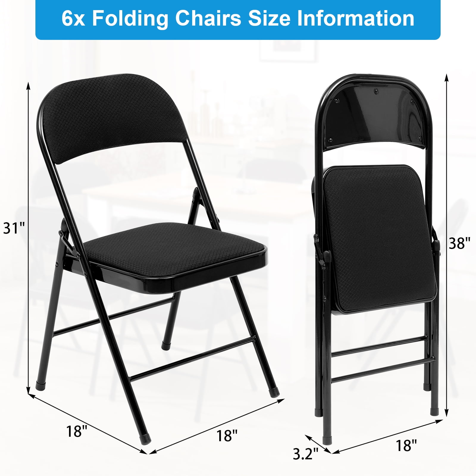[STABLE AND STURD]: Our padded folding chair feature a sturdy steel frame with a padded seat. The triangle structure and non-slip pads ensure stability and durability, both indoors and outdoors, without leaving scratches on the floor. [SPECIFICATIONS]: Dimensions of each folding chair padded are 18″D x 18″W x 31″H. This folding chairs set of 6 is reliable and sturdy, perfect for bedrooms, dorm rooms, apartments, lounging, and gardens. The black folding chairs come pre-assembled and can be used right away. They feature a classic “Y-frame” design with double-riveted leg cross braces and double hinges for added stability. [EASY TO FOLD & NO NEED TO INSTALL]: Our folding chairs with padded seats package includes a 6-pack of chairs that fold up easily for convenient storage. The all-steel structure with double hinges and welded cross braces supports up to 330 lbs. When not in use, the folding padded chairs can be folded flat. Hinges on each side provide extra stability. [NON-SLIP FOOT PADS]: The padded folding chairs 6 pack have non-slip foot pads that prevent floor scratches and keep the chair in place. The 15.75″ x 15.75″ large chair cushion ensures comfortable seating, improving study and Adult work efficiency. [COMFORTABLE FOLDING CHAIR & HIGH-QUALITY SERVICE]: Our metal folding chairs set of 6 are made with high-quality Fabric and thick foam padding, reducing back pressure and leg pain during long periods of sitting. They provide comfortable seating for work or study throughout the day. If you have any questions, please contact us for a satisfactory solution.