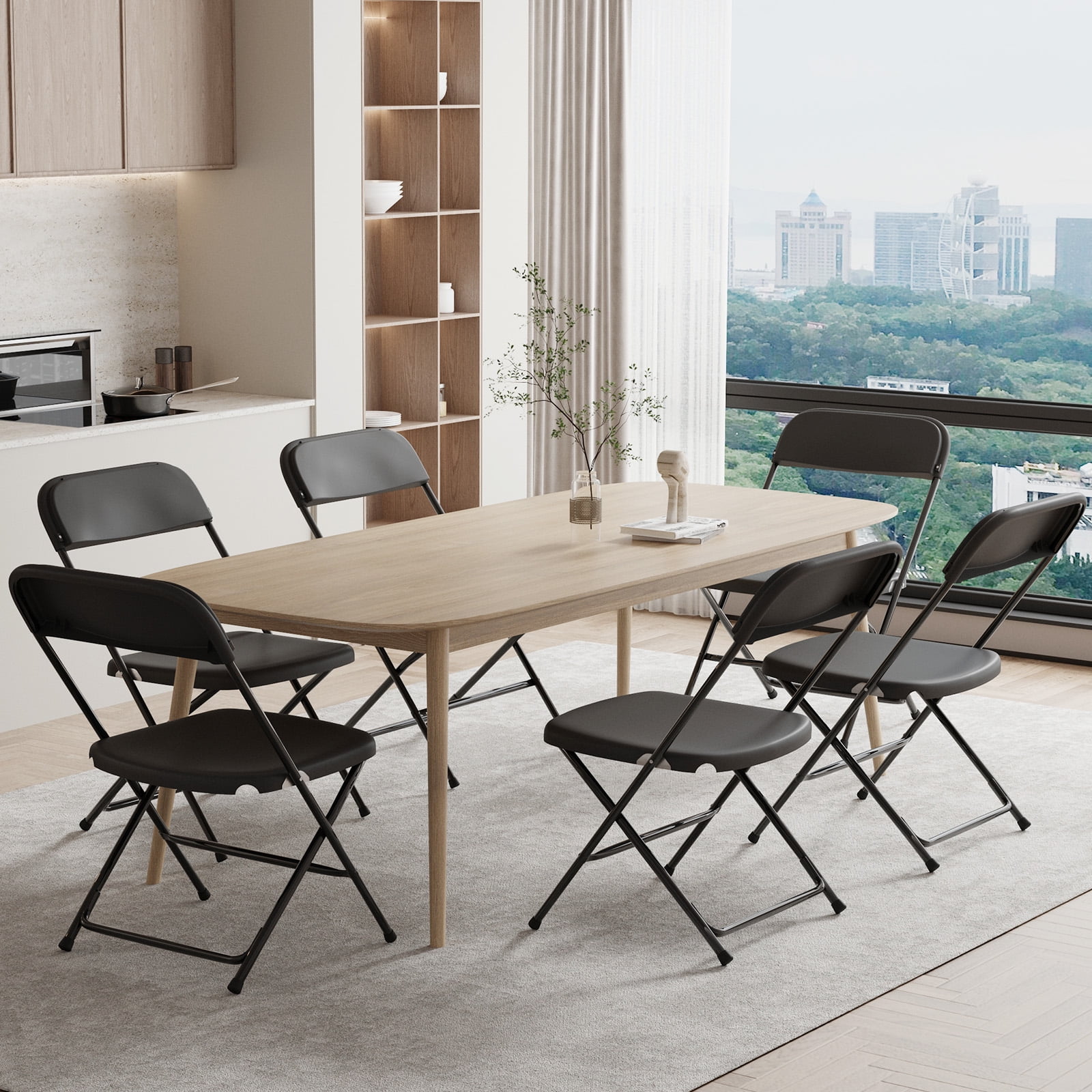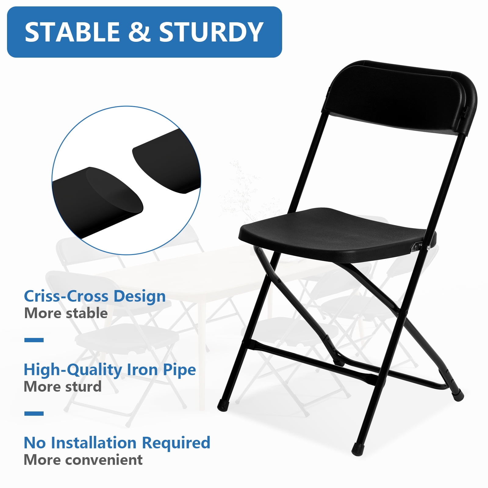 Non-Slip, Floor-Safe Design: Protects surfaces, quiet glide. Versatile for All Events: Ideal for indoor/outdoor adult use. Easy to Clean: Wipeable, resists stains and dirt. 6-Pack, Great Value: Affordable bulk seating option. Space-Saving Foldability: Easy to stack and store. Durable Plastic Build: Long-lasting, reliable quality. Effortless Setup: Quick for events and gatherings. Widely Used: Perfect for schools, offices, homes. 350lb Weight Capacity.