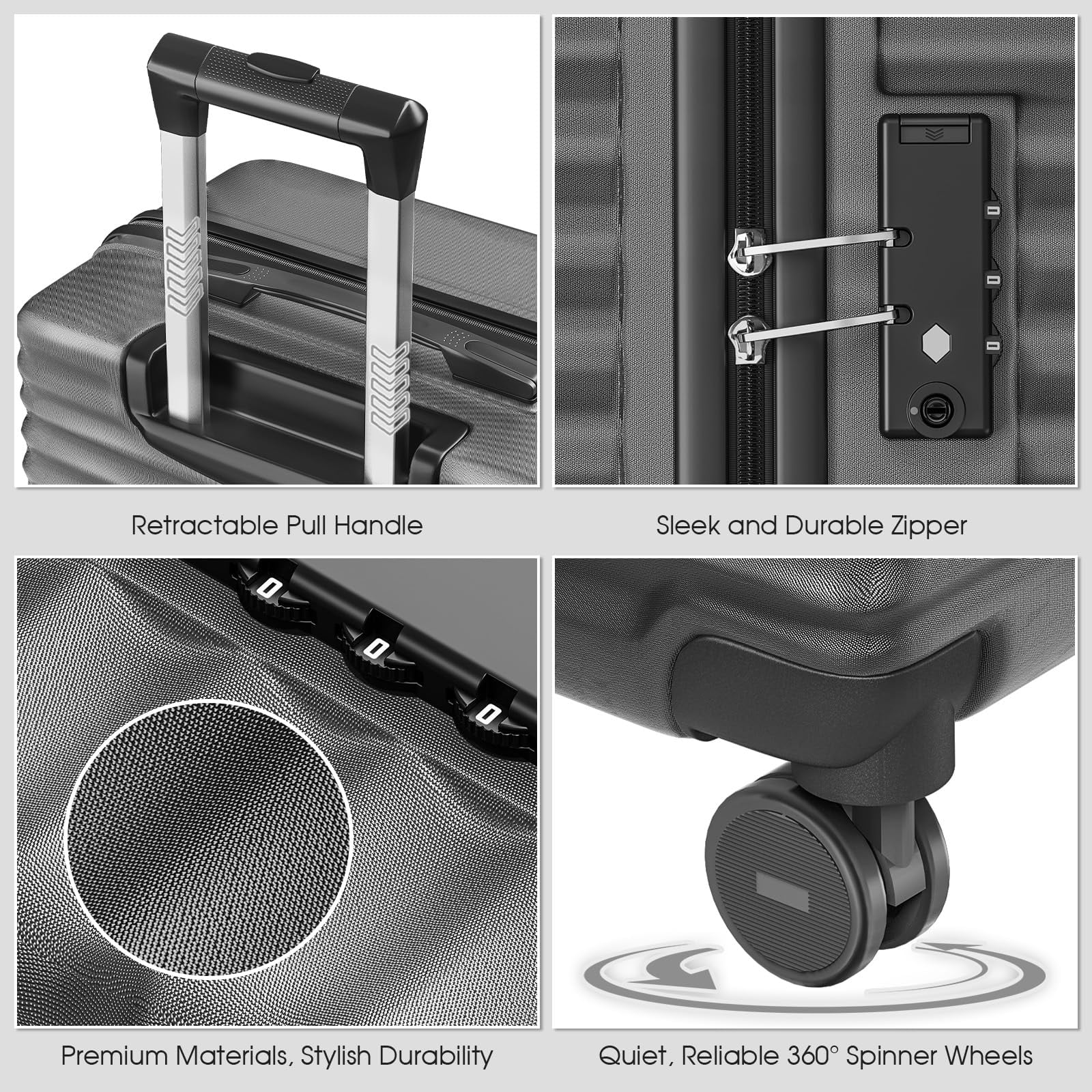 [Perfect for Every Trip] Three suitcase sizes offer flexibility, from weekend getaways to longer journeys, ensuring you always travel comfortably and in style. [Secure TSA Locks] Built-in TSA-approved locks ensure only authorized agents can access your luggage, providing peace of mind and reliable protection throughout your travels. [Quiet & Smooth Wheels] Equipped with 360° silent spinner wheels, glide effortlessly through busy airports and hotel lobbies with minimal noise and maximum ease. [Sturdy & Durable] Constructed from tough ABS material, this luggage set withstands rough handling, keeping your belongings protected trip after trip. [Stylish Rounded Design] Featuring a sleek, rounded shape, these suitcases combine eye-catching aesthetics with practical scratch-resistant protection, adding a stylish touch to your travels.