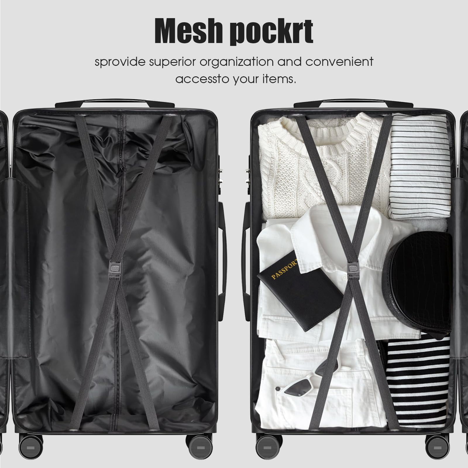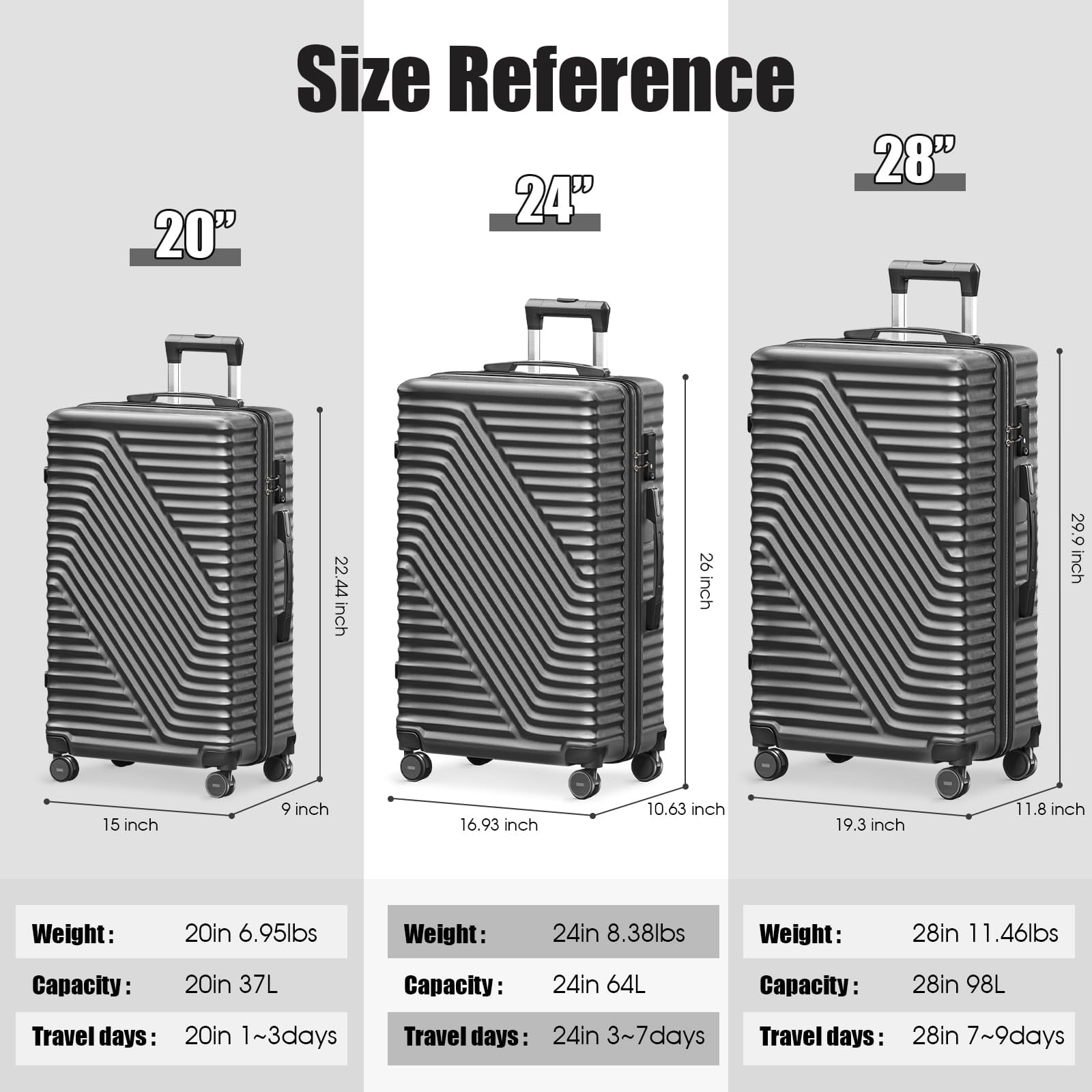 This set is ideal for personal and business travel which is in line with airline standard. It will transport your travel essentials effortlessly and stylishly. The set can be stored inside each other, offering more convenience and saving storage space. What we want to offer our customers is more than a solid case, but the customer’s own style and cool life. Ready to travel with your cool life? 3 piece luggage set 20 inch,24 inch,28 inch upright, can be stored one into another.100% ABS, Lightweight yet extremely durable abs material. Spinner wheels, multidirectional smooth and silent 360°wheels. Upgrade With TSA-Accepted Lock for security and peace of mind. Sturdy ergonomic aluminum telescoping handle Interior mesh zip pocket and elasticated,Squared full-capacity design Weights and Weight Capacity Approx. Dimension: 20inch 22.5″ x 15″ x 9.06″ 24inch 26″x17″ x 10.6″ 28inch 30″ x 19.3″ x 11.8″ Weight: 20inch 6.93lbs 24inch 8.4lbs 28inch 11.4lbs Capacity: 20inch: 37L 24inch: 64L 28inch: 98L