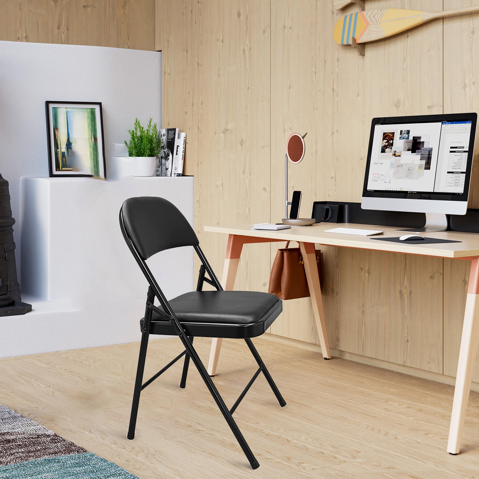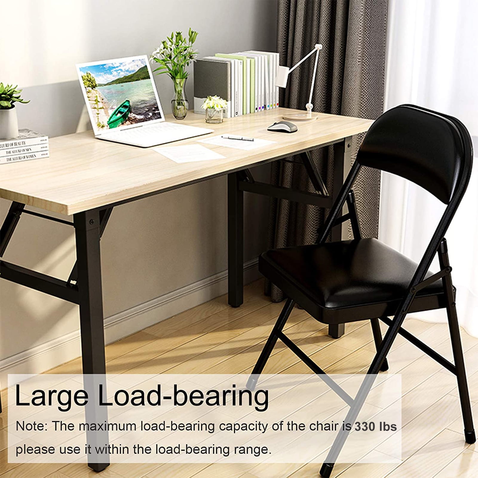 Color: Black Material: Sponge, Steel, PU Product Dimension: 18″L x 18″W x 31″H Folding Size: 18″L x 3.2″W x 38″H Chairs fold flat for convenient storage Plastic leg caps help prevent floor scuffs and scratches 330 pounds weight capacity for adult Rust-resistant powder-coated finish Padded vinyl upholstery on seat and back rest; easy to clean