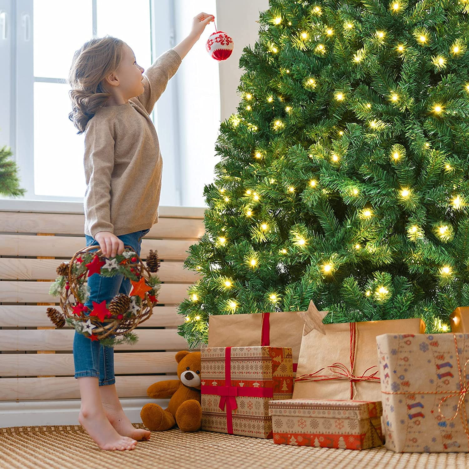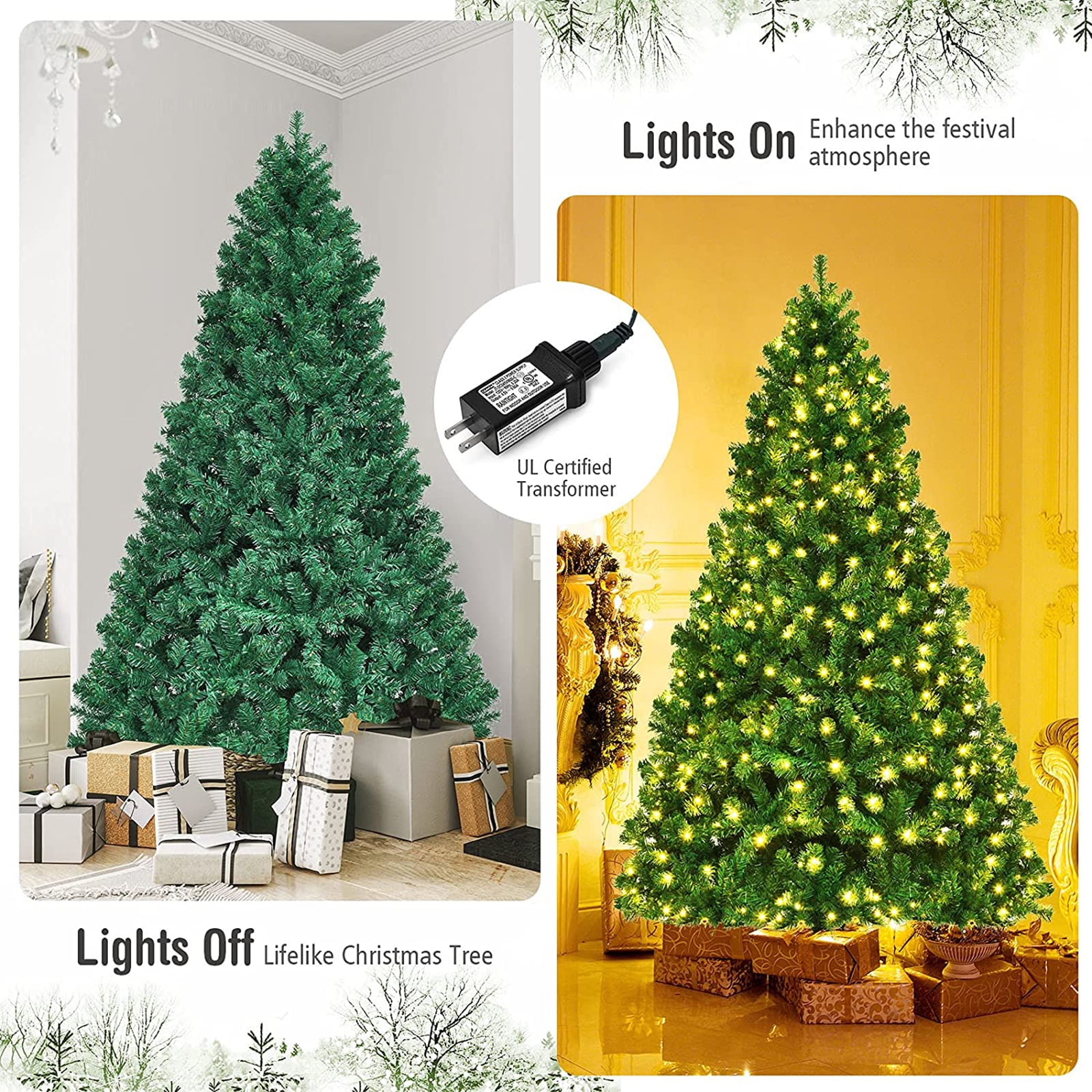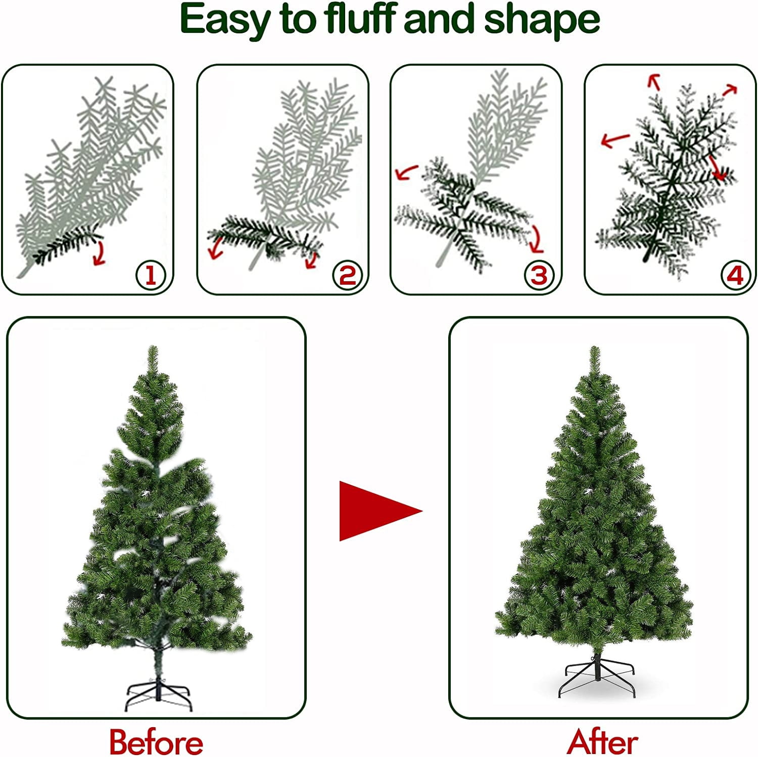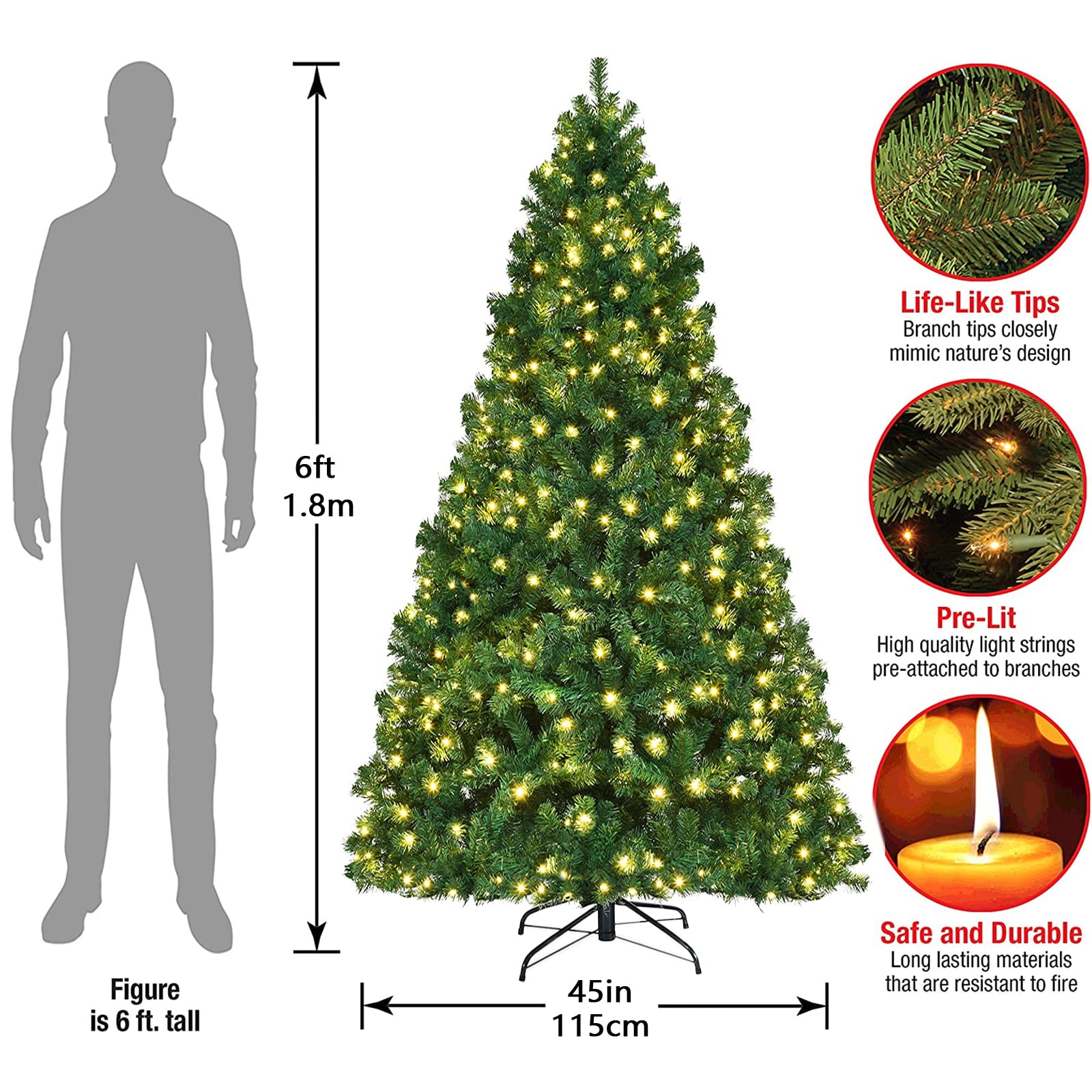 High Quality Material: The blades of the Christmas tree are made of high-quality PVC, non-flammable, non-allergic, makes the tree more real and full. Featuring hundreds of individually crafted branch tips to create full bodied branches, this tree is designed to look and feel lifelike. Eye-catching Design: The Christmas tree comes pre-strung with 1000 LED lights, full and realistic branches, brings a festive glow to your home, the hinged Christmas tree will be an eye-catching centerpiece to any space during holidays, beautiful and festive, blends perfectly with winter scenery. Perfect for Festivals: The Christmas tree with warm white lights adds a winter feel to any decor, thousands of branch tips provide generous amount of space to hang up Christmas ornaments and decor, classic Christmas elements and snow make it a great decor for Christmas and festivals, adds more excitement to your life, makes your family full of Christmas atmosphere. Sturdy Metal Stand: SUGIFT Christmas trees use sturdy metal stand, built to endure many holidays, provide strong support for the tree and ensure stability, serve you for a long time. Easy to assemble: The assembly can be finished in a few steps with 3 sections. Convenient hinged branches and folding metal stand allow for easy assembly, dismantling and storing. You can adjust the branches with an elegant look. Specifications Color: Green Material: Metal, Plastic Tree Type: Fir Number of Lights: 250 Number of Branch Tips: 1000 Assembly Required: Yes