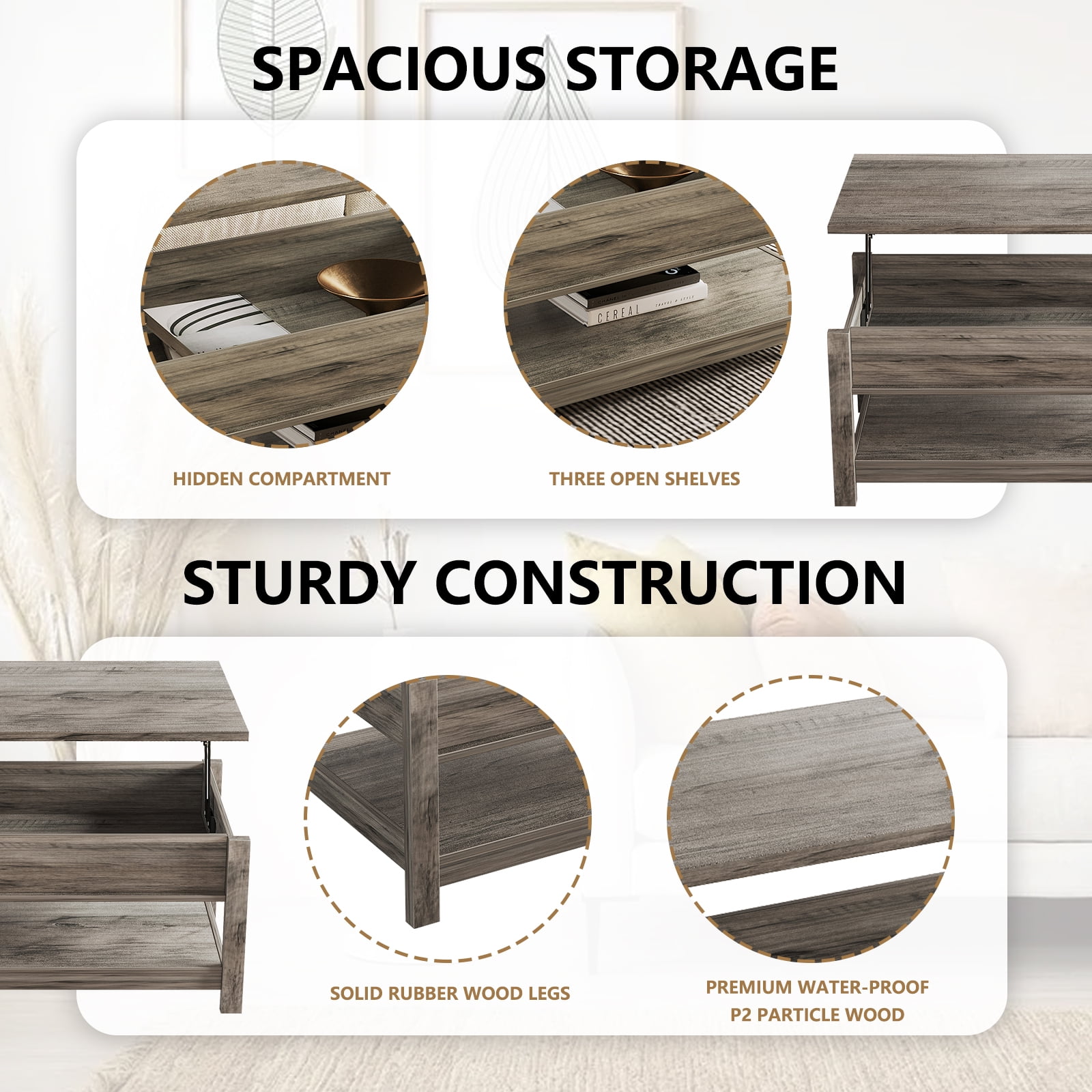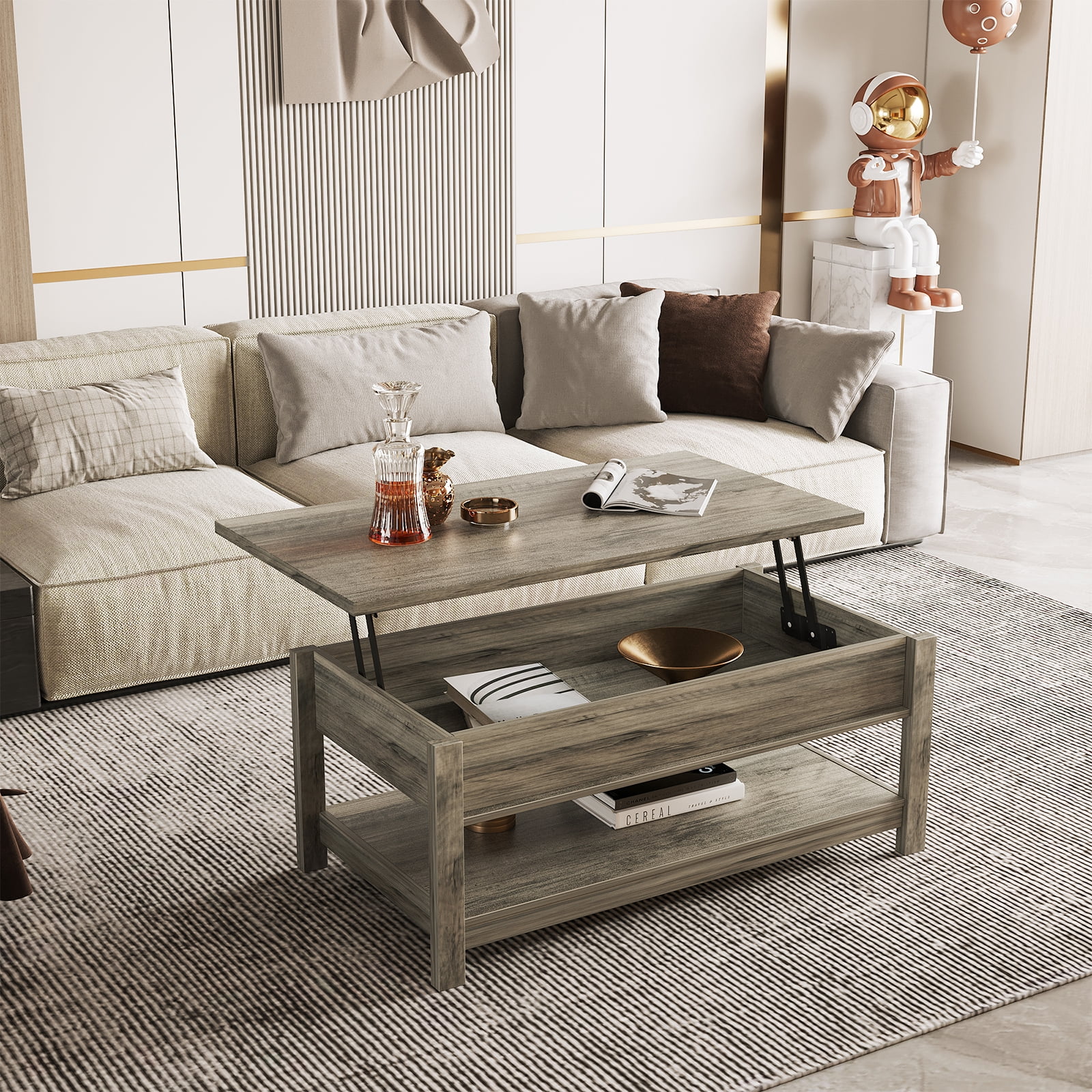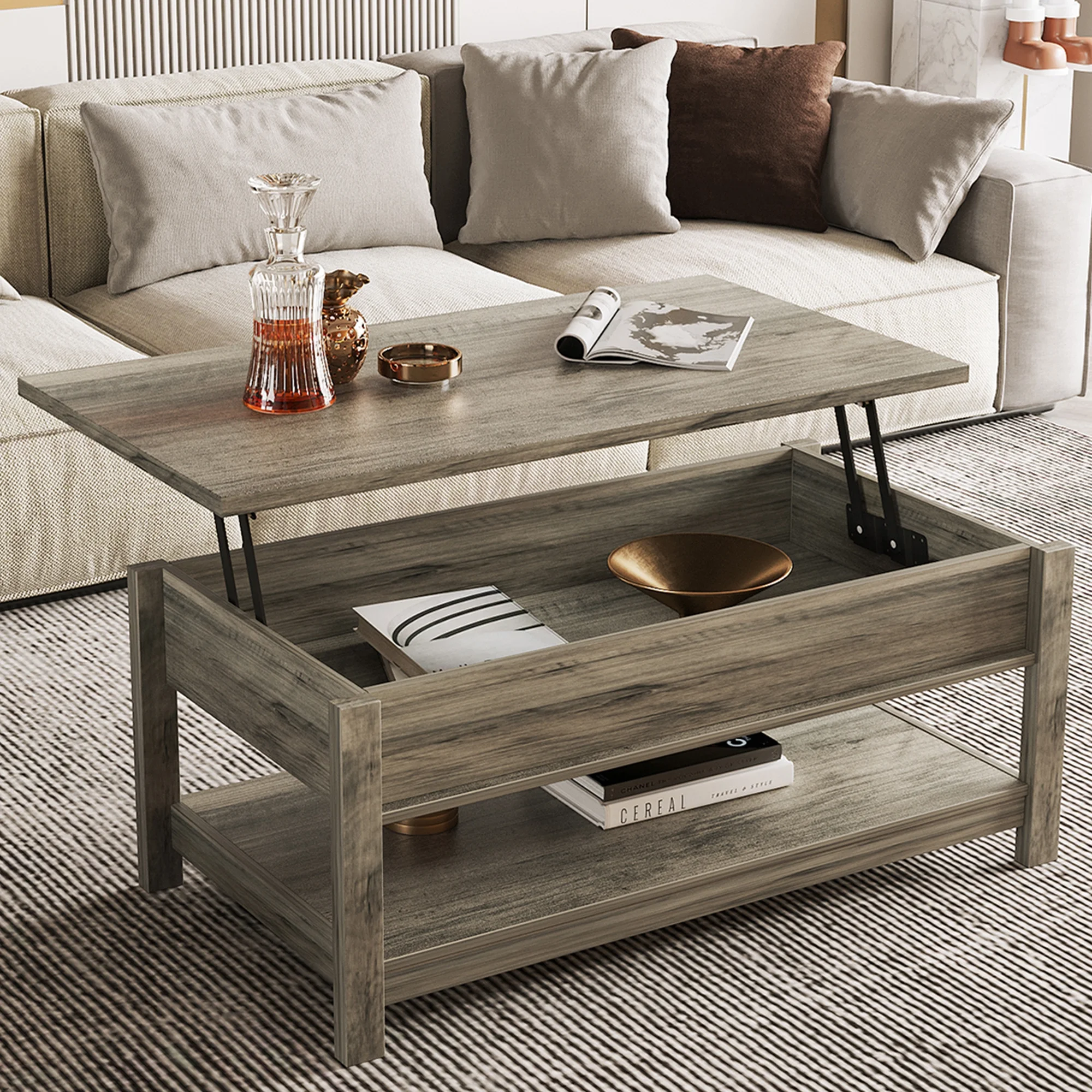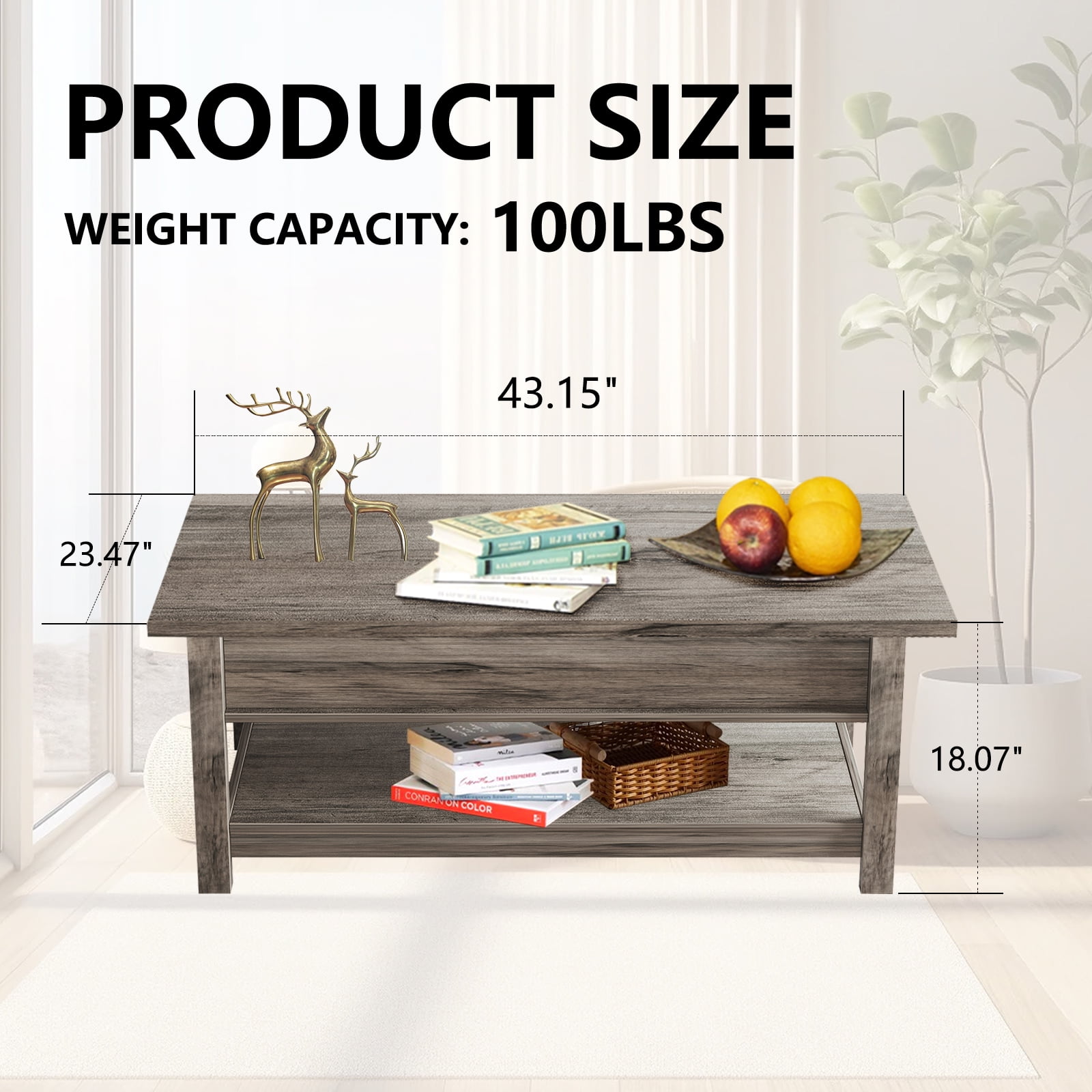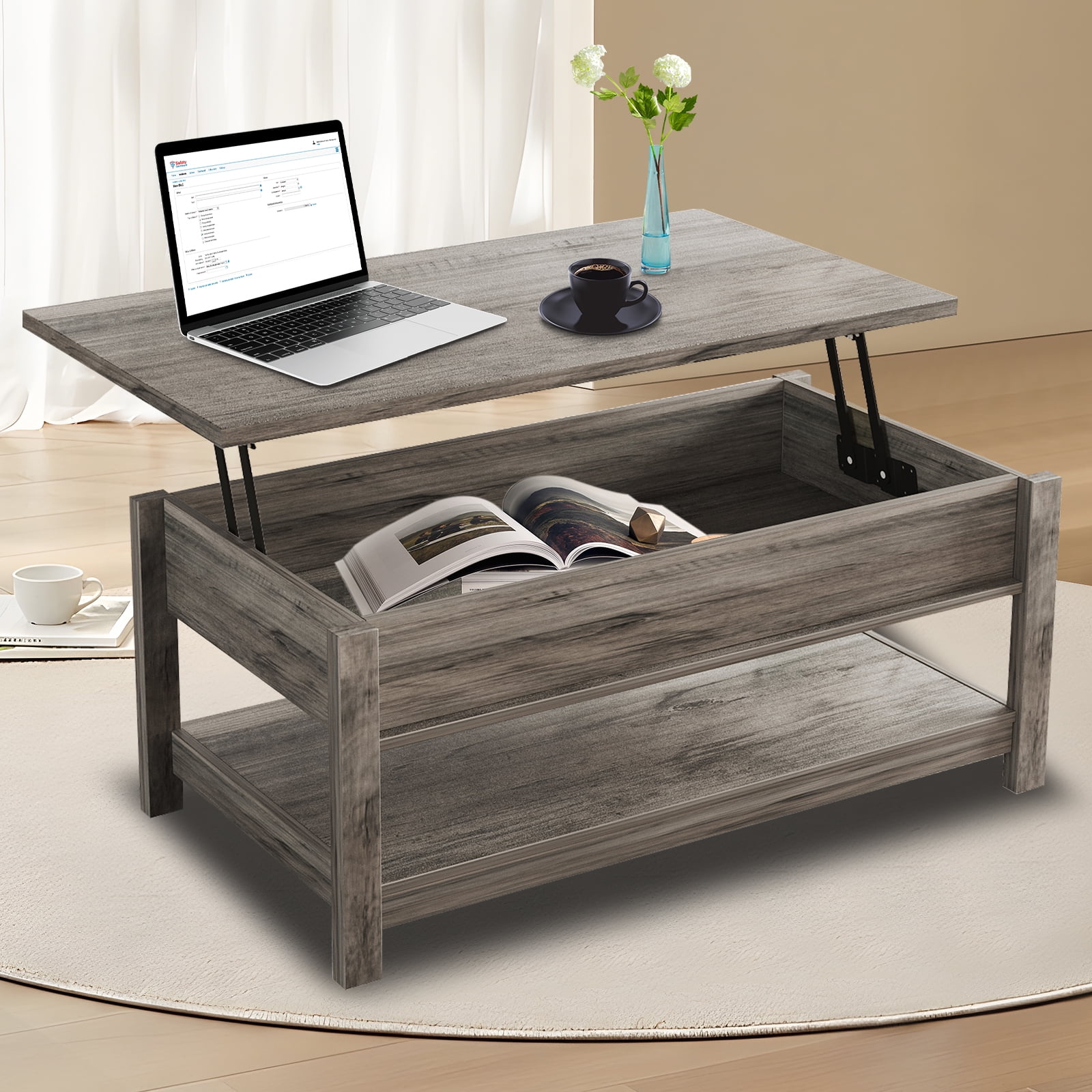 About this item 【Lift-top Design】: The high-quality lifting top mechanism enables the desktop to be raised and lowered easily and silently. When you are sitting on the sofa, it is perfect for working, dining and extra storage in the living room or office. 【Spacious Storage】: Open the modern coffee table, you can store the laptop, chess, remote control, game controller, blankets, books, toys, and other common items under the table, convenient and not dirty. 【Sturdy & Durable Structure】: This lifting top coffee table is made of EPA standard particleboard, which is strong, waterproof and easy to clean, providing you with a safe and healthy living environment. The solid wooden legs can not shake or tilt after being assembled correctly. 【Modern Style for Multiple Use】: Coming with clean lines and modern appearance, the coffee table matches well with various of decorations and adds a touch of elegance to your room. It combines both fashion and versatility for your home, which is suitable for office, living room, study or any other space. 【Easy Assembly】: Our coffee table comes with instructions for the required parts and an illustrated installation manual to ensure that you can assemble this table quickly and easily. If you have any questions about the product, please feel free to contact us, we will reply you within 24 hours. Specifications: Color: Rustic Gray Material:E1 grade particle board Product size: 43.3x 23.6 x 18.1 inches E1 grade particleboard thickness: 0.59 inches Package Contents: 1 x Coffee Table 1 x Accessory Pack 1 x English Manual