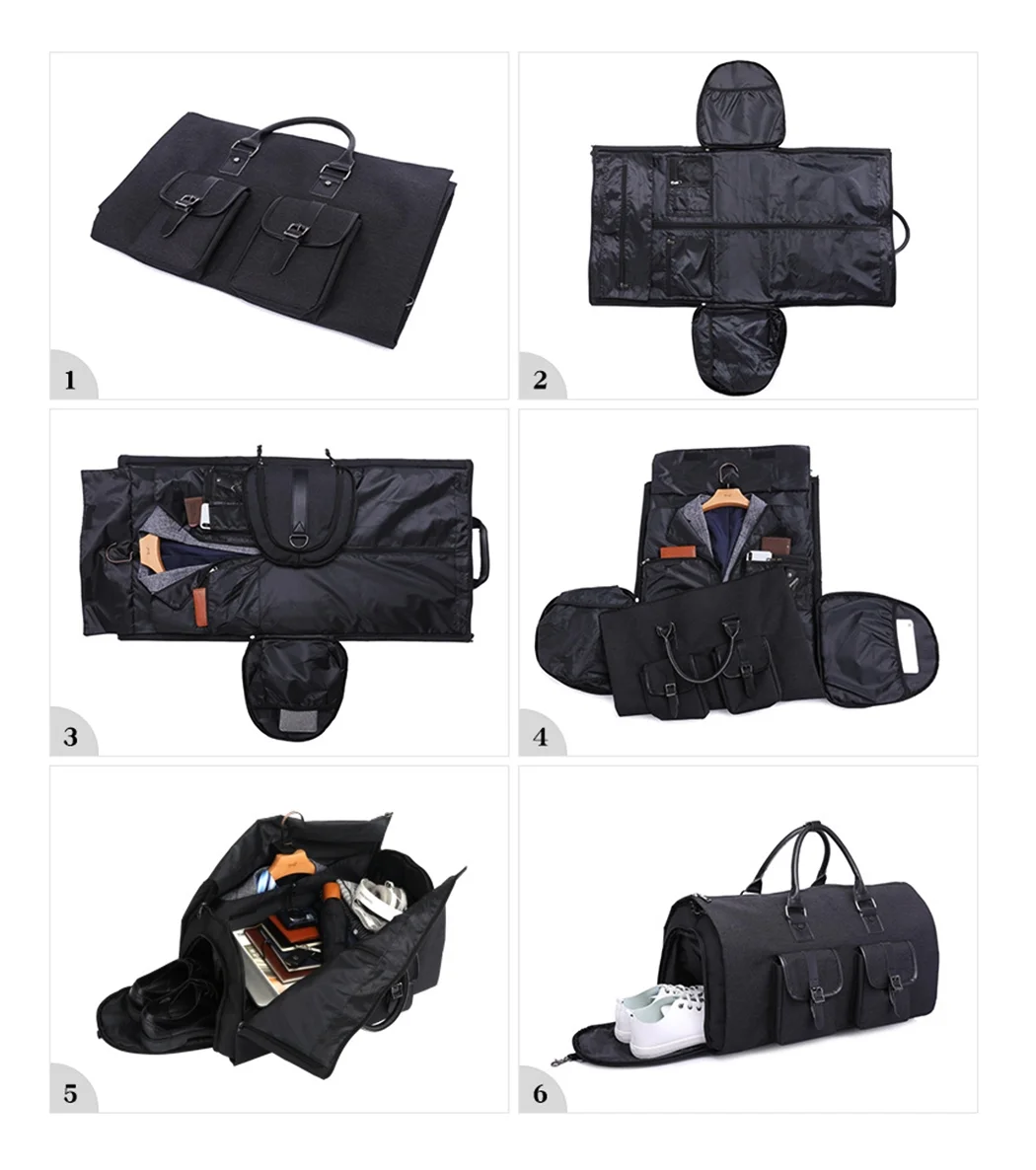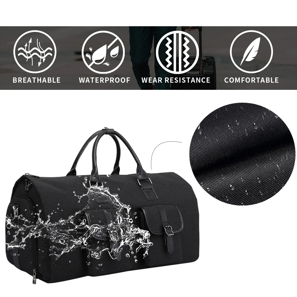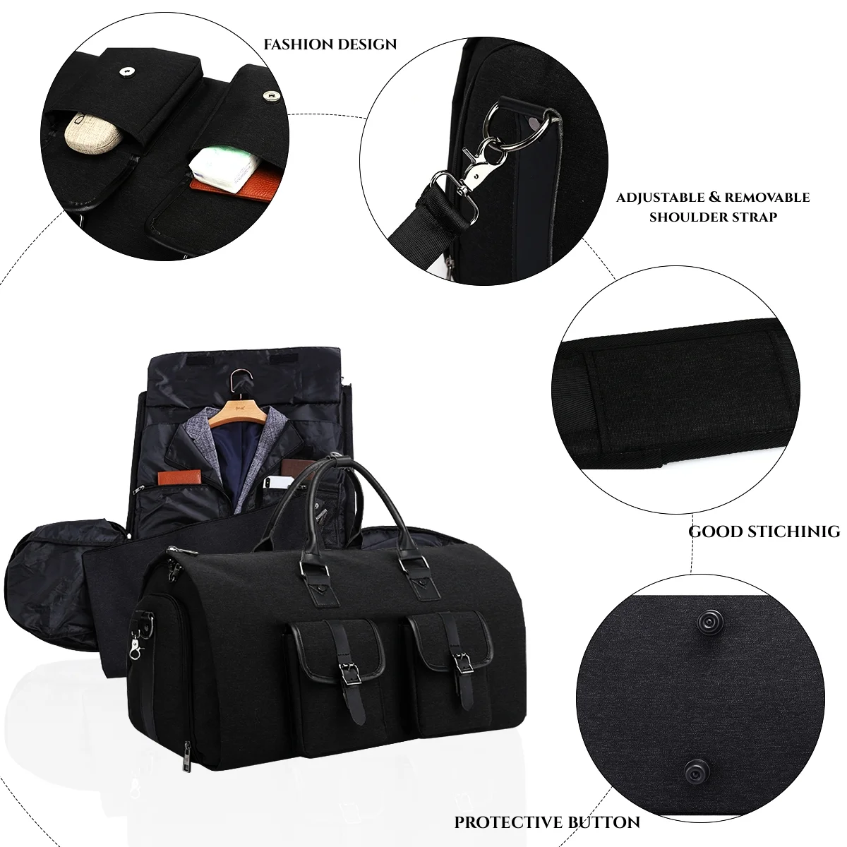 Garment bag designed for travel Combines functionality of a garment bag with the convenience of a duffel bag Doubles as a hanging garment bag to keep clothes wrinkle-free Spacious design holds up to 45 liters, ideal for weekend trips or gym use Includes two side pockets for shoes and small items like passports and keys Meets carry-on requirements for most airlines Durable and water-resistant polyester fiber construction Features an adjustable detachable shoulder strap for comfort