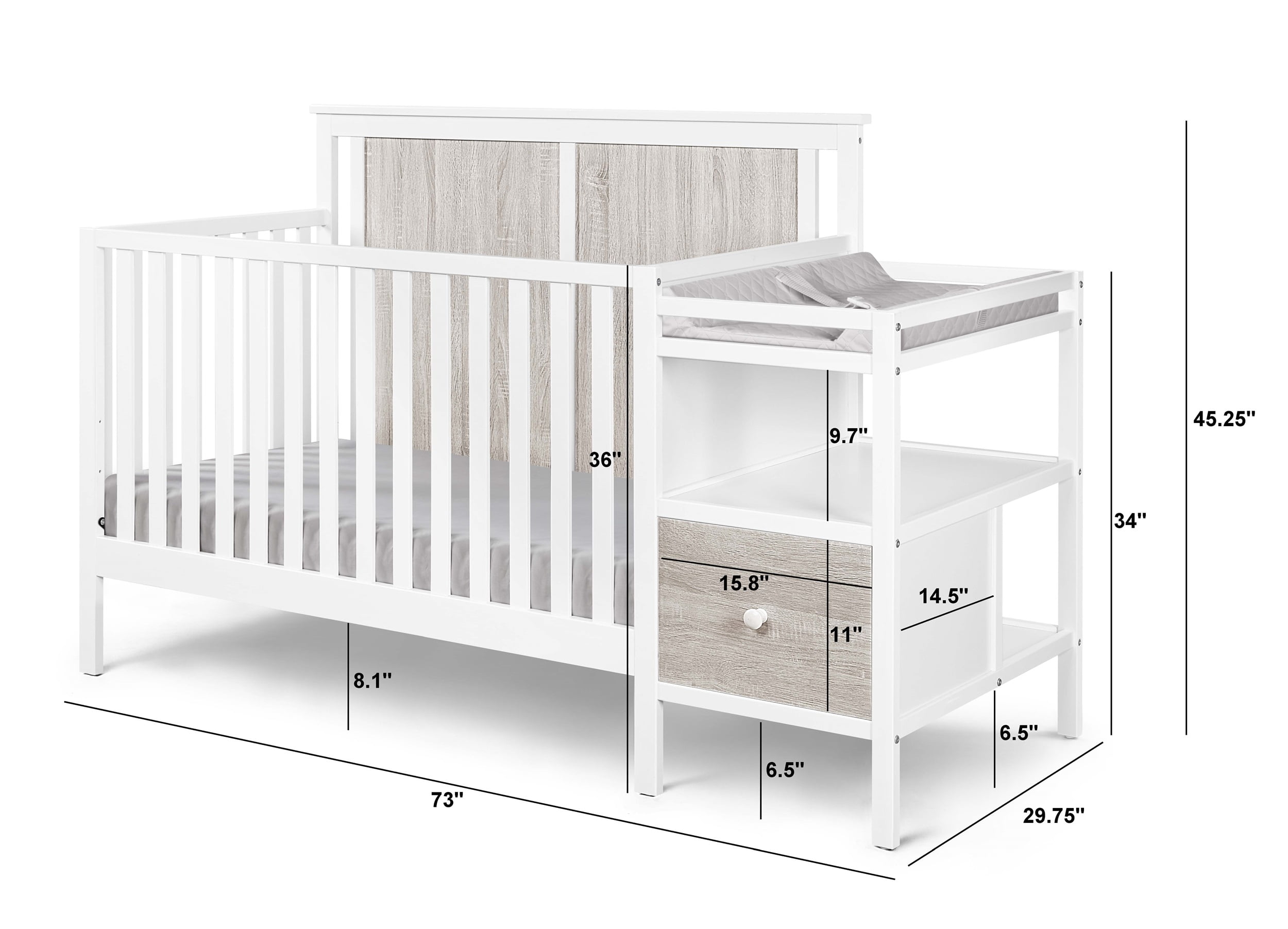 Crib and Changer combination 3 adjustable mattress heights for convenience when baby learns to sit or stand Reversible Headboard and footboard with decorative veneers on one side, solid finish on the opposite Non-toxic nursery safe finishes Baby safety is our priority. JPMA tested and certified as well as meeting and or exceeding all CPSC and ASTM standards Converts to toddler bed and day bed with purchase of additional rails