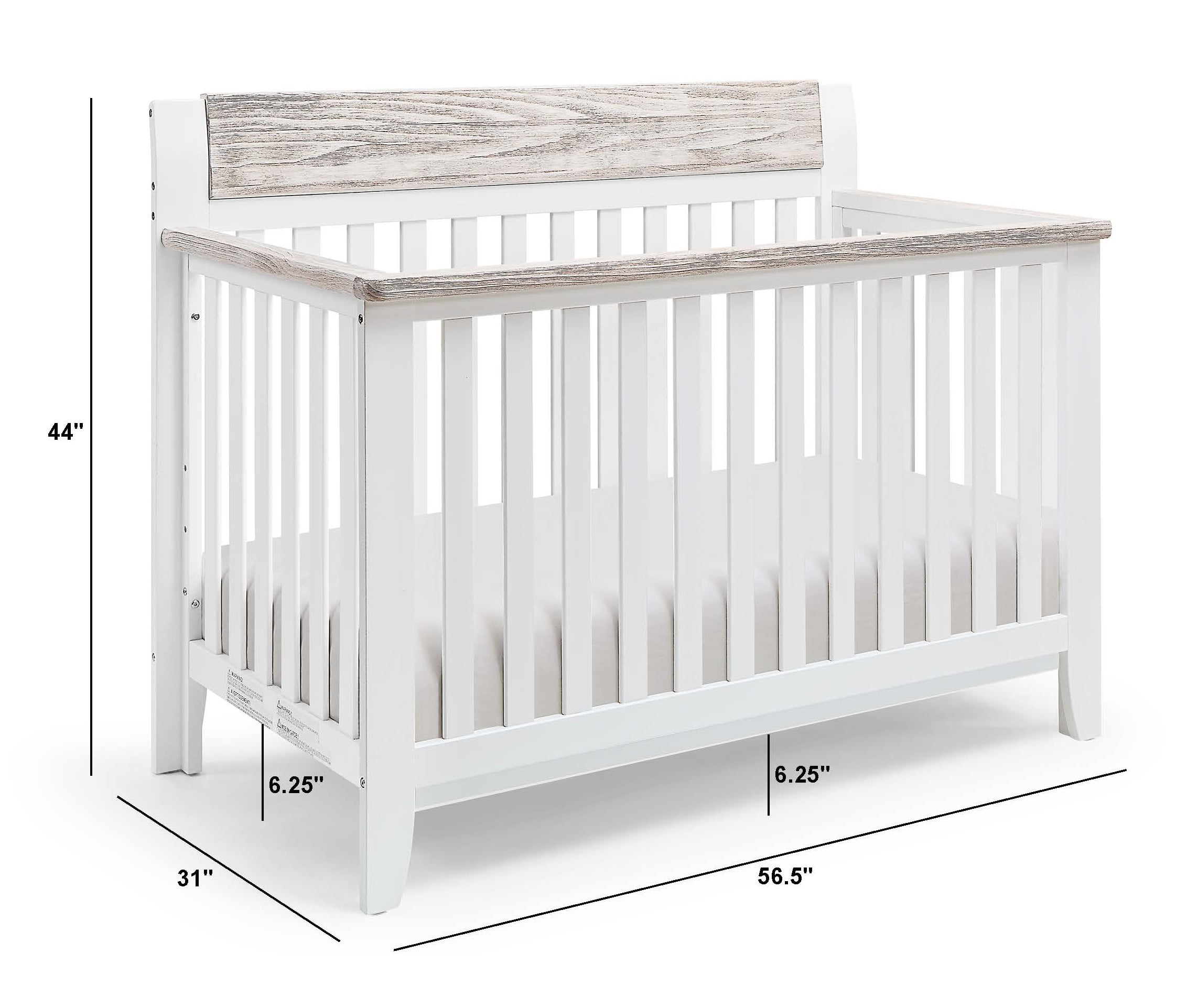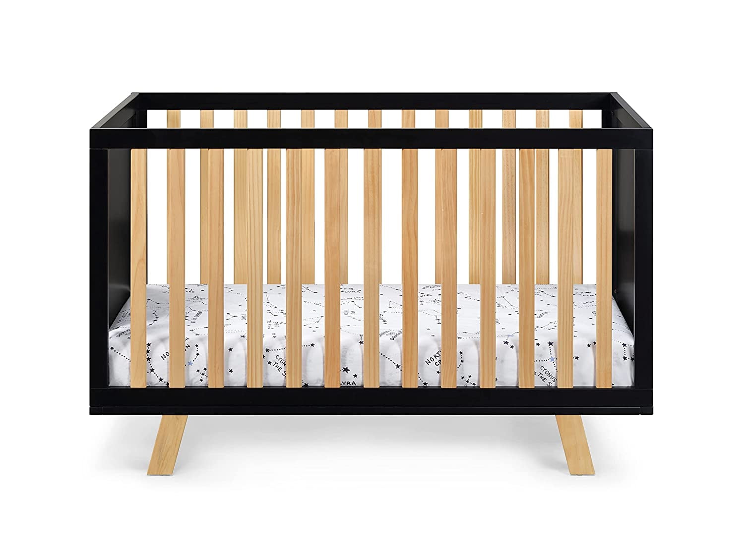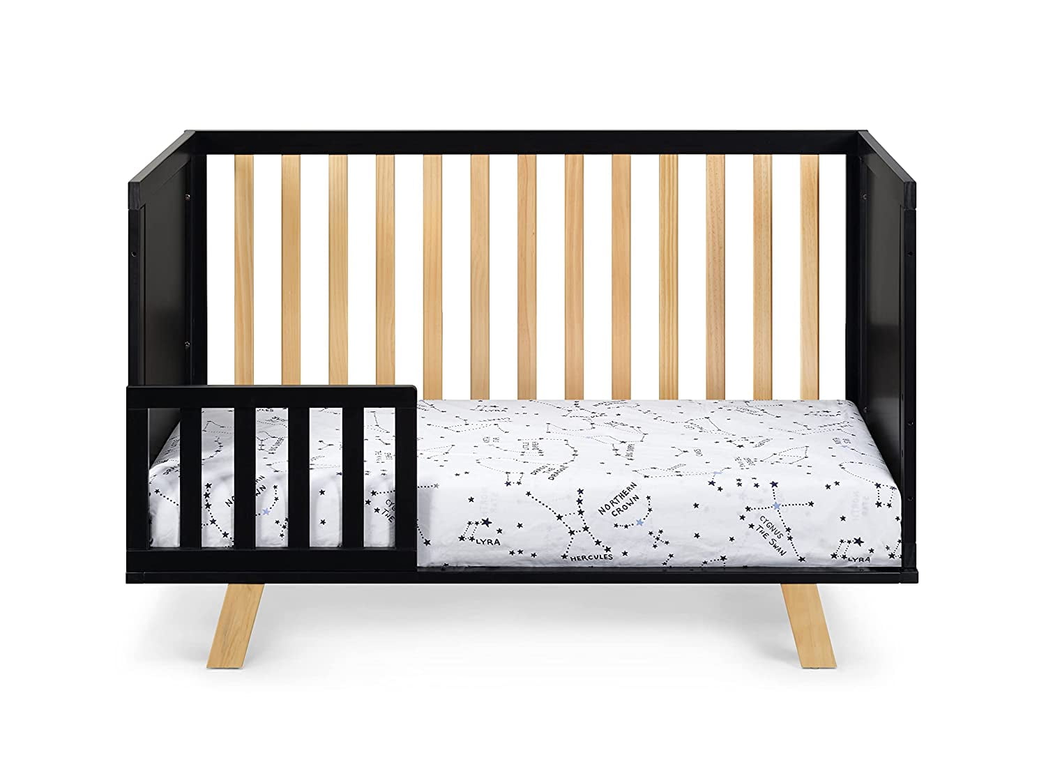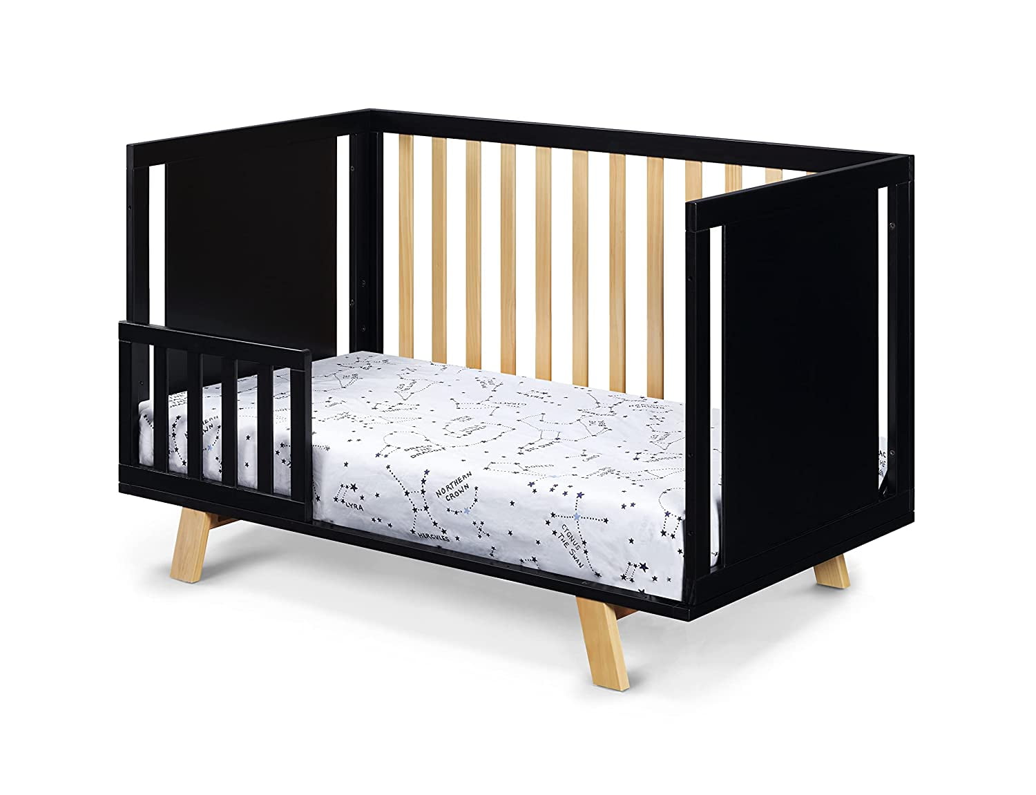 Easily converts to a daybed, toddler bed, or full-size bed with the purchase of additional rails Features 3 adjustable mattress heights for convenience as baby learns to sit or stand Fits a standard size crib mattress (sold separately) Non-toxic, baby-safe finishes Solid wood and black in color