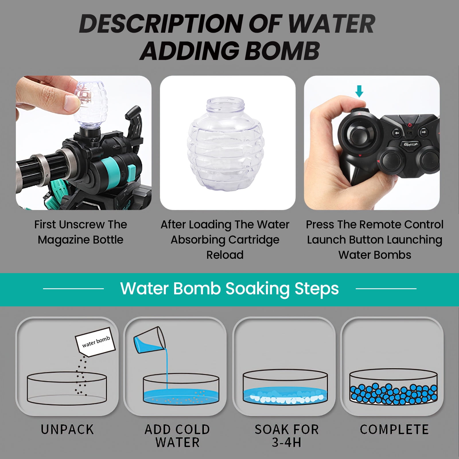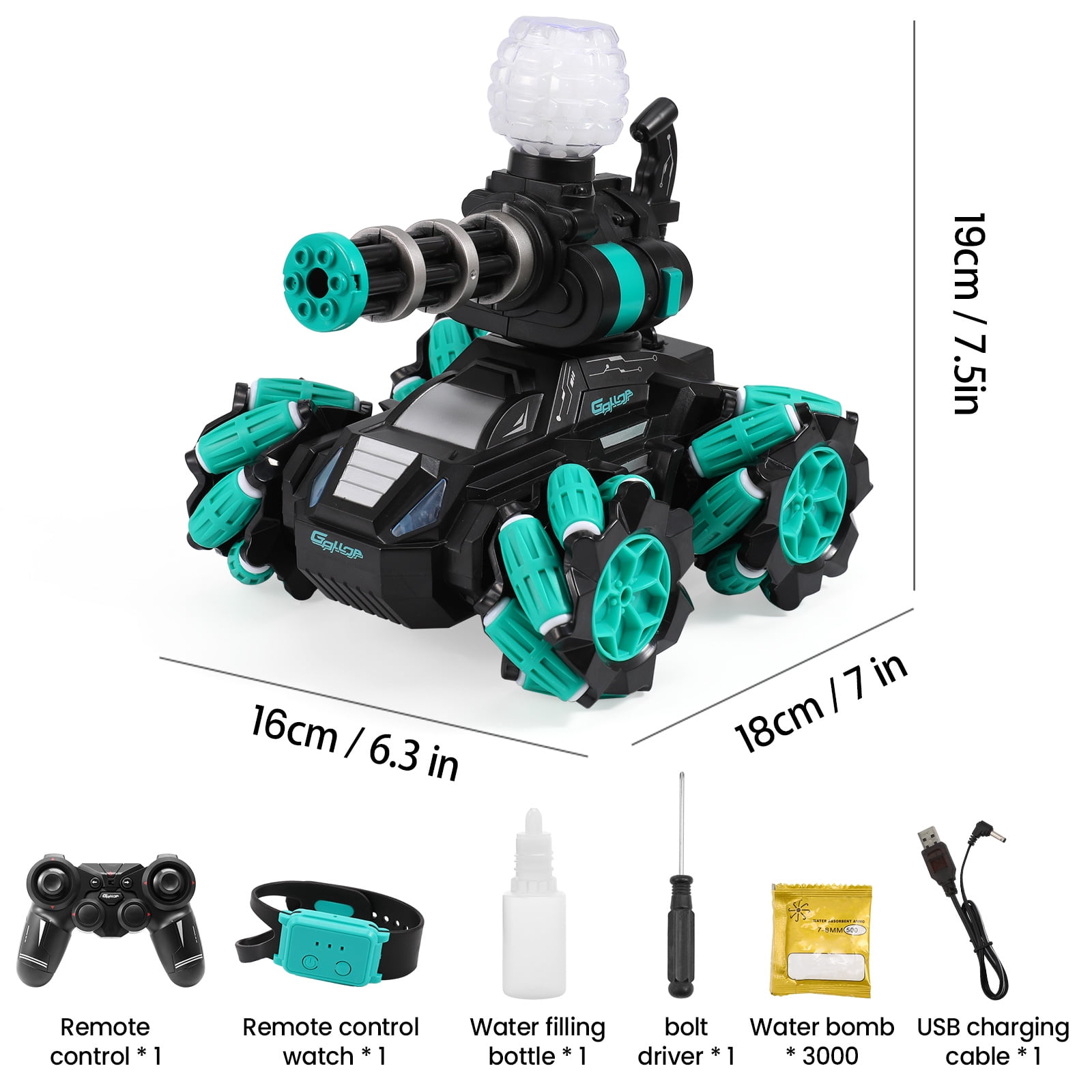 The water bomb armored vehicle is an intelligent car that integrates remote control driving and launching water bombs. Features: 【RC Intelligent Tank】Our RC Tank is in an ingenious design that integrates remote driving and launching water bullets. Intelligent control system and ingenious tires allow the rc truck to process up to 3 driving modes, which comprises forward/backward, left and right horizontal driving and 45 degree drifting sideways. It comes with a super cool LED light and a sprayer, bringing you a great visual experience. 【180 Degree Rotating Turret】The turret can rotate 180 degrees left and right, shoot in all directions and wipe the enemy. It can bring you a happy and fun shooting game experience as well as training kids’ shooting ability. 2 packs of water marbles for 3,000 rounds of fun. 【Music Dancing Demo】It have automatic demo function to show you more driving skills. There is a total of 3pcs of dance music. It can be programmed with one key, and can sing and dance with one key. Compared with ordinary rc cars, this tank can bring you more fun. 【Support Multiple Player】2.4 GHz remote control system offer a stable signal and it has an non-jamming function which allow multiple users play at the same time with no interference, and the remote control range about 100ft. 【Longer Play Time】Equipped with a 500mAh rechargeable battery, it is more durable than other regular remote controlled tank, use up to 1 hour. The perfect rc tank toy is a must-have gift for the birthday or Christmas Day to giving a deep childhood impression. Specifications: Material: ABS Size: 19 x 16 x 18cm Color: Green Battery capacity: 500mAh Battery life: 1 hour Charging time: 1 hour Remote control distance: 164ft Package Includes: 1 x Tank car 1 x Remote control 1 x Remote control watch 1 x Screwdriver 1 x USB charging cable 1 x Water bottle 2 Pack x 1500 Water bomb 1 x Manual