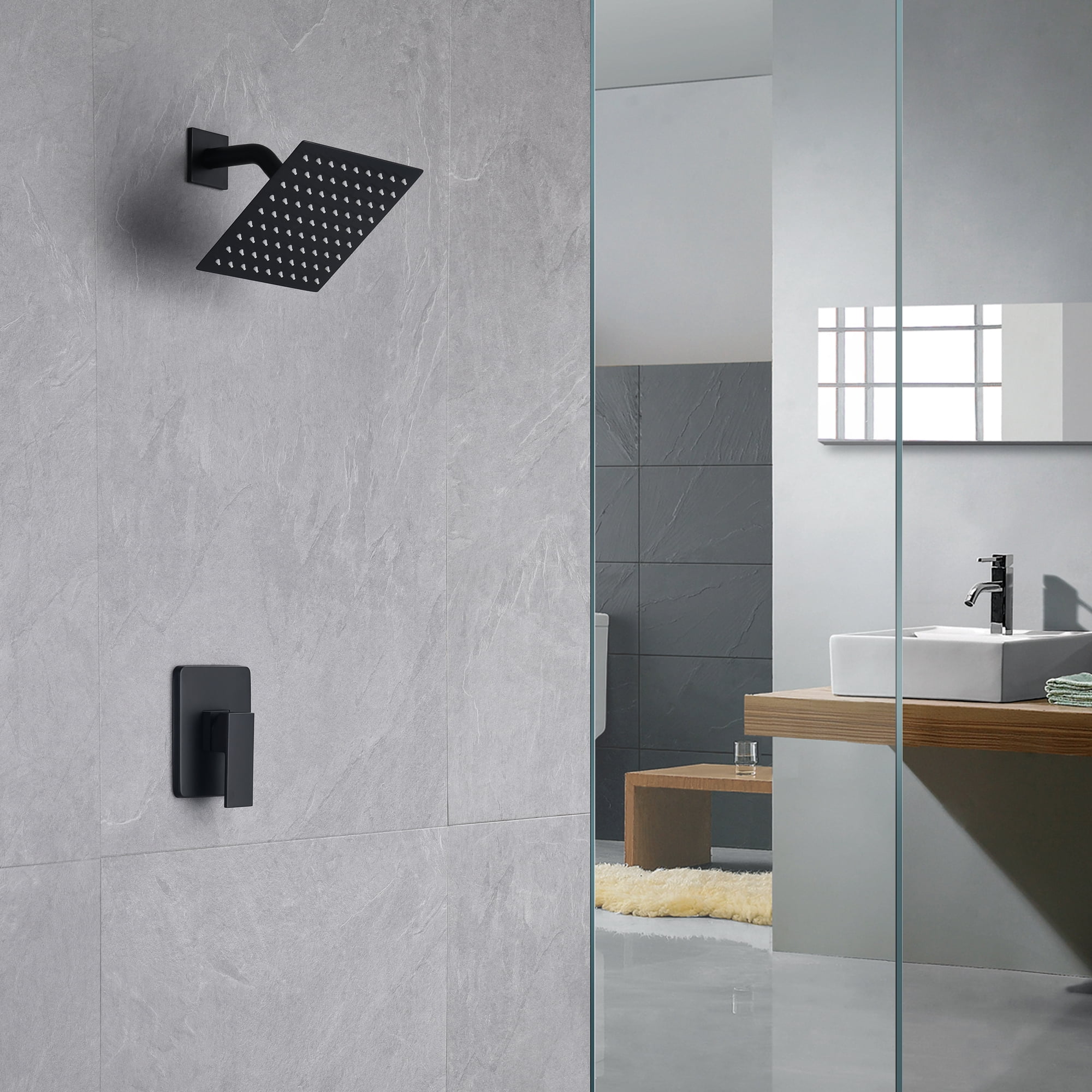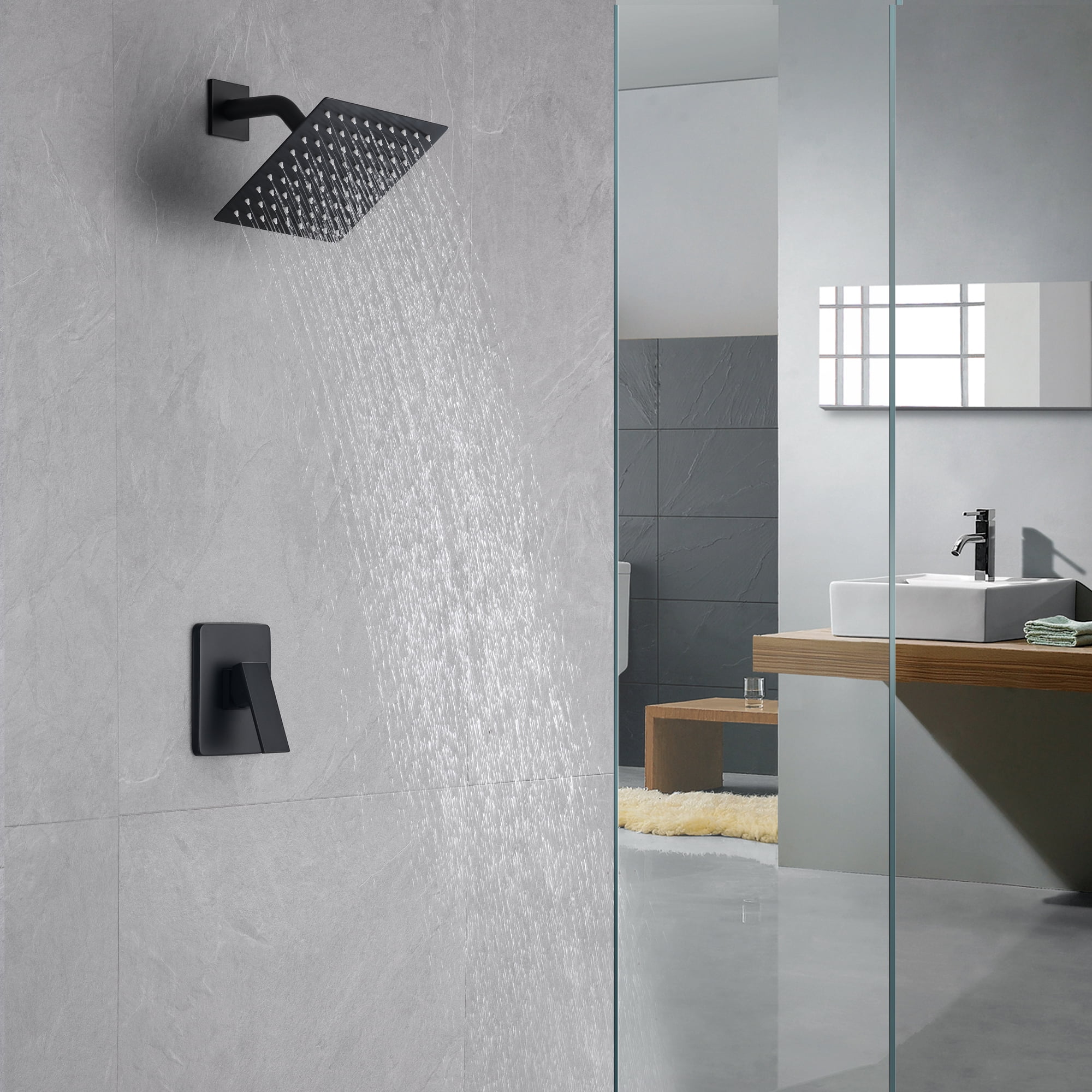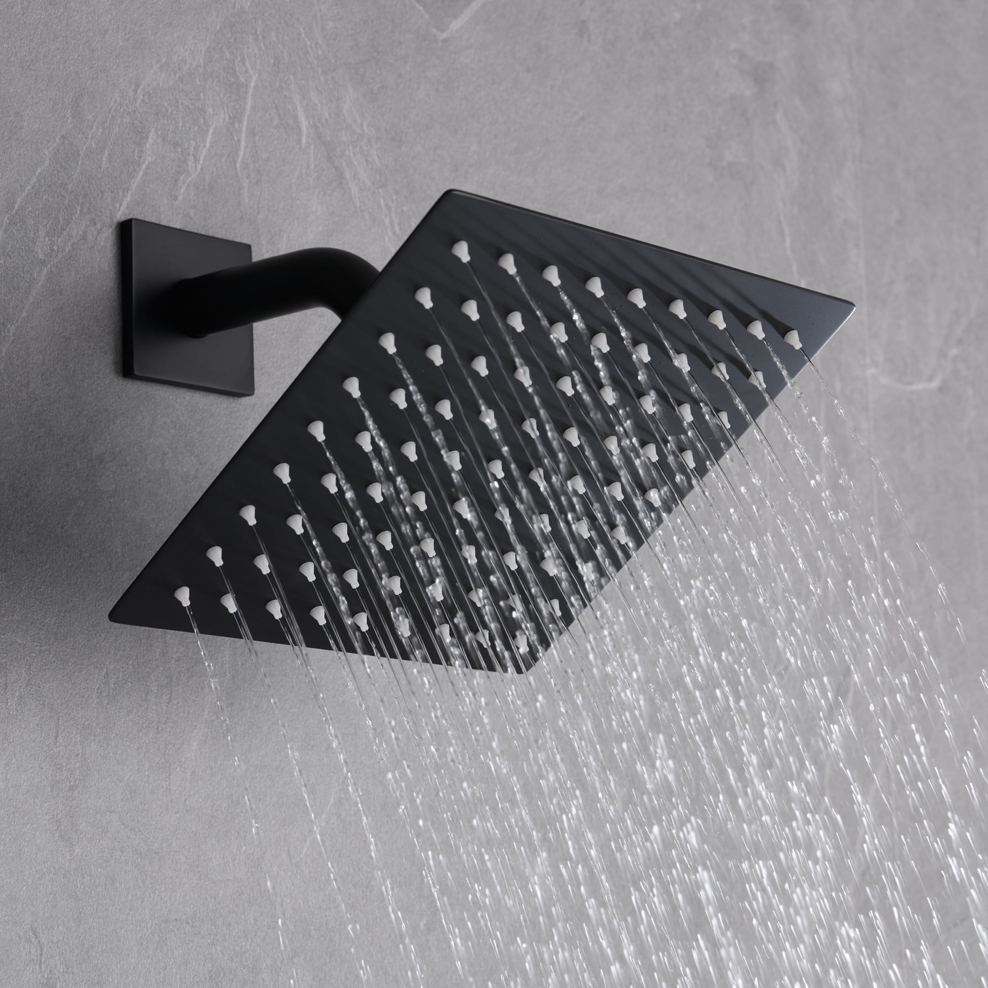 Sumerain, Faucet Showerhead, Matte Black, 8 inch Matte Black Finish: Resists corrosion and tarnishing, ensuring long-lasting use Solid Brass Valve: Provides enhanced durability and reliability Complete Set: Includes rough-in valve, 8″ square rain shower head, shower arm, single handle, escutcheon, and installation accessories Standard 1/2″ Connections: Designed for easy installation with US 1/2 NPT plumbing connections Drip-Free Cartridge: Features a ceramic cartridge tested for 600,000 uses, ensuring a leak-free experience