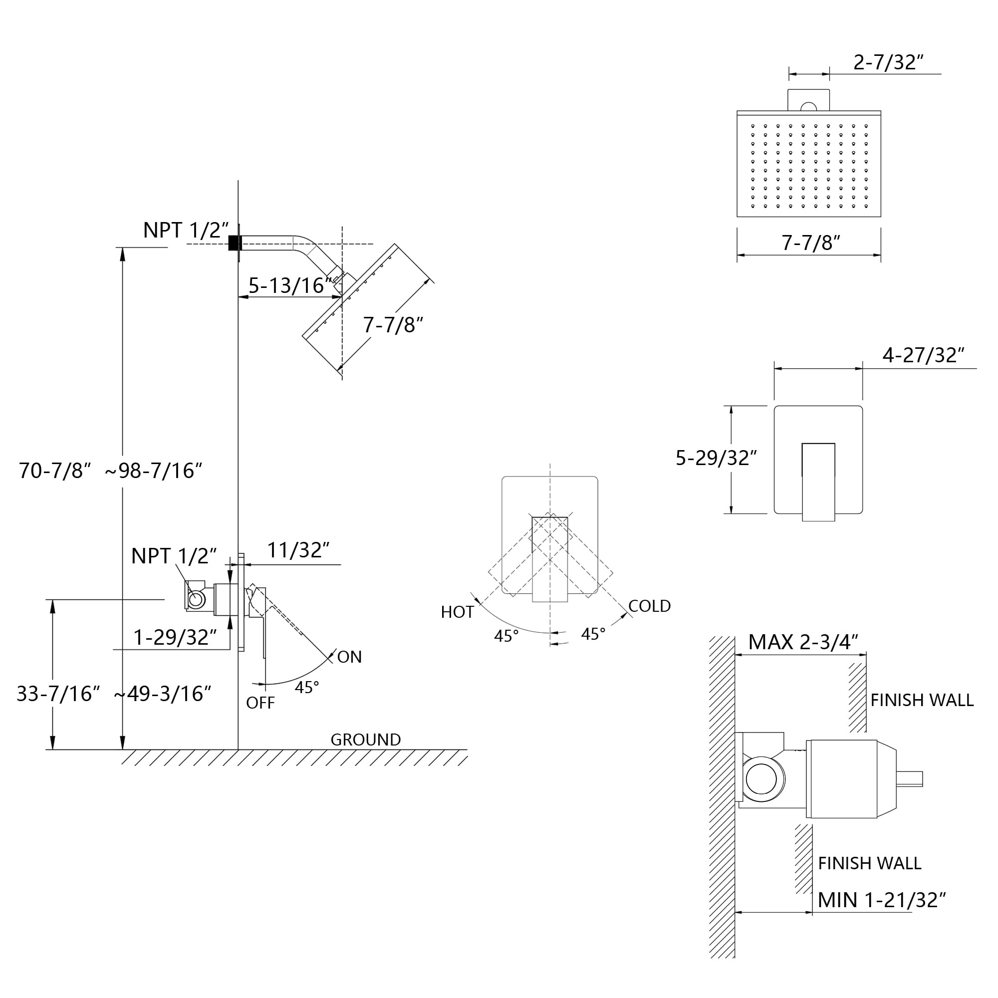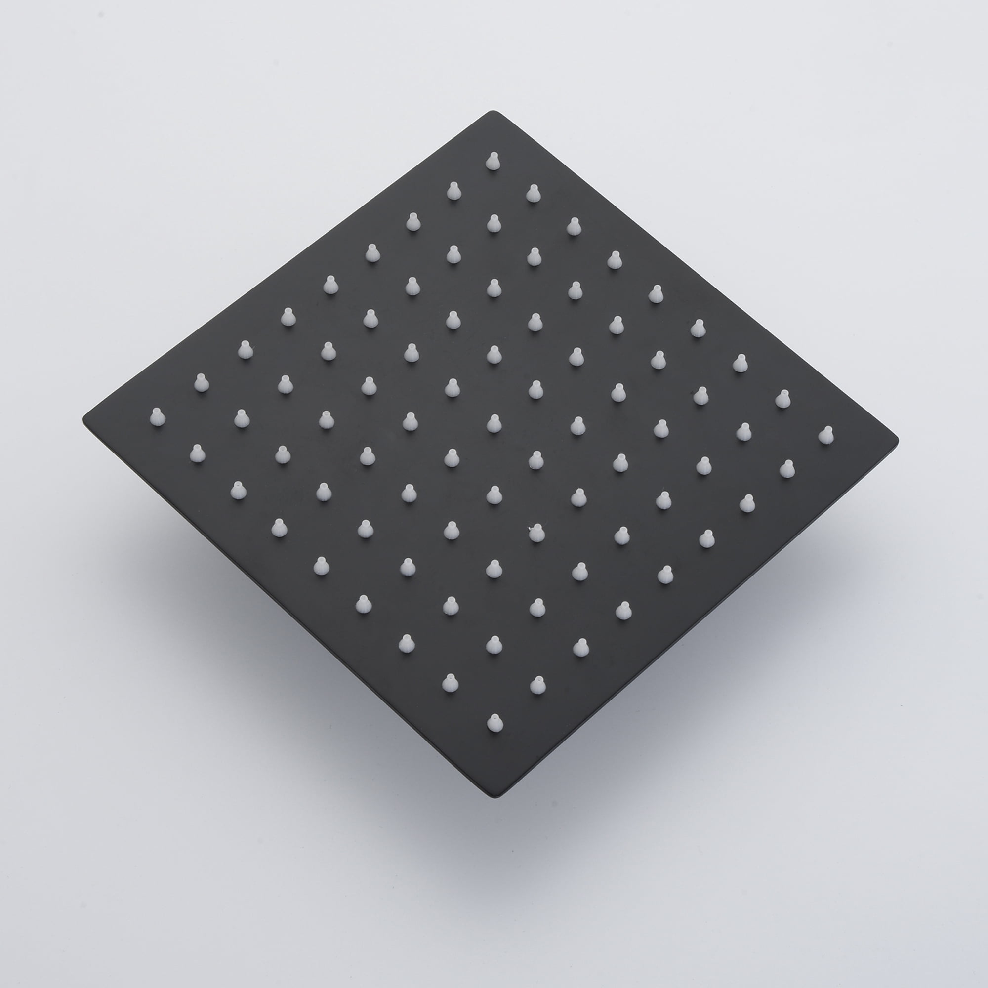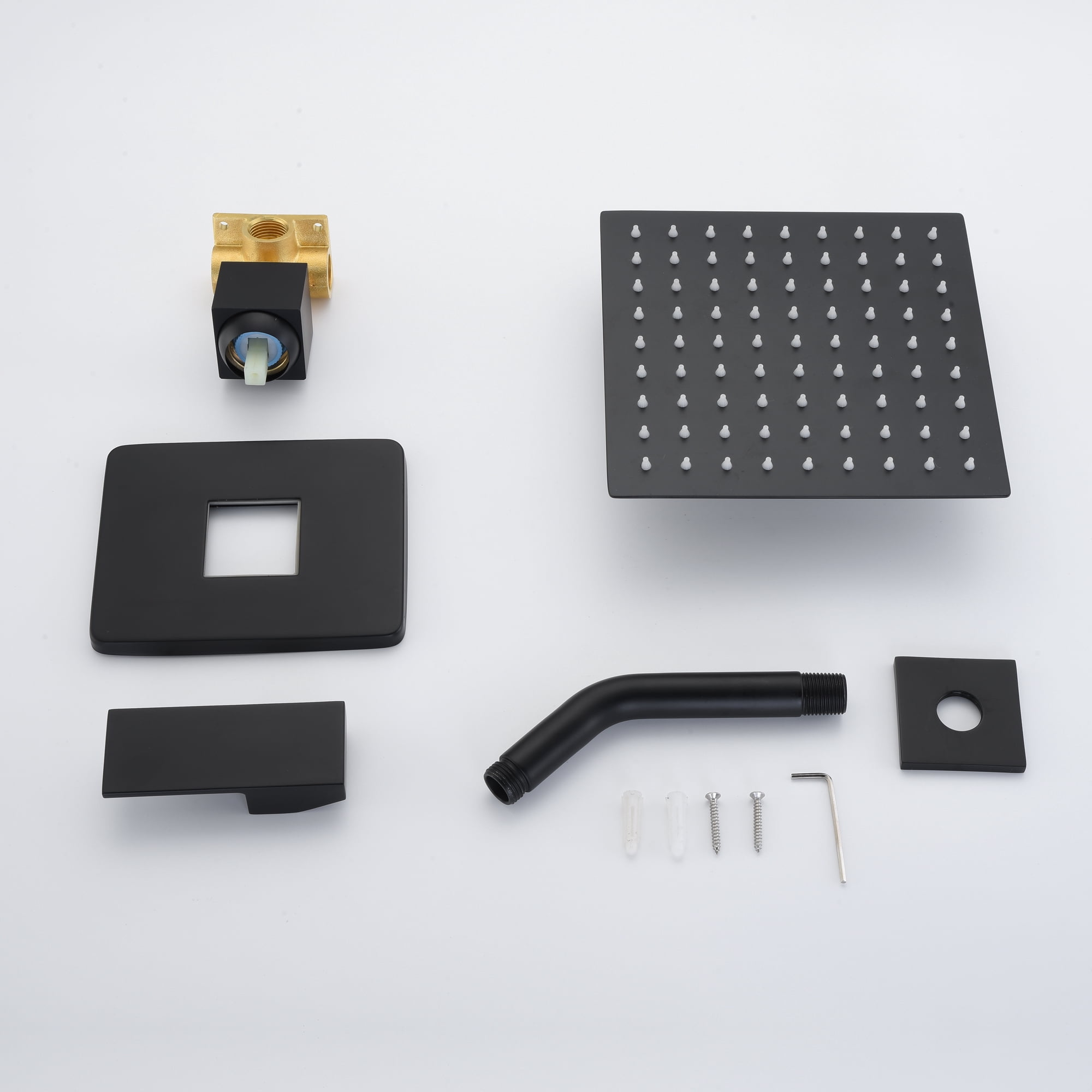 Sumerain, Faucet Showerhead, Matte Black, 8 inch Matte Black Finish: Resists corrosion and tarnishing, ensuring long-lasting use Solid Brass Valve: Provides enhanced durability and reliability Complete Set: Includes rough-in valve, 8″ square rain shower head, shower arm, single handle, escutcheon, and installation accessories Standard 1/2″ Connections: Designed for easy installation with US 1/2 NPT plumbing connections Drip-Free Cartridge: Features a ceramic cartridge tested for 600,000 uses, ensuring a leak-free experience