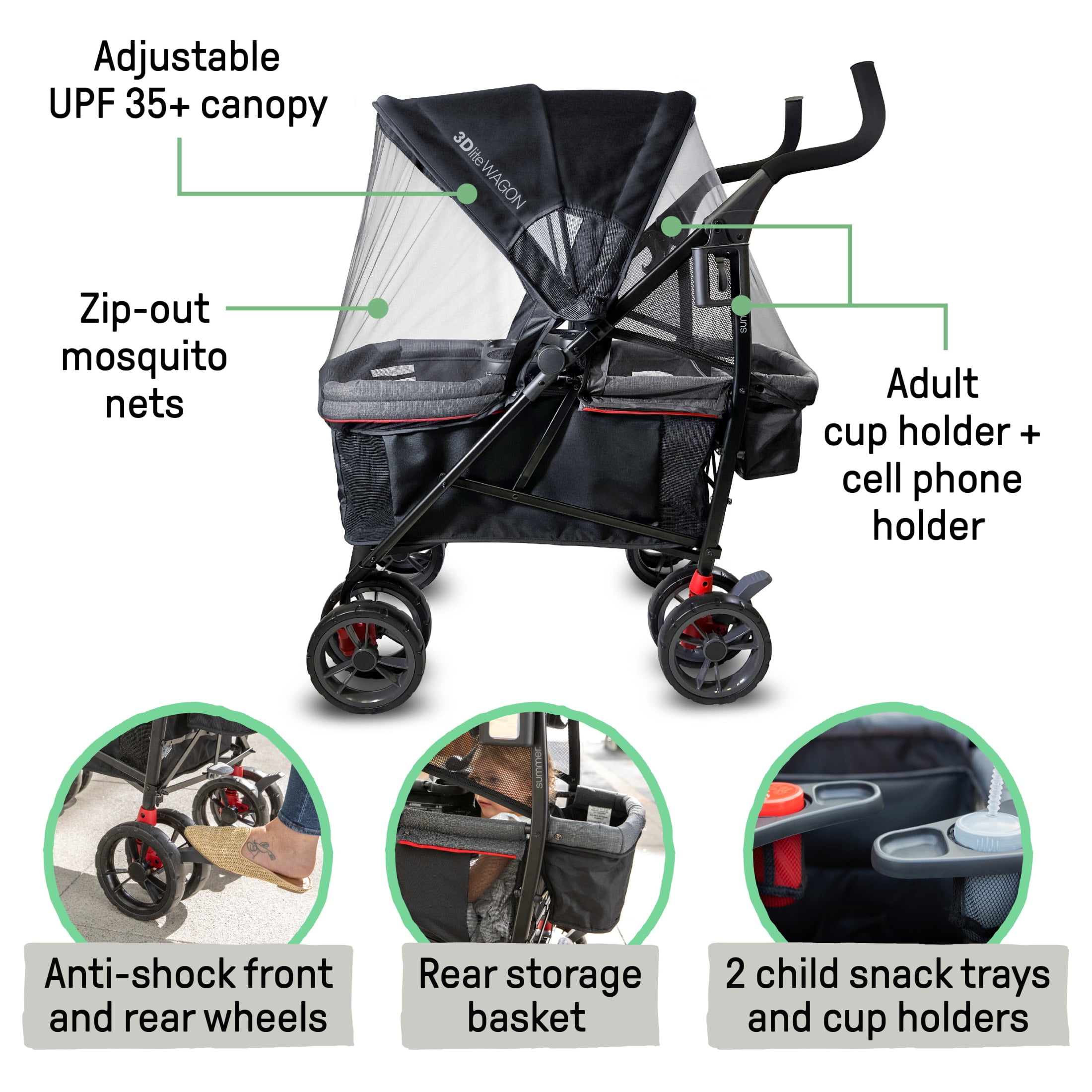 LIGHTWEIGHT & COMPACT: Weighing in at just 24 pounds, the Summer by Ingenuity 3Dlite Wagon has a lightweight, durable steel frame and folds compactly with an auto-lock feature that keeps it contained for travel and storage COMFORT & SAFETY: The seating area of this stroller wagon holds 2 children comfortably with 3-point safety harnesses to keep them safe and secure on-the-go ADDITIONAL FEATURES: A removable and adjustable canopy with zip-out mosquito nets provides UPF 35+ protection from the sun, while the anti-shock front and rear wheels give kiddos a smooth ride in this baby wagon stroller FOR THE PARENTS: Adults will enjoy the added benefit of a cup holder, cell phone holder, and a large, easy-access rear storage basket that can hold up to 10 pounds of gear RECOMMENDED USE: The Summer 3Dlite Wagon stroller is recommended for babies 6 months and up; each seat can accommodate a child up to 50 pounds