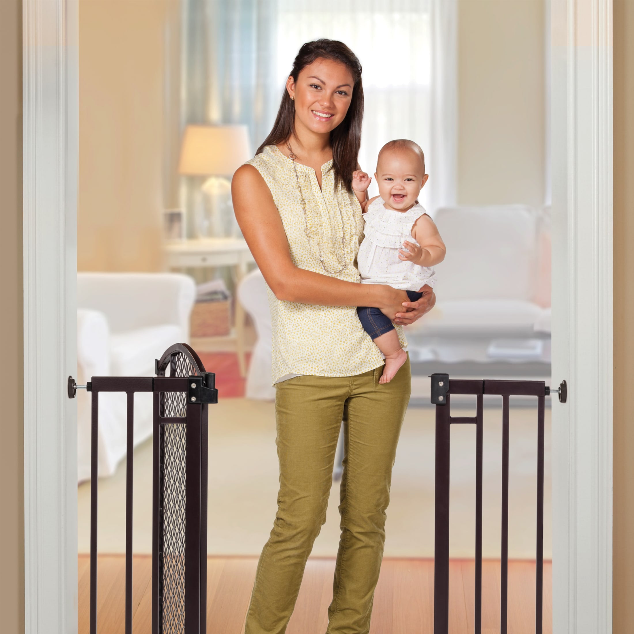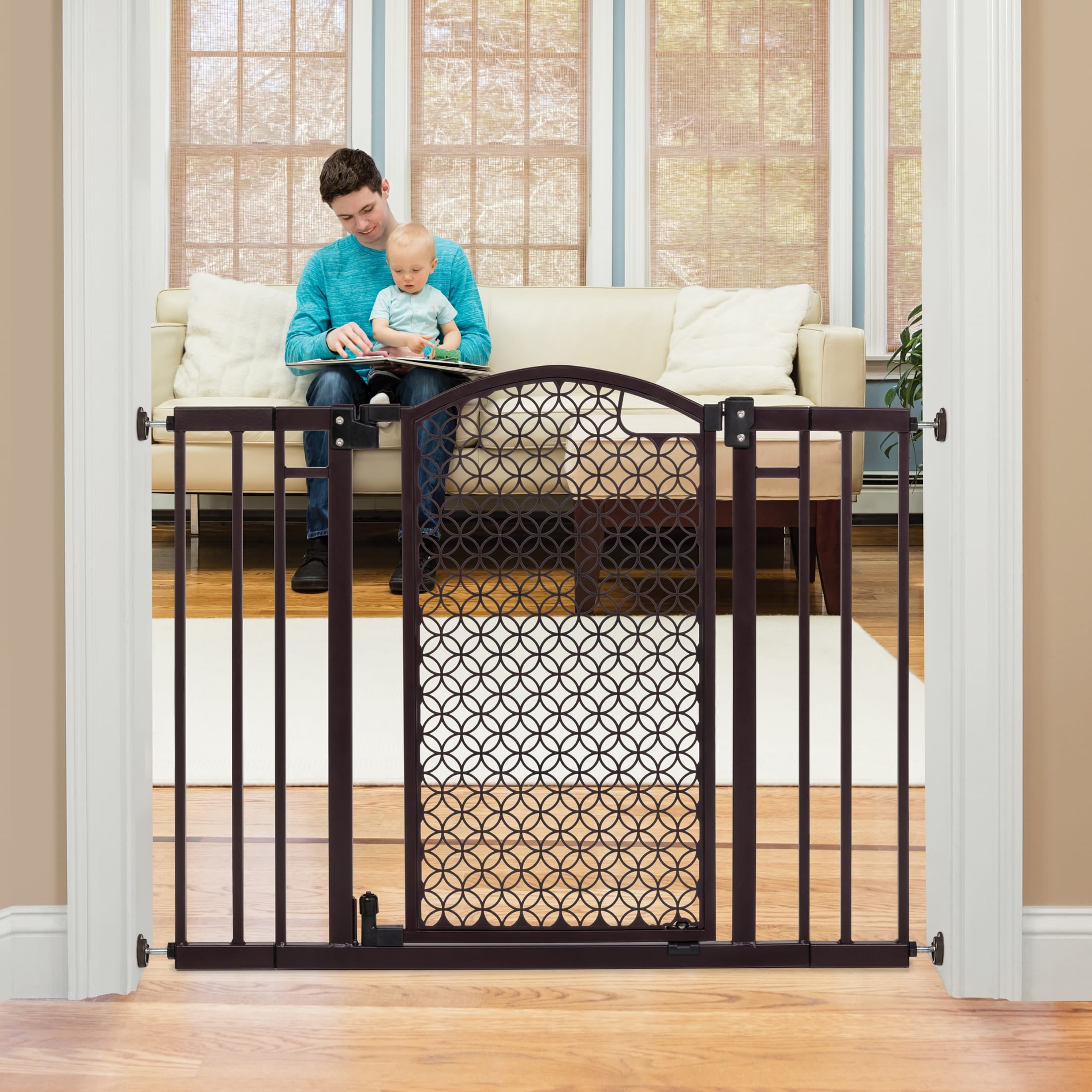 Child proof your home in style with the Summer Infant Modern Home Decorative Walk-Thru Baby Gate. Made of durable steel with a bronze finish and a decorative arched doorway, this baby gate will complement any home décor. Have added peace of mind knowing that this sleek gate accommodates both doorway and stairway installation. Easily install this baby gate on stairways with the included kit, or by using the no drill doorway mount for in-between doorways. Tools are required for hardware mounting. This 30” tall baby gate fits openings up to 28” to 42” wide making it the ideal gate for toddlers and small pets.