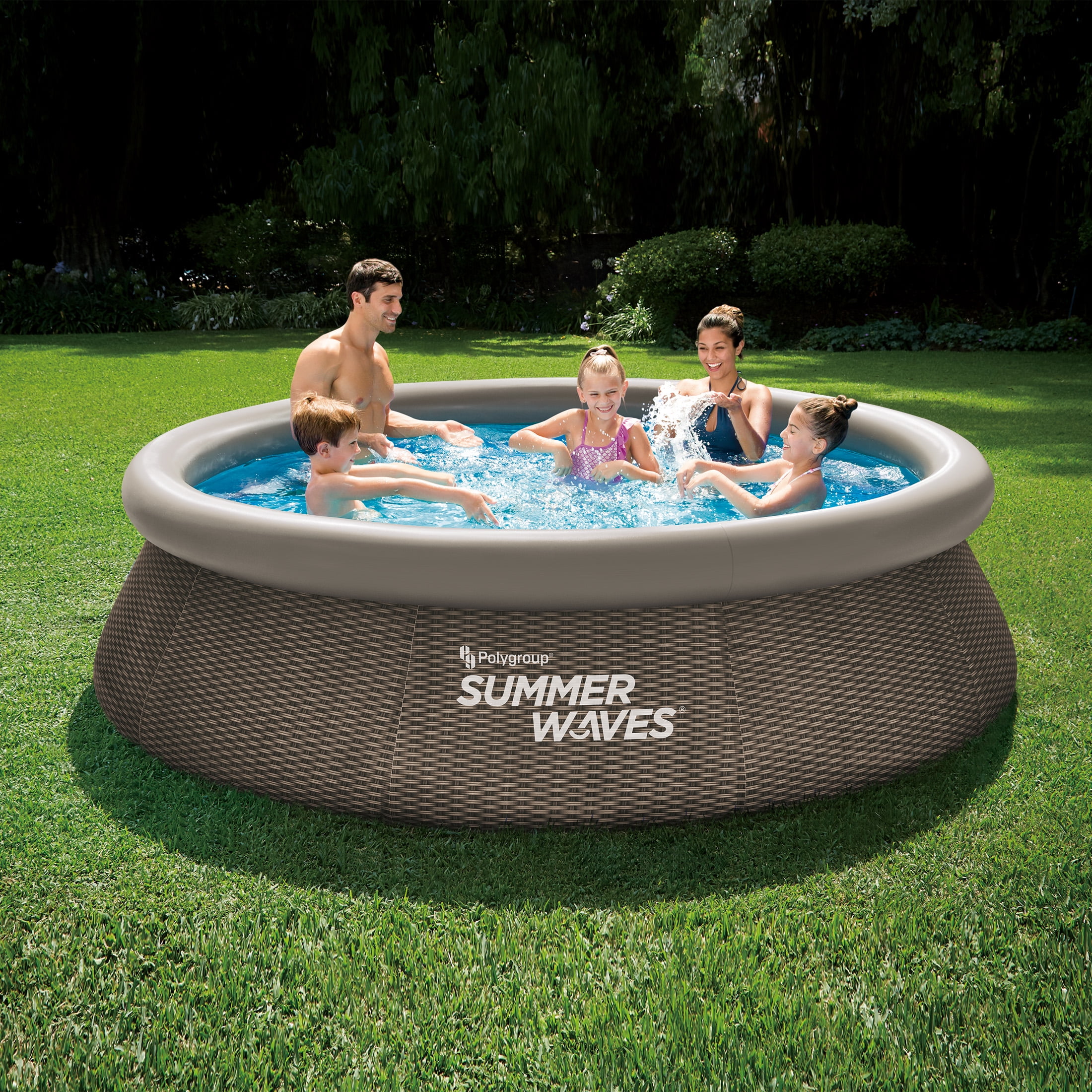 Enjoy cooling off in the Summer Waves 10 ft Round Dark Double Rattan Print Quick Set Above Ground Pool. This above ground pool comes with a powerful filter pump, which is easy to use and will keep the water clean throughout the season. With the Quick Set feature, simply inflate the top ring, and the pool rises as it fills with water. Plus, the stylish Dark Double Rattan exterior print adds extra flair to your backyard. The Summer Waves 10 ft Round Dark Double Rattan Print Quick Set Above Ground Pool comfortably accommodates four to five people, offering plenty of space to swim, play, and float inside with your family and friends.