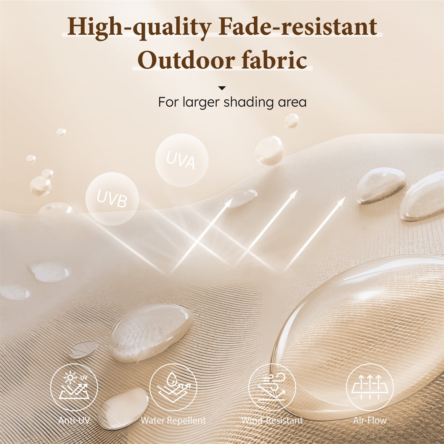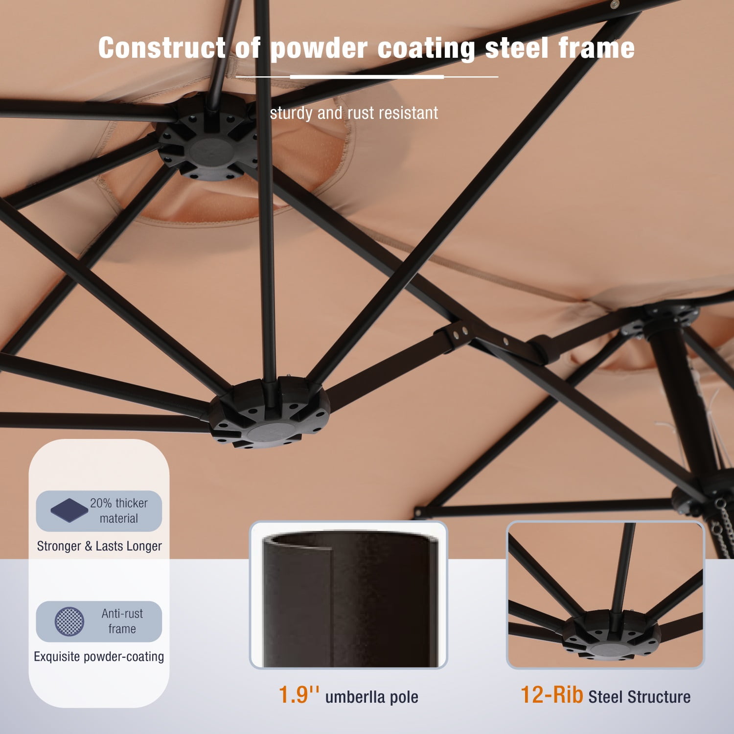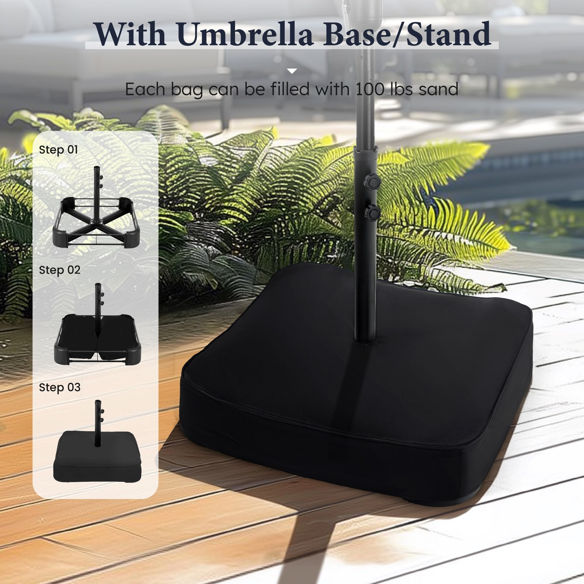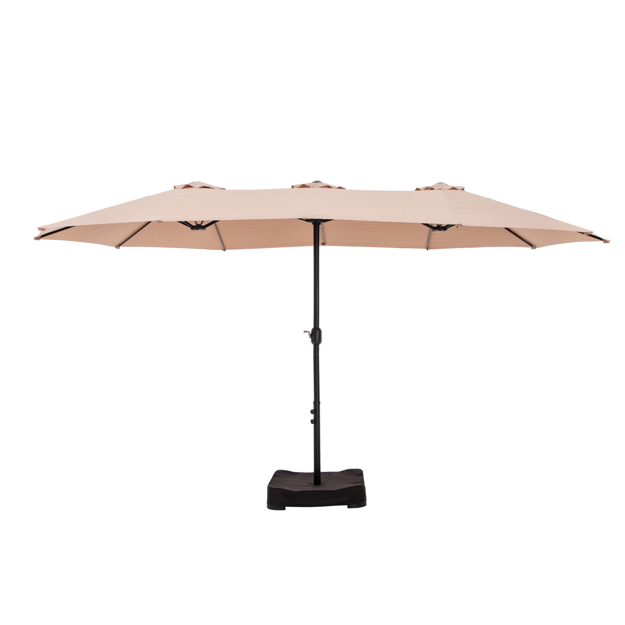 【Includes Base for Stability】This large 15 ft patio umbrella comes with a durable base, eliminating the need for a separate purchase. The stand features a sturdy metal frame and includes two sandbags (sand not included) for enhanced stability. Each sandbag holds up to 100 lbs of sand, ensuring your outdoor umbrella stays securely in place. 【Extra Large Patio Umbrella】The 15 ft double-sided design maximizes your shade, providing double coverage for your outdoor enjoyment. Perfect for your garden, backyard, poolside, or beach outings, this deck umbrella with stand is designed to enhance your leisure time. 【Effortless Crank Handle Operation】Open and close the patio umbrella with ease using the convenient crank handle, allowing for quick adjustments whenever needed. 【UV & Water-Resistant Fabric】 Crafted from high-quality polyester fabric, the canopy is fade-resistant, weather-resistant, and specifically designed for outdoor durability. It provides excellent UV and water protection. Three wind vents on top promote air circulation and enhance stability. 【Robust and Reliable Design】Built with a thick, powder-coated steel frame, this patio umbrella with base resists rust and withstands outdoor conditions. Twelve strong steel ribs provide maximum support, ensuring the double-sided canopy stays securely in place. The innovative safe latch design further enhances stability. 【Comprehensive Package Included】Each package features one 15 ft patio umbrella, a cross base, two 300 D Oxford sandbags, a polyester base cover, and detailed assembly instructions. Please note that sand is required for optimal stability; we recommend filling each sandbag with 100 lbs of sand (200 lbs total). To extend its lifespan, always close and secure the umbrella when not in use, particularly during windy or rainy weather.