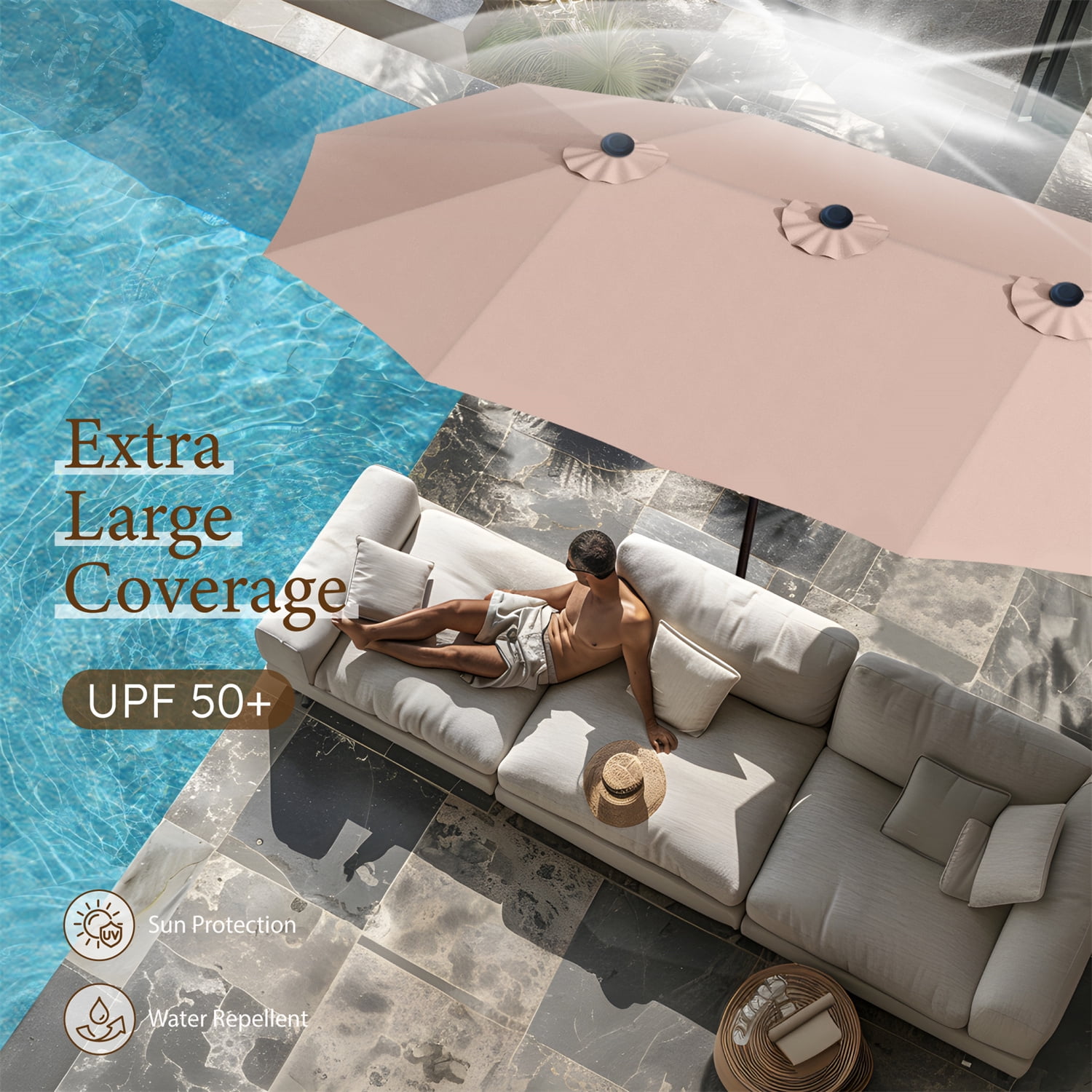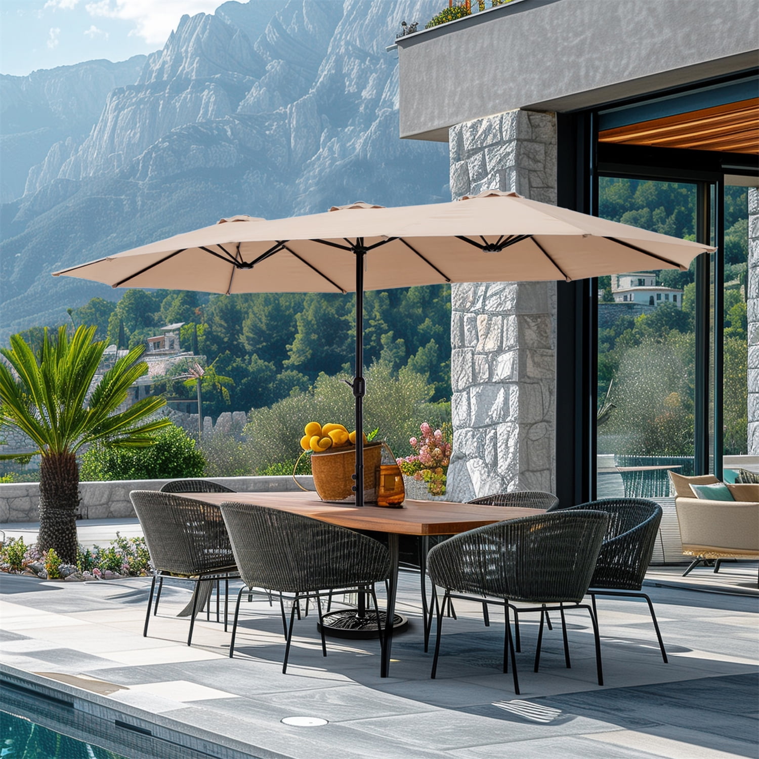 Summit Living 15 ft Large Patio Umbrella with Base (Included) Double-Sided Rectangular Outdoor Deck Umbrella for Outside – Beige