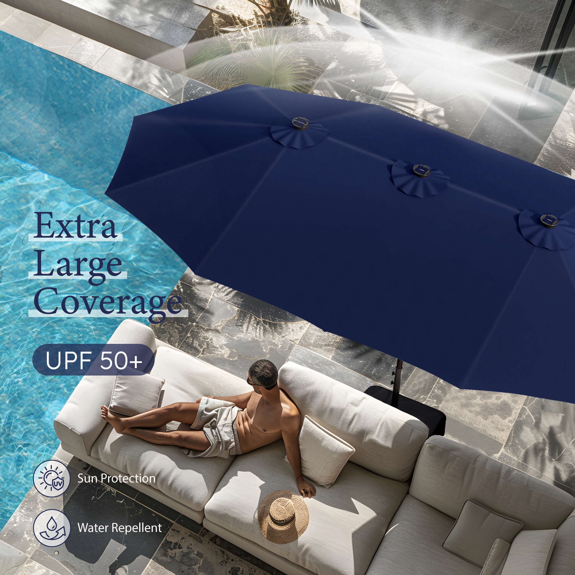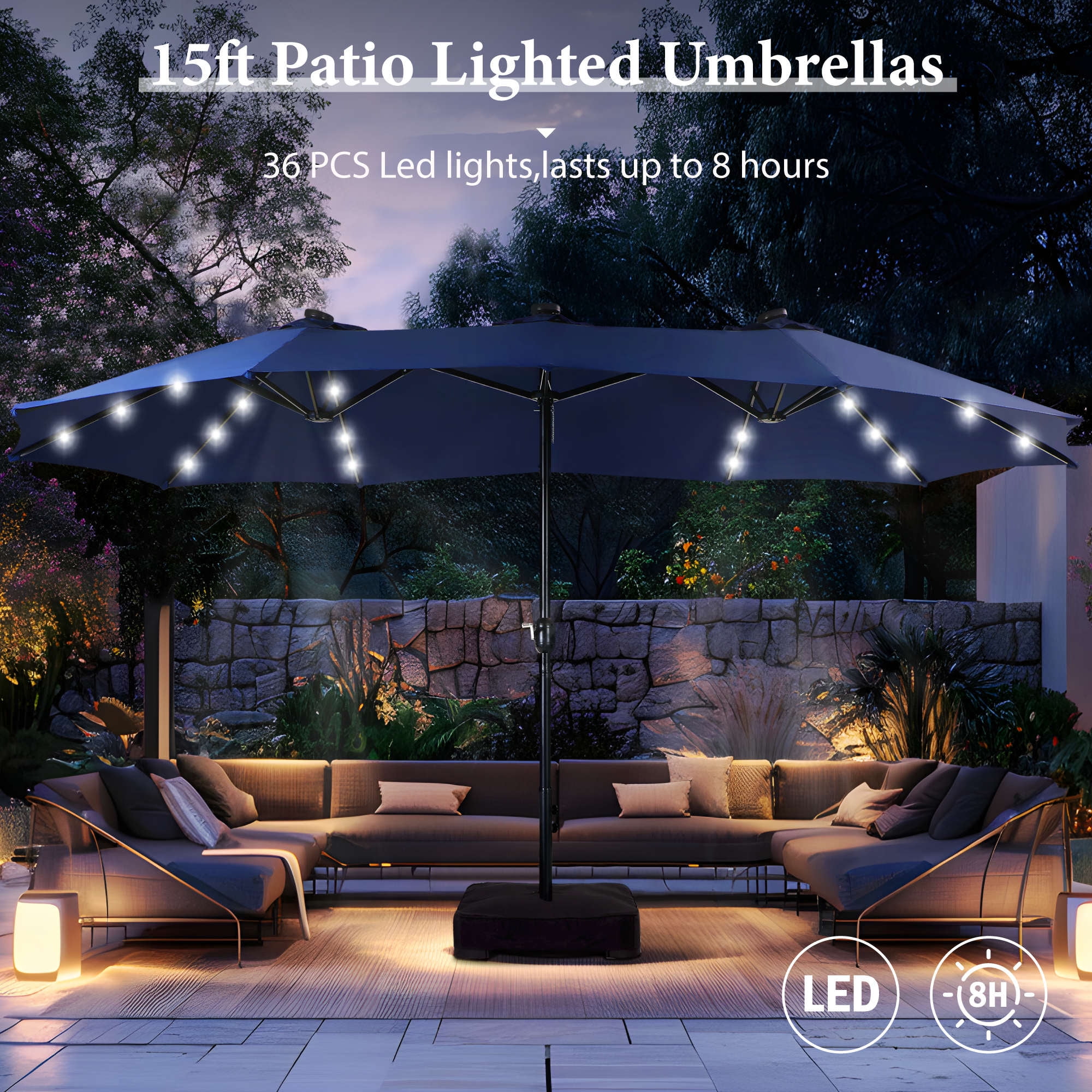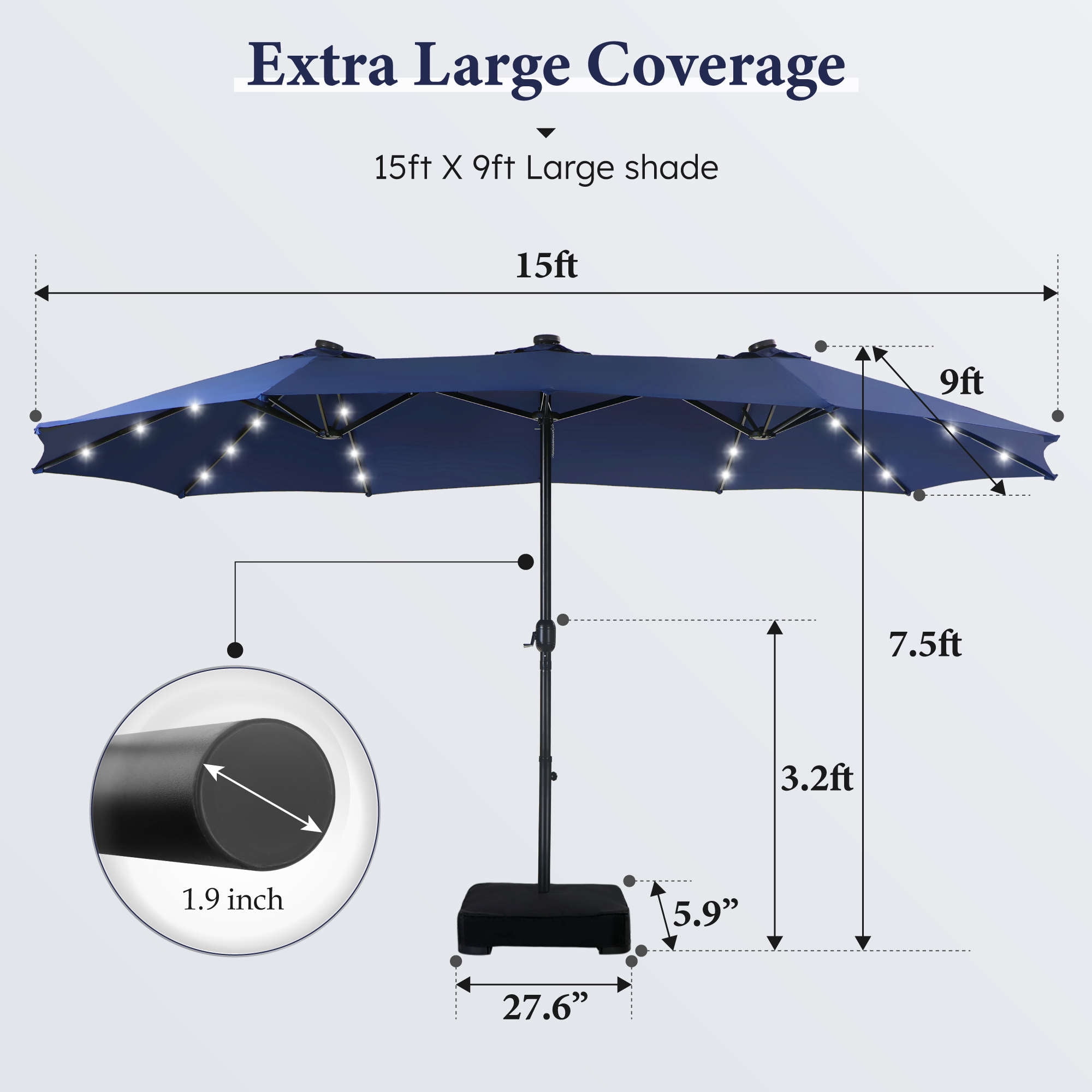 Summit Living 15ft Double-Sided Solar Patio Umbrella with Base Large Outdoor Umbrella with 36 PCs LED Lights, Navy Blue