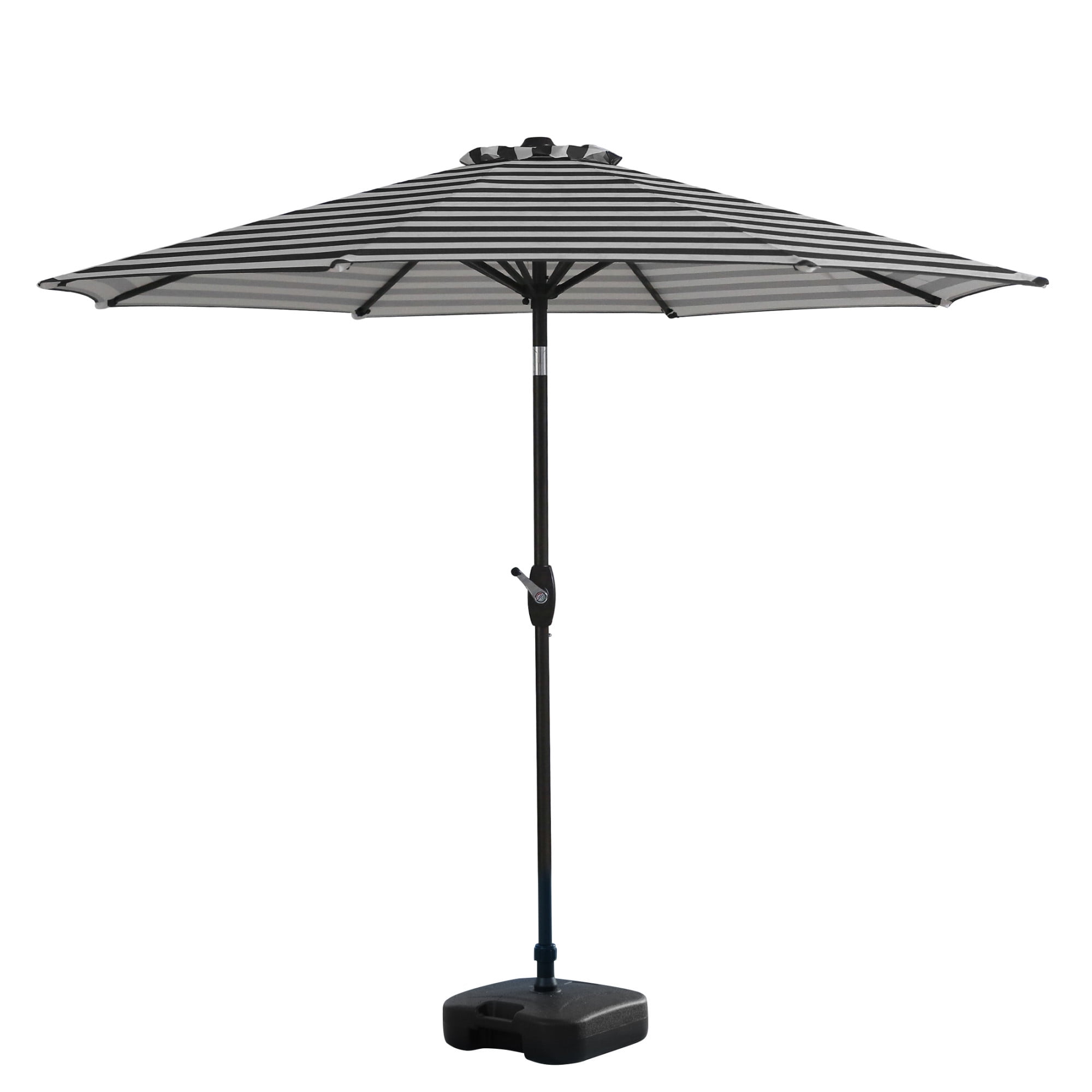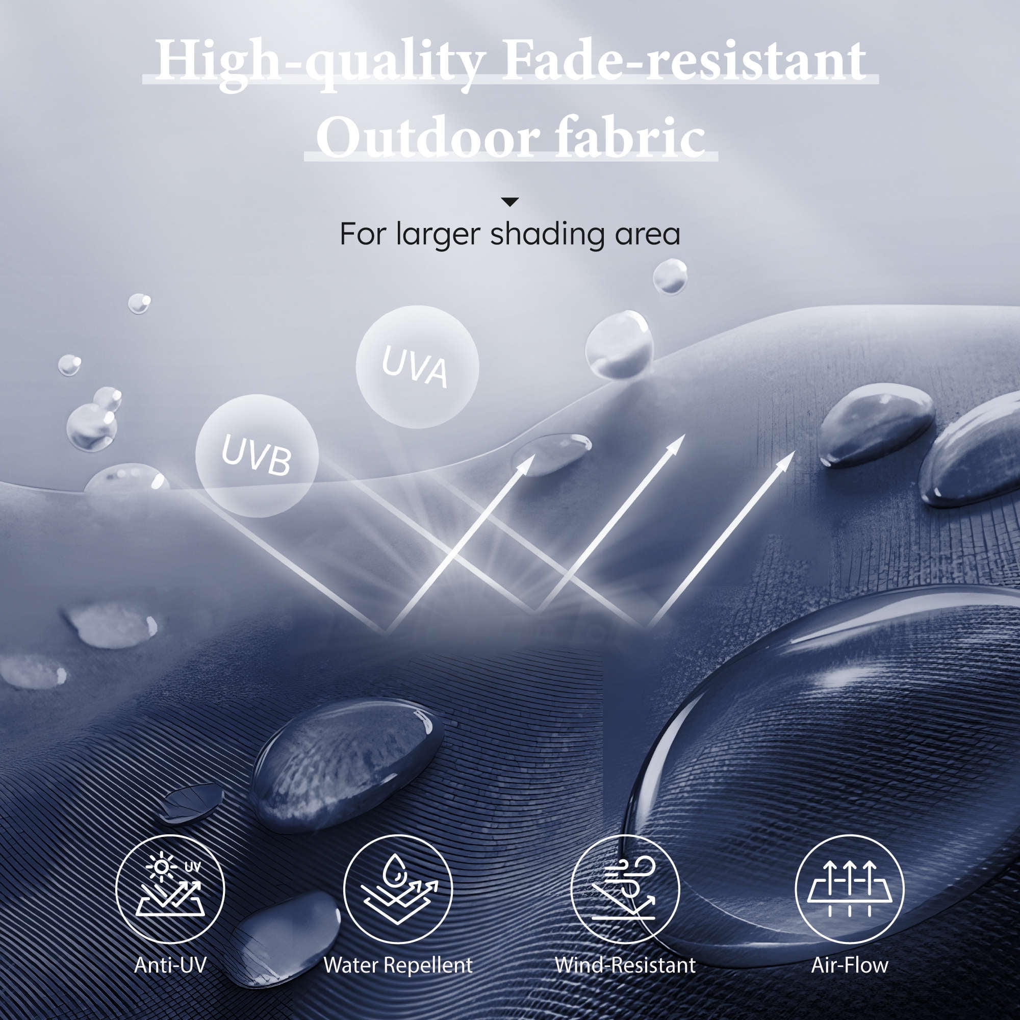 This 15ft large patio umbrella features a built-in solar panel that powers 36 LED lights, adding a touch of elegance and functionality to your outdoor space. It comes with a sturdy umbrella base, polyester bag cover, and 2 sandbags (sand not included), providing both stability and style to your patio or garden area. This large double-sided rectangular patio umbrella offers an extra-large shade area, perfect for both residential and commercial use. Ideal for decks, gardens, backyard patios, or poolside areas. This outdoor umbrella features a simple hand-crank mechanism for effortless operation. Rotate the handle to block sunlight from all directions. After closing, use the long strap to secure the umbrella for compact storage. Made with a strong, fade-resistant, water-resistant, and UV-protected 100% polyester canopy. The powder-coated 1.9″ (48mm) steel pole and 12 rust-proof steel ribs ensure enhanced durability and strength. Three wind vents on top allow for airflow and stability. Includes a durable metal frame umbrella base, 1 polyester bag cover, and 2 sandbags (sand not included). The uniquely designed umbrella base can hold 260 lbs bags of sand. Umbrella base plus two sand bags are included Powder coated 1.9″(48mm) steel pole and 12 rust proof steel ribs provide enhanced durability and strength. This lighted patio umbrella has three LED lights on each rib and totally has 36 LED lights, so as to use day and night. Solid crank handle lift system for smooth and easy opening and closing Double canopy umbrella for wide coverage from the sun 100% polyester canopy is fade resistant, water resistant, and UV protected Foldable design help you save space Suitable for residential and commercial use, ideal for a deck, garden, backyard patio, or poolside area Dimensions: 15(L) x 9(W) x 7.5(H) Feet Fabric: 100% Polyester Fabric Pole: Steel, 1.9″ Dia(48mm) Rib: 5+2+5 rib design, 36 pcs LED lights 1 Year warranty Product type: Patio Umbrella with base; Outdoor umbrella with solar lights; 15FT lighted patio umbrella NOTE: Come with cross base, two oxford bags and one polyester base cover. You need to put some sand when using. Please close the umbrella when you don’t want to use it, especially in windy and rainy days.