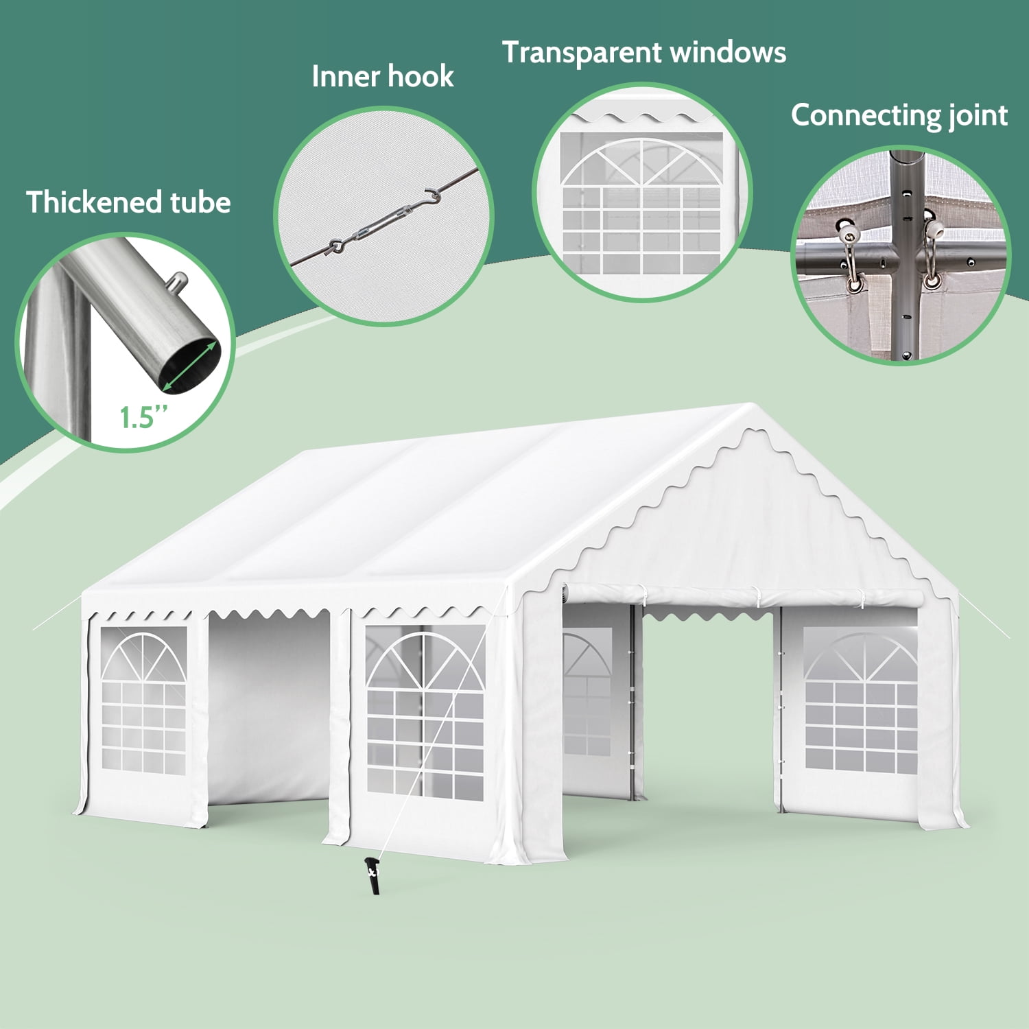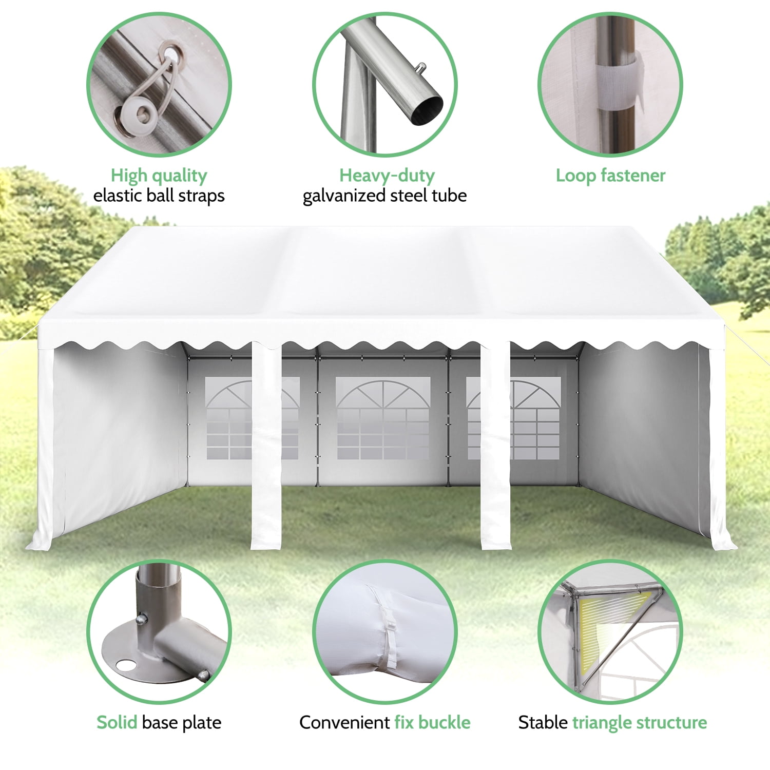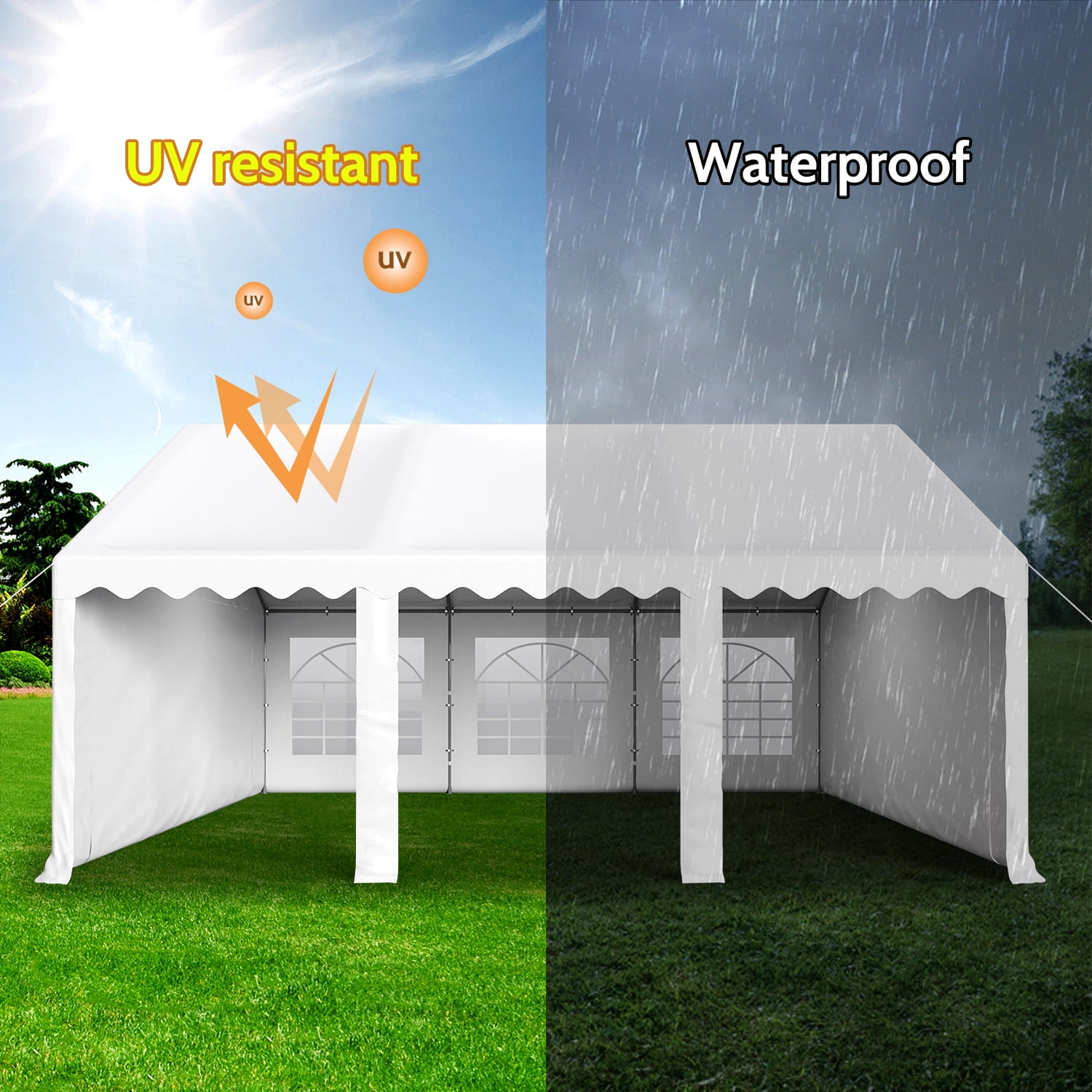 Sturdy Construction: All metal frame ensures that the whole party canopy tent is sturdy and not easy to deform. The supporting galvanized pole resists rust and corrosion. With the help of strong pegs, connector joints and long ropes, the tent becomes more stable after setting up. UV-Proof & Water-Resistant : The canopy cover of the party tent is made of 160 g premium PE fabric which can block 99% sun rays. High-quality waterproof fabric can effectively block the intrusion of rainwater. 6 Removable Sidewalls: Detachable sidewalls not only allow cross ventilation and exhaust on hot days, but also protect against wind when the weather changes suddenly. The Sidewalls of the party event tents features transparent PVC window to enhance the brightness of interior. All of them can be removed or put up easily with fasteners to meet your different needs. Multi-function: Just one party tent can satisfy all kinds of needs, including wedding, birthday, graduation and barbecue parties. What’s more, the canopy can also be a temporary garage for your car, tools, patio furniture. Easy to Set Up: All necessary Hardware and instruction is included, easy and fast to set up. It’s better you have one or two assistants to help when put up the tent. 1 Year Warranty: If you have any questions about our products or assembly, please feel free to contact with our professional service team. We are here to help.