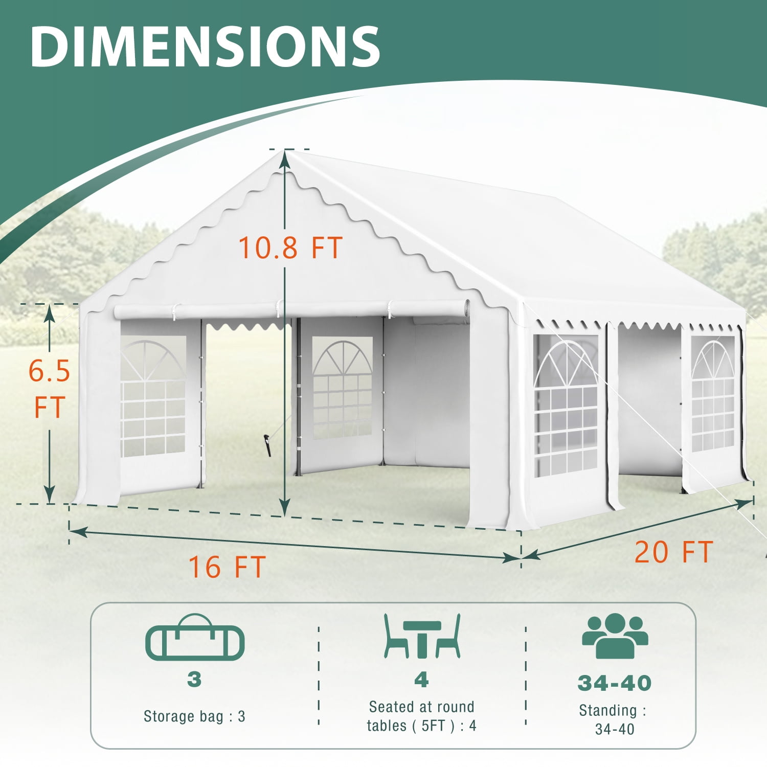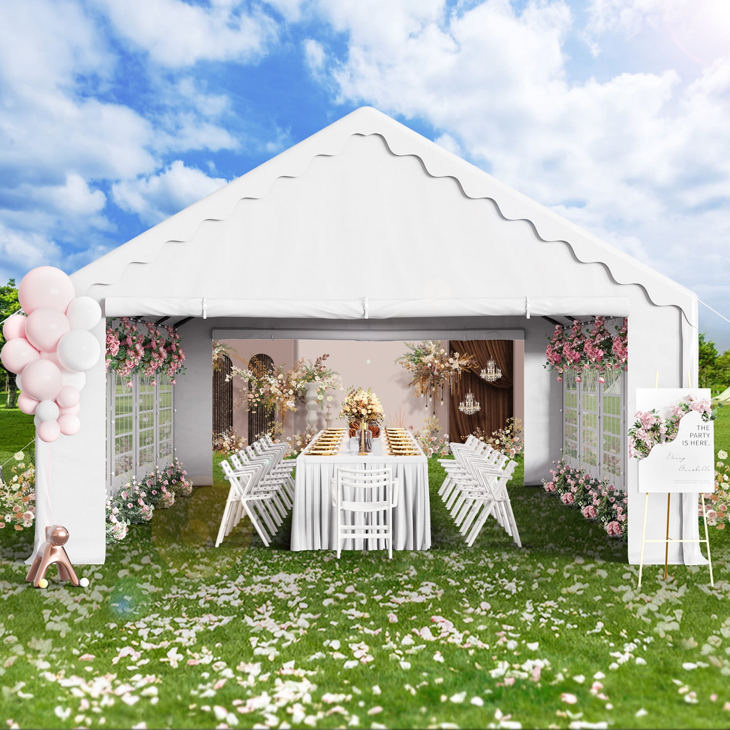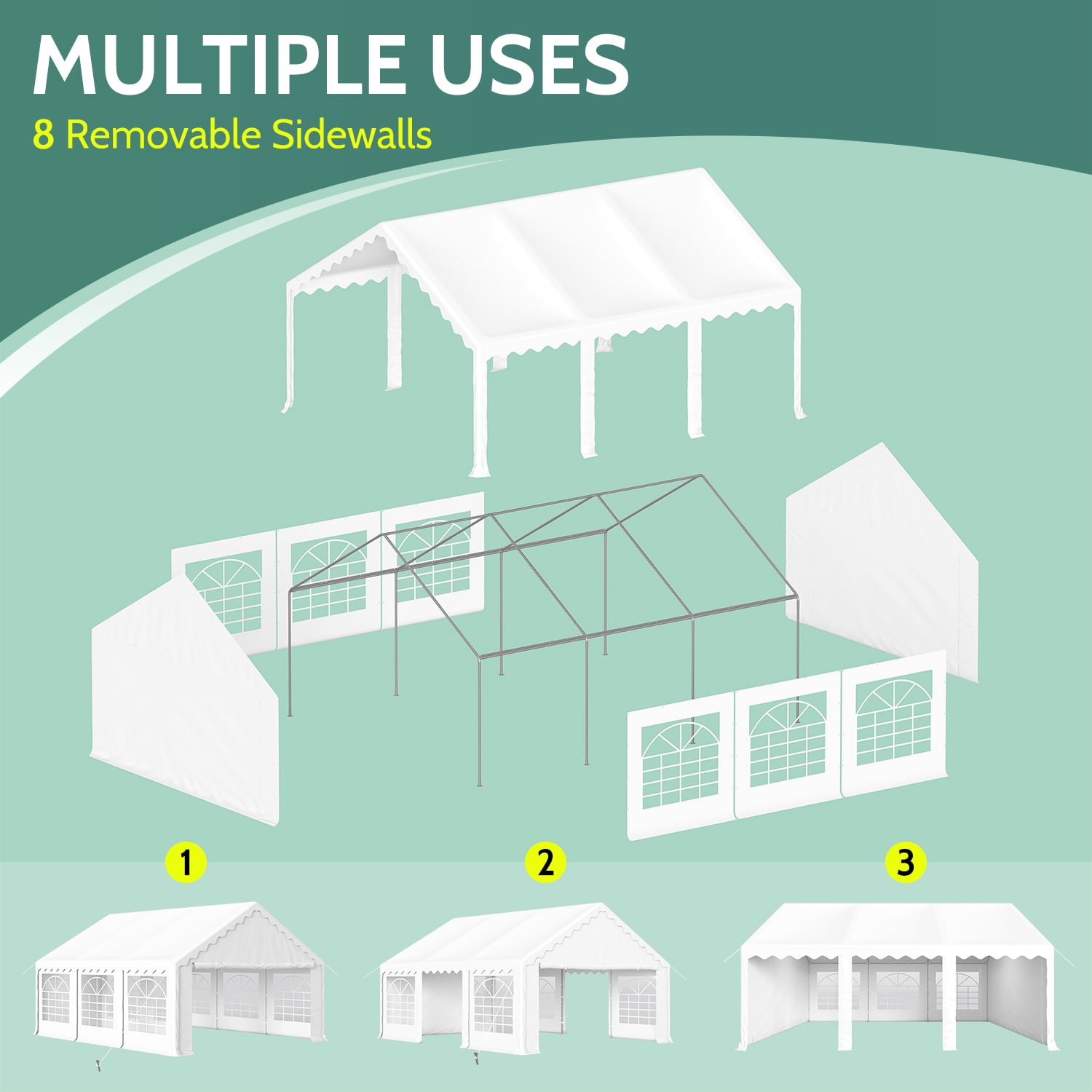 Sturdy Construction: All metal frame ensures that the whole party canopy tent is sturdy and not easy to deform. The supporting galvanized pole resists rust and corrosion. With the help of strong pegs, connector joints and long ropes, the tent becomes more stable after setting up. UV-Proof & Water-Resistant : The canopy cover of the party tent is made of 160 g premium PE fabric which can block 99% sun rays. High-quality waterproof fabric can effectively block the intrusion of rainwater. 6 Removable Sidewalls: Detachable sidewalls not only allow cross ventilation and exhaust on hot days, but also protect against wind when the weather changes suddenly. The Sidewalls of the party event tents features transparent PVC window to enhance the brightness of interior. All of them can be removed or put up easily with fasteners to meet your different needs. Multi-function: Just one party tent can satisfy all kinds of needs, including wedding, birthday, graduation and barbecue parties. What’s more, the canopy can also be a temporary garage for your car, tools, patio furniture. Easy to Set Up: All necessary Hardware and instruction is included, easy and fast to set up. It’s better you have one or two assistants to help when put up the tent. 1 Year Warranty: If you have any questions about our products or assembly, please feel free to contact with our professional service team. We are here to help.