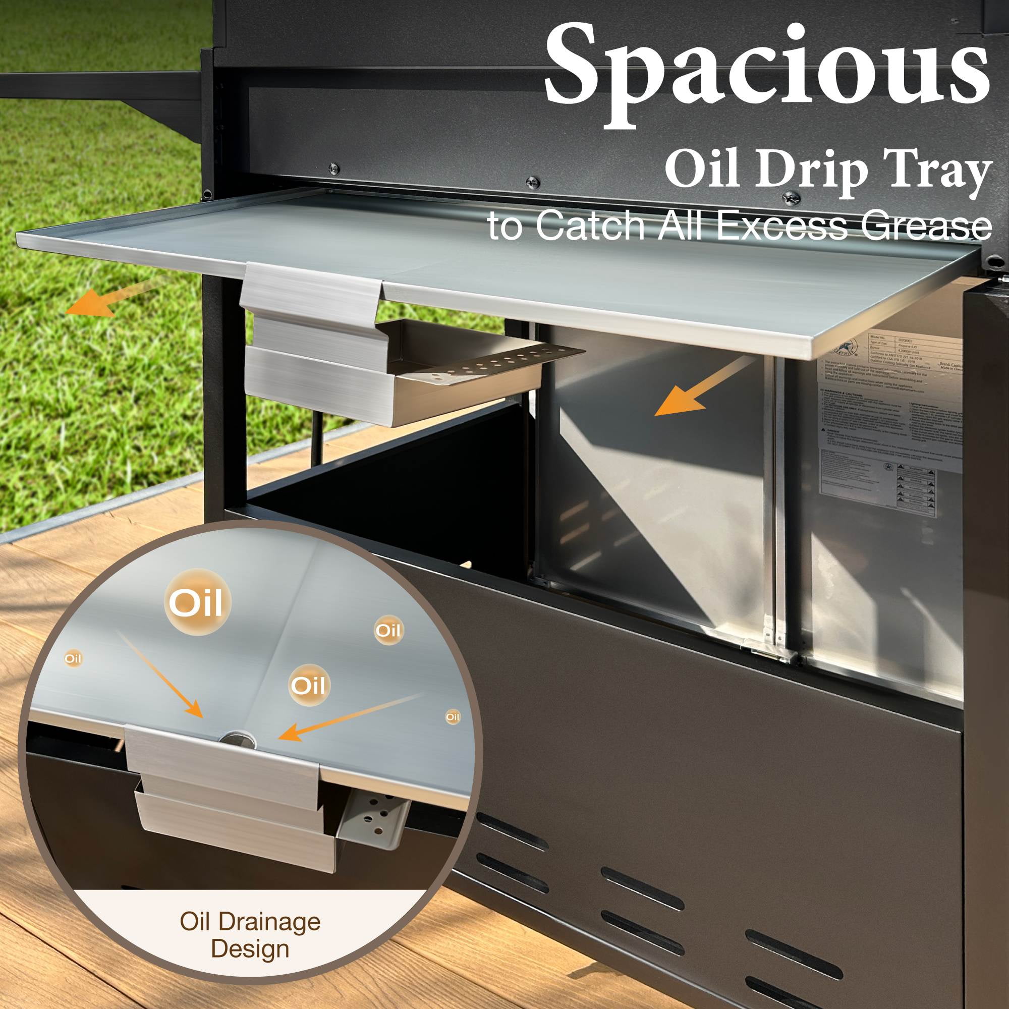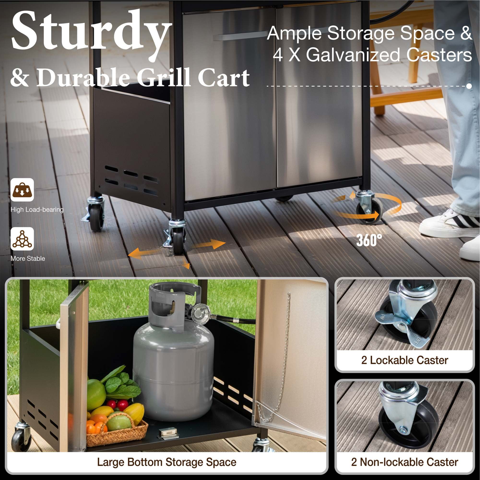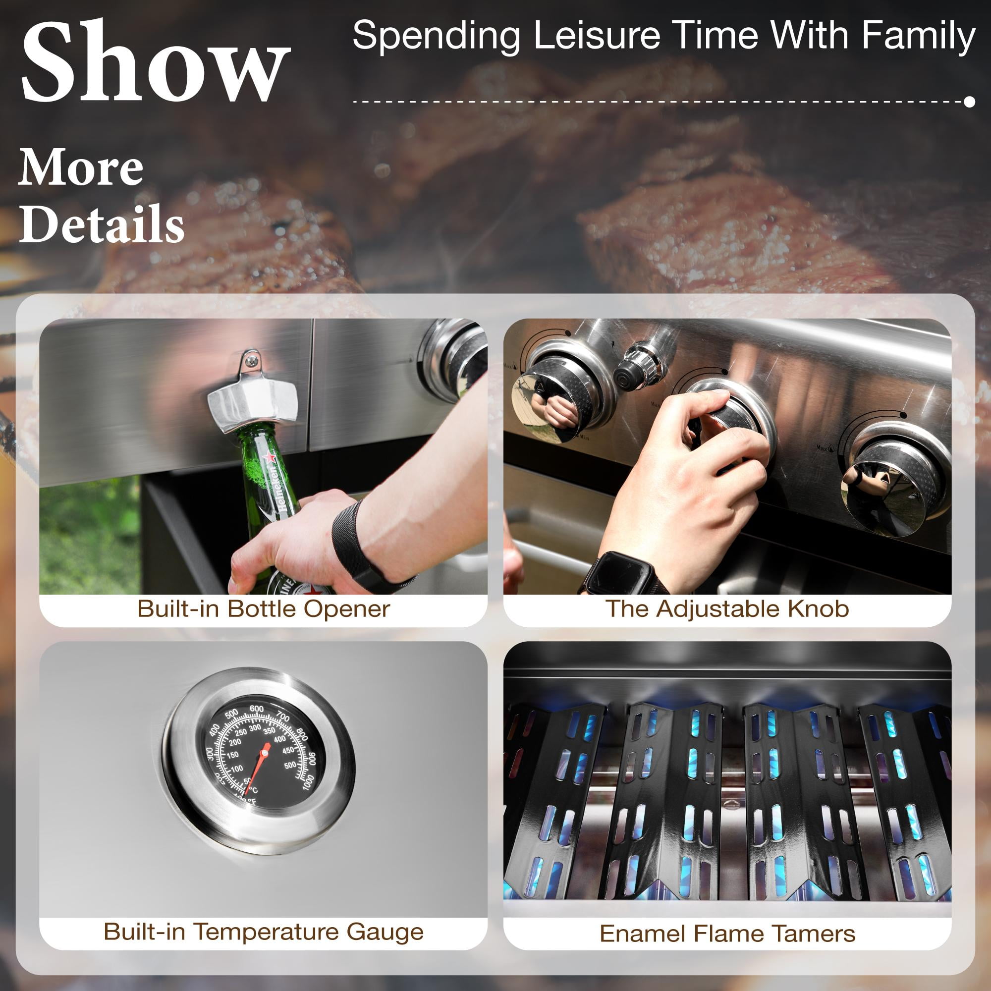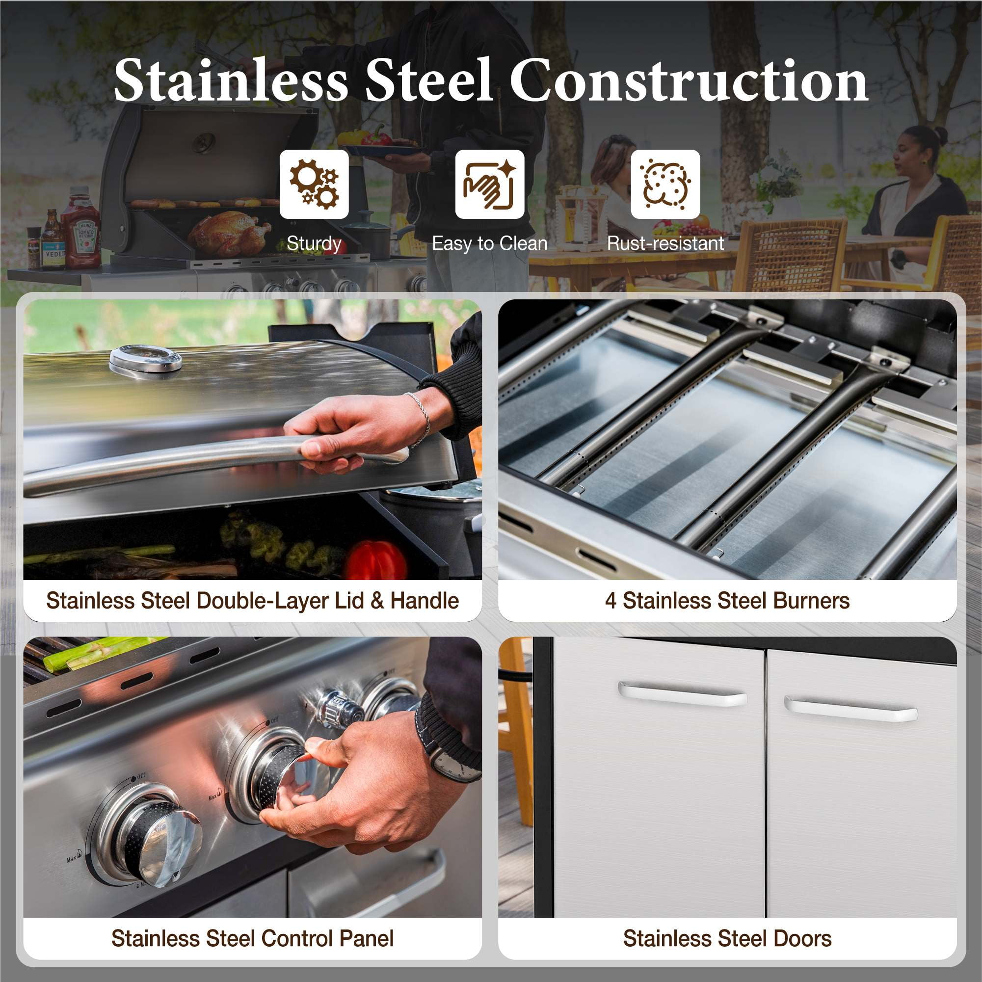 FEATURES: CSA-Certificated gas grill 4 main stainless steel burners, each carries 8000 BTU of cooking power. Includes one 10,000 BTU side burner. Total BTU is 42,000. Push and turn ignition system for easy lighting up of your grill. 397 sq. in. main cooking grates area offers plenty of grilling space. 145 sq. in. warming rack, offering a total of 542 sq. in. BBQ cooking area Durable, easy-to-clean porcelain-enameled cast iron grates provide superior heat retention and distributes even heat, preventing hot or cold spots on grates. The double-layer stainless steel lid ensures that the food is evenly warmed, making it more delicious, and it is easy to wipe and clean. Stainless steel control panel for easy cleaning. Two stainless steel doors open to a cabinet which stores the propane tank and offers sufficient space for all your grilling accessories Includes side burner and side shelf Built-in temperature gauge for ultimate heat control. Built-in bottle opener. 2 Galvanized locking casters & 2 Galvanized non-locking caster for easy fix and transport. Propane gas grill works with standard 20 lb LP tank(not included). Hose & regulator are included. Assembly required with detail instructions. or dial our free service line, 877-606-2818 (PST 09:00AM–18:00PM). We promise to respond to any customer message within 24h. PACKAGE INCLUDED: 1 x Propane Gas grill Hose & regulator Assembly instruction SPECIFICATIONS: Color: Silver Material: stainless steel burner, lid,body + porcelain-enameled cast iron grates, porcelain-enameled flame tamer Dimensions: 21.8″ D x 51″W x 42.3″ H Total BTU: 42,000 Total cooking area: 542 sq. in. Number of main burners: 4 burner With 1 side burner Grill fuel type: propane Weight: 80 lbs Product Type: Propane Gas Grill; BBQ grill